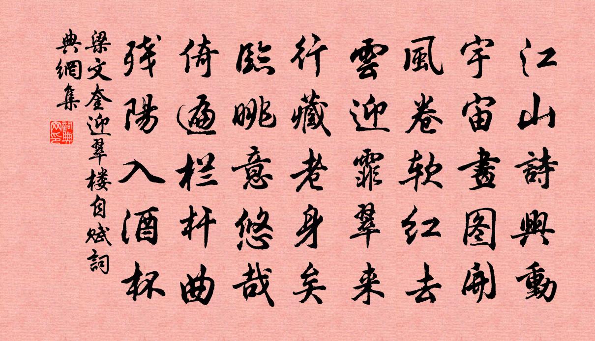 詩詞名句歷史字典書法欣賞書法字典國語詞典說文解字康熙字典古漢語字典標 題 作 者 詩 句 迎翠樓自賦作者:梁文奎 朝代:宋代迎翠樓自賦原文江山詩興動,宇宙畫圖開。風卷軟紅去,雲迎霏翠來。行藏老身矣,臨眺意悠哉。倚遍欄桿曲,殘陽入酒杯。詩詞問答問:迎翠樓自賦的作者是誰?答:梁文奎問:迎翠樓自賦寫於哪個朝代?答:宋代梁文奎迎翠樓自賦書法欣賞迎翠樓自賦書法作品詩詞推薦石橋接待施樞〔宋代〕手筆華嚴梵笈新,更開寶地接迷津。一聲金磬人初靜,月照空山草自春。謝程致道監丞以秋夜直舍二詩相視並簡蘇在廷晁說之〔宋代〕秋風雖雲高,不到建章宮。巨麗發妙思,翰墨爭豪雄。移子范舟興,入此潘廬中。詩成到誰手,繭面絲髮翁。豈不月中桂董天吉〔宋代〕雲外仙花眾莫儔,廣寒宮殿足清幽。根盤天上一輪古,香落人間八月秋。玉兔杵頻金粟碎,素娥佩濕露枝稠。史君上之回曹勛〔宋代〕衛騎絕沙漠,關驅過玉門。雲旗梢月窟,輦道屬烏孫。萬國森環衛,三靈駭駿奔。聲容同日月,威德被乾坤。巡狩再至界圍岩水簾遂宿岩下(是年出刺柳州五月復經此)柳宗元〔唐代〕發春念長違,中夏欣再睹。是時植物秀,杳若臨懸圃。歊陽訝垂冰,白日驚雷雨。笙簧潭際起,鸛鶴雲間舞。古苔題許尚書石刻二首姜特立〔宋代〕烏絲玉軸陀尼表,鬥草搴花錦不如。不是向來元佑腳,唐人文字晉人書。塞上曲常建〔唐代〕翩翩雲中使,來問太原卒。百戰苦不歸,刀頭怨明月。塞雲隨陣落,寒日傍(旁)城沒。城下有寡妻,哀哀哭枯骨同曹泰宇賦寶化鳳花二首戴表元〔宋代〕鳳後不出幾何年,莫怪山花惜杜鵑。一樣春風好毛羽,回頭曾管蜀山川。新安錢學士以近詩一軸見貺輒成短言用敘單悃梅堯臣〔宋代〕早事太尉府,謬以才見論。身作邑中吏,日陪丞相尊。嵩山雲外寺,伊水渡頭來。泉味入香茗,松色開清樽。題詩句陳亞〔宋代〕吏辭如賀日,民送似迎時。釣台二首陳必敬〔宋代〕公為名利隱,我為名利來。羞見先生面,黃昏過釣台。上太師公相生辰詩十首佚名〔宋代〕勤勞王室見周公,報賜宜膺曲阜封。兆見維秦符佐命,祥開有魏慶疇庸。申加井賦恩方治,倍衍圭腴賞正濃。一德次韻謝尉公靖同游北園五首韓維〔宋代〕鑿堤要水近,依竹任逕斜。殘葉時委地,晚筍猶穿沙。不知人間世,況論空中花。卻思城市喧,閣閣鳴群蛙。潤州錢祠部新建寶墨亭蘇頌〔宋代〕王蕭書跡衛公詩,流落江南世少知。古寺購尋遺刻在,新亭龕置斷珉奇。模傳遂比黃庭字,埋沒非同石鼓碑。墨藪酬王立之二首陳師道〔宋代〕頓有亭前玉色梅,情知不肯破寒開。似憐憔悴兩公客,獨倚東風遣信來。滿江紅(癸亥九日)丘崈〔宋代〕平楚蒼然,煙靄外、飛鴻冥滅。身老矣、登臨感慨,幾時當徹。痛飲從教吹帽落,悲歌莫擊壺邊缺。算人生、任運即事李流謙〔宋代〕愛春未得一錢酬,獨倚東風搔白頭。花影入簾情苒苒,竹風挨枕夢悠悠。黃鸝欲下無誰語,碧草相看始欲愁。老大寄復齋陳寺丞二首戴復古〔宋代〕長憶西灣擊小舟,野人曾伴使君游。夜浮星子邀明月,雨對廬君說好秋。坐擁紅妝磨寶硯,醉歌赤壁寫銀鉤。當時留別昌國五首王阮〔宋代〕全家雖脫海波危,舊治無人詠十奇。孤奉明恩顏似甲,卻嗔兒女笑嘻嘻。一字至十字成章二首詠石文同〔宋代〕石,石,陰黑,陽白。岸胚胎,山骨骼。天地鎔鑄,鬼神刻畫。鯤鯢張怒眼,虎兕交斗額。敲如溫玉聲清,洗似精名句推薦輕肌弱骨散幽葩,更將金蕊泛流霞。蘇軾《趙昌寒菊》 十四萬人齊解甲,更無一個是男兒!花蕊夫人《述國亡詩》 中年親友難別,絲竹緩離愁。蘇軾《水調歌頭·安石在東海》 相逢意氣為君飲,系馬高樓垂柳邊。王維《少年行四首》 料有牽情處,忍思量、耳邊曾道。時彥《青門飲·寄寵人》 淡盪春光寒食天。玉爐沉水裊殘煙。夢回山枕隱花鈿。李清照《浣溪沙·淡盪春光寒食天》 關山多雨雪,風水損毛衣。李遠《詠雁》 寒食不多時,牡丹初賣。晁沖之《感皇恩·寒食不多時》 柳下繫舟猶未穩,能幾日、又中秋。劉過《唐多令·蘆葉滿汀洲》 猶余雪霜態,未肯十分紅。王十朋《紅梅》