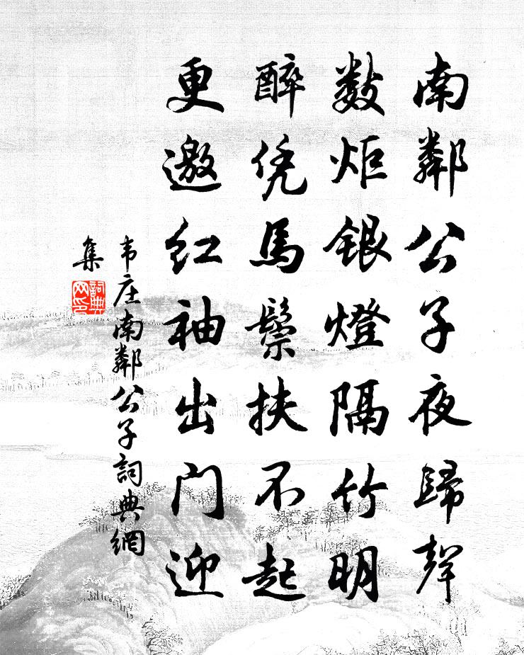 南鄰公子夜歸聲,數炬銀燈隔竹明。醉憑馬鬃扶不起,更邀紅袖出門迎。