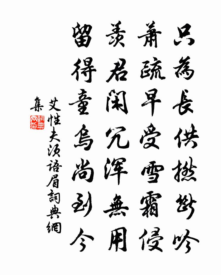 詩詞名句歷史字典書法欣賞書法字典國語詞典說文解字康熙字典古漢語字典標 題 作 者 詩 句 須語眉作者:艾性夫 朝代:宋代須語眉原文只為長供撚斷吟,蕭疏早受雪霜侵。羨君閒冗渾無用,留得童烏尚到今。詩詞問答問:須語眉的作者是誰?答:艾性夫問:須語眉寫於哪個朝代?答:宋代問:須語眉是什麼體裁?答:七絕艾性夫須語眉書法欣賞須語眉書法作品詩詞推薦寄題清溪寺(在峽州,鬼谷子之故居)蘇軾〔宋代〕口舌安足恃,韓非死說難。自知不可用,鬼谷乃真奸。遺書今未亡,小數不足觀。秦儀固新學,見利不知患。嗟時頌古十三首釋德光〔宋代〕師之一字見還難,直下應須透祖關。縱使祖關開正眼,前頭更有萬重山。嚴陵台汪遵〔唐代〕一釣淒涼在杳冥,故人飛詔入山扃。終將寵辱輕軒冕,高臥五云為客星。登敬亭山南望懷古贈竇主簿李白〔唐代〕敬亭一回首,目盡天南端。仙者五六人,常聞此游盤。溪流琴高水,石聳 * 壇。白龍降陵陽,黃鶴呼子安。羽化和左司張員外自洛使入京中路先赴長安…韋侍御等諸公孫逖〔唐代〕忽睹雲間數雁回,更逢山上正花開。河邊淑氣迎芳草,林下輕風待落梅。秋憲府中高唱入,春卿署里和歌來。共言問訊家林蠟梅張鎡〔宋代〕蠟梅吾甚愛,園種未能多。旋去東南竹,新添二十窠。離家俄半月,放雷想盈柯。前日丁寧句,花神記得麽。三月廿七日偶作簡仲鹹王禹偁〔宋代〕一未量移一轉勛,貂冠羊胃總非真。韶光只有兩三日,浮世稀逢七十人。掅杏勸君重酌酒,牡丹邀我且尋春。請看失調名沈唐〔宋代〕不是這,下輩無禮,都緣是我,自家遭逢。九日和韓魏公蘇洵〔宋代〕晚歲登門最不才,蕭蕭華發映金罍。不堪丞相延東閣,閒伴諸儒老曲台。佳節久從愁里過,壯心偶傍醉中來。暮歸代壽圓嶠顏文昌胡仲弓〔宋代〕長命新詩恰剪裁,瓣香南望祝蓬萊。千齡椿算從天與,九節蒲根著地栽。范不待年甘引去,文雖告老召還來。肉芝後後閣端午貼子詞五首真德秀〔宋代〕榴紫槿映池一台,玳席還當水殿開。借問天顏何大喜,皇儲親奉萬年杯。和鍾西耘庶常德祥律門感懷詩黃遵憲〔清代〕東西南北走舟車,虎穴驚看插邑閭。七萬里戎來集此,五千年史未聞諸。考工述物搜奇字,鬼谷尊師發秘書。教訓謝東粹包宏父三首癸卯夏戴復古〔宋代〕詩文雖兩途,理義歸乎一。鳳騷凡幾變,晚唐諸子出。本朝師古學,六經為世用。諸公相羽翼,文章還正統。晦翁沁園春(和槐城自壽)劉辰翁〔宋代〕六十一翁,垂銀帶魚,插四角輪。把百個今朝,重排花甲,十年前事,似臼齏辛。骰選功名,酒中富貴,管取當筵曉程陳昌時〔宋代〕男兒腰下帶芙蓉,羞睹秦官老徑松。羊胛日生寒戍鼓,馬蹄風起夜樓鍾。菊花憔悴三分雨,楓葉青紅一半冬。只為和江陵闕乾風雨問訊虛舟韻二首李曾伯〔宋代〕無人載酒到聯轡,有客攜琴午扣扉。卻羨渚宮魚為樂,菰蒲深處日相依。謝潘端叔惠紅梅樓鑰〔宋代〕少陵年後詠花開,未見煙脂一抹腮。可惜當時詩興動,止因東閣看官梅。河滿子 湖州作,寄益守馮當世蘇軾〔宋代〕見說岷峨悽愴,旋聞江漢澄清。但覺秋來歸夢好,西南自有長城。東府三人最少,西山八國初平。莫負花溪縱賞,贈常侍御李白〔唐代〕安石在東山,無心濟天下。一起振橫流,功成復瀟灑。大賢有卷舒,季葉輕風雅。匡復屬何人,君為知音者。傳聞軍中樂二首王鎡〔宋代〕珊瑚提榼紫金杯,氈帳藏春暖不開。馬上嬌娃花滿笠,隨軍出看打球回。名句推薦風吹仙袂飄颻舉,猶似霓裳羽衣舞白居易《長恨歌》 天下者非一人之天下,唯有道者處之。姜子牙《六韜·武韜·順啟》 萬事莫貴於義。墨子《墨子·47章 貴義》 相思相望不相親,天為誰春。納蘭性德《畫堂春·一生一代一雙人》 離一切諸相則名諸佛。鳩摩羅什譯《金剛經·離相寂滅》 魂來楓葉青,魂返關塞蒙杜甫《夢李白二首·其一》 東飛伯勞西飛燕,黃姑織女時相見。蕭衍《東飛伯勞歌》 可憐日暮嫣香落,嫁與春風不用媒。李賀《南園十三首》 漢將歸來虜塞空,旌旗初下玉關東。戎昱《塞下曲》 白髮悲明鏡,青春換敝裘。岑參《武威春暮聞宇文判官西使還已到晉昌》