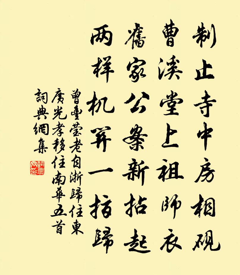 詩詞名句歷史字典書法欣賞書法字典國語詞典說文解字康熙字典古漢語字典標 題 作 者 詩 句 瑩老自浙歸住東廣光孝移住南華五首作者:曾豐 朝代:宋代原文制止寺中房相硯,曹溪堂上祖師衣。舊家公案新拈起,兩樣機關一指歸。詩詞問答問:《瑩老自浙歸住東廣光孝移住南華五首》的作者是誰?答:曾豐問:該詩寫於哪個朝代?答:宋代書法欣賞瑩老自浙歸住東廣光孝移住南華五首書法作品詩詞推薦用趙帥韻為孟阜解嘲陳傅良〔宋代〕恨無毫髮老波瀾,世有曹劉亦後班。堪笑燕人夸璞臘,欲隨圭璧上三壇。八聲甘州(登經濟樓)李曾伯〔宋代〕上巍樓、指顧劍東西,依然舊江山。悵誰為荊棘,委渠天險,薄我風寒。金甌經營幾載,鴻雁尚漂殘。一片迷棋局閉門陸游〔宋代〕殘發凋零不滿巾,閉門聊得養天真。恐傷藥草停除地,為惜松槎禁伐薪。獨木架成新略彴,一峰買得小嶙峋。蕭然學進士作大方無隅二首劉克莊〔宋代〕舉世遊方內,規規臆見拘。惟其全體大,所以四隅無。矩絜豈能盡,軌同安有殊。其崖誰見者,何岸可登乎。固異送王季德提刑寶文少卿楊萬里〔宋代〕寶儲依舊接英游,璗節何曾遠藻旒。卿月使星銀漢曉,繡衣彩服太湖秋。豺當道上狐何問,鷹擊霜前免已愁。火急過餘干吳師中秀才以小詩惠歙硯次韻謝之周必大〔宋代〕舊曾起草向明光,獨與羅文近赭黃。三載瓦池研灶墨,因君聊復夢儀凰。園中雜書陸游〔宋代〕北窗看鏡意悽然,夢斷梁州已七年。獵獵彩旗春日晚,不堪花外見鞦韆。題畫卷韓元吉〔宋代〕少年喜登臨,兩腳不憚軟。支筇上雲山,得酒輒三返。一從老將至,所向意先懶。豈惟心事乖,要自腳力短。不如詠蠅衛宗武〔宋代〕營營止於棘,或赤而或黑。皓皓染成污,奸魂並佞魄。游雲門寺宋之問〔唐代〕維舟探靜域,作禮事尊經。投跡一蕭散,為心自杳冥。龕依大禹穴,樓倚少微星。沓嶂圍蘭若,回溪抱竹庭。覺花立冬節齋宿竹宮悼姚高士程公許〔宋代〕把茅未就橐懸罄,奎畫飛來天雨花。欲職高人歸宿處,佩霞長侍玉皇家。長沙道上戴復古〔宋代〕詩情滿天地,客夢繞瀟湘。何處桂花發,秋風昨夜香。登山猶矍鑠,照水見昂藏。未了一生事,難禁兩鬢霜。御閣端午帖子夏竦〔宋代〕尚方綬帶迎嘉節,中禁彤闈納美祥。疇德珍符方瑞聖,後天宸壽永無疆。芍藥吟金朋說〔宋代〕畫闌倚玉對佃紅,娜裊翻階放艷農。自笑主人無個事,年年攜酒祝東風。夢余義夫以劍請銘方岳〔宋代〕黑水梁州百二關,青天蜀道古雲難。貔貅夜柝身何在,麋鹿秋風骨未寒。寵辱可驚漚起滅,荒涼只有月悲酸。蒯緱再用南伯韻郭印〔宋代〕紛紛愚痴兒,開眼卻如睡。況於世法中,而能了出世。接輿本非狂,阮籍未為醉。知命百無憂,餘生任廢置。奉和聖制喜雪應制宗楚客〔唐代〕飄飄瑞雪下山川,散漫輕飛集九埏。似絮還飛垂柳陌,如花更繞落梅前。影隨明月團紈扇,聲將流水雜鳴弦。共荷姚開府山池孟浩然〔唐代〕主人新邸第,相國舊池台。館是招賢辟,樓因教舞開。軒車人已散,簫管鳳初來。今日龍門下,誰知文舉才。奇山繁步二十八字迎之張埴〔宋代〕聞有翛然一角巾,湖山雨亦動吟聲。如何十里繁江路,猶待詩筒一笑迎。立春日曹松〔唐代〕春飲一杯酒,便吟春日詩。木梢寒未覺,地脈暖先知。鳥囀星沈後,山分雪薄時。賞心無處說,悵望曲江池。名句推薦向淺洲遠渚,亭亭清絕。張炎《疏影·詠荷葉》 今日聽君歌一曲,暫憑杯酒長精神。劉禹錫《酬樂天揚州初逢席上見贈》 何處可為別,長安青綺門。李白《送裴十八圖南歸嵩山二首》 梨花風起正清明,遊子尋春半出城。吳惟信《蘇堤清明即事》 黃葉古祠寒雨積,清山荒冢白雲多。于謙《岳忠武王祠》 寒梅最堪恨,常作去年花。李商隱《憶梅》 寒山幾堵,風低削碎中原路,秋空一碧無今古。陳維崧《醉落魄·詠鷹》 有力者疾以助人,有財者勉以分人,有道者勸以教人。墨子《墨子·10章 尚賢(下)》 望長城內外,惟余莽莽;大河上下,頓失滔滔。 * 《沁園春·雪》 紛紛紅紫已成塵,布穀聲中夏令新。陸游《初夏絕句》