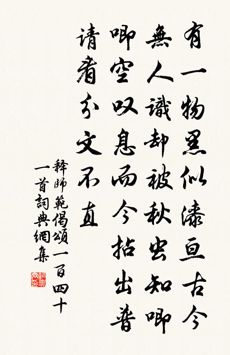 詩詞名句歷史字典書法欣賞書法字典國語詞典說文解字康熙字典古漢語字典標 題 作 者 詩 句 偈頌一百四十一首作者:釋師範 朝代:宋代偈頌一百四十一首原文有一物,黑似漆,亘古今,無人識。卻被秋蟲知,唧唧空嘆息。而今拈出普請看,分文不直。詩詞問答問:偈頌一百四十一首的作者是誰?答:釋師範問:偈頌一百四十一首寫於哪個朝代?答:宋代釋師範偈頌一百四十一首書法欣賞偈頌一百四十一首書法作品詩詞推薦和董傳留別蘇軾〔宋代〕麤繒大布裹生涯,腹有詩書氣自華。厭伴老儒烹瓠葉,強隨舉子踏槐花。囊空不辦尋春馬,眼亂行看擇婿車。得意句佚名〔唐代〕遠來朝鳳闕,歸去戀元侯。(贈僧,見《紀事》)訓世孝弟詩十首邵雍〔宋代〕子孝親兮弟敬哥,怡聲下氣與謙和。難兄難弟名偏重,孝子賢孫貴自多。負米尚難為薄養,讀書寧不擢高科。仲由上周少保劉過〔宋代〕早被儒冠誤,衣稀老更侵。科名數行淚,岐路一生心。自惜亡猿木,誰憐躍治金。使無鐘鼎志,何地可山林。雨霽剡溪錢昭度〔宋代〕剡溪風雨霽,航葦重行行。到處楊柳色,幾家荷葉聲。噪蟬金鼎沸,游水玉壺清。最喜魚梁伴,歸帆的的輕。漁翁陸游〔宋代〕船入蘆花日暮時,雙瞳炯炯鬢如絲。世間豈少磻溪叟,老向煙波人不知。次韻孫莘老斗野亭寄子由在邵伯堰蘇軾〔宋代〕落帆謝公渚,日腳東西平。孤亭得小憩,暮景含余清。坐待斗與牛,錯落掛南甍。老僧如夙昔,一笑意已傾。新詩秋夜感興寄吳順之寇準〔宋代〕耿耿不成寐,楚鄉經暮秋。故人遙海嶠,寒月滿江樓。閉戶生蒼蘚,安閒到白頭。如何太平日,獨不出汀洲。句尹穡〔宋代〕草黃眠失犢,石白動知鷗。悶杜甫〔唐代〕瘴癘浮三蜀,風雲暗百蠻。捲簾唯白水,隱几亦青山。猿捷長難見,鷗輕故不還。無錢從滯客,有鏡巧催顏。和所盤自寬韻丘葵〔宋代〕憂患薰心兩鬢絲,倚欄瘦影卻斜暉。淒其十載不儒服,老矣一生猶布衣。未信此身長坎坷,細看造物實玄微。五更題清頭陀白居易〔唐代〕頭陀獨宿寺西峰,百尺禪庵半夜鍾。煙月蒼蒼風瑟瑟,更無雜樹對山松。風入松沈瀛〔宋代〕金榜初登。綺閣朱樓對娉婷。軟紅塵、有人相等。歸來寢立功名。油蓋擁著一書生。開宴處、笙歌頻奏聲。眼前光答趙景猷曹攄〔魏晉〕守真良難。知德者鮮。歸不悶時。樂在為善。陟彼彌高。流川日遠。無憂不至。敦爾攸踐。法華寺石門精舍三十韻柳宗元〔唐代〕拘情病幽郁,曠志寄高爽。願言懷名緇,東峰旦夕仰。始欣雲雨霽,尤悅草木長。道同有愛弟,披拂恣心賞。松谿榴花洞蔡襄〔宋代〕洞裡花開無定期,落紅曾見逐泉飛。仙人應向青山口,管卻春花不與歸。陰晴不定簡唐覲秘校並敖吳二君五首蘇轍〔宋代〕西鄰豫章客,病骨瘦欒欒。清夜眠孤枕,終朝飽一簞。雨多愁不出,講罷未應餐。約我晴相過,門前泥欲乾。【中呂】賣花聲張可久〔元代〕席上半泓秋水金星硯,一幅寒雲玉版箋,美人索賦《鷓鴣天》。瓊杯爭勸,珠簾高卷,燕歸來海棠庭院。偶題落花梅林八景總詠葉夢鼎〔宋代〕黃墩巨海通昌國,花園大路連西域。九頃農歌樂豐年,赤山牧唱喧朝夕。羅溪流水出通潮,仕岆高山古賢跡,方寺紀游張庭薦〔宋代〕馬行諳舊路,雞唱認層巔。洞口有桃處,江村欲雪天。薰爐香琬刻,洗杓汲靈泉。我愛長留此,山深日似年。名句推薦私行勝,則少公功。韓非及後人《韓非子·外儲說左下》 一道殘陽鋪水中,半江瑟瑟半江紅。白居易《暮江吟》 練於骨者,析辭必精;深乎風者,述情必顯。劉勰《文心雕龍·風骨》 山黛遠,月波長,暮雲秋影蘸瀟湘。蔡松年《鷓鴣天·賞荷》 一聲已動物皆靜,四座無言星欲稀。李頎《琴歌》 去年東武今夕,明月不勝愁。蘇轍《水調歌頭·徐州中秋》 江心雲帶蒲帆重,樓上風吹粉淚香。嚴仁《鷓鴣天·惜別》 獨有宦遊人,偏驚物候新。杜審言《和晉陵陸丞早春遊望》 埋骨何須桑梓地,人生無處不青山。 * 《七絕·改西鄉隆盛詩贈父親》 傍鄰聞者多嘆息,遠客思鄉皆淚垂。李頎《聽安萬善吹觱篥歌》
