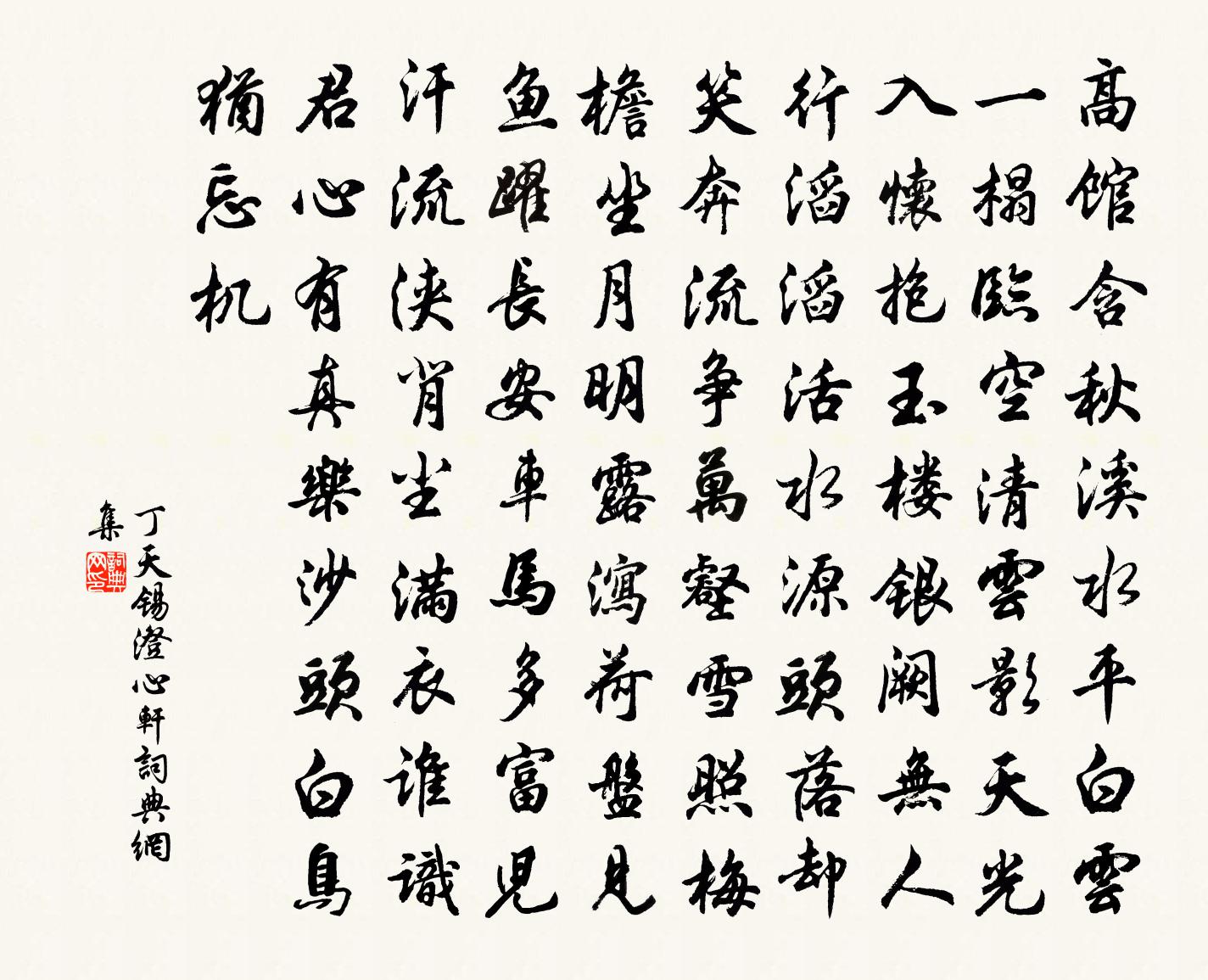 詩詞名句歷史字典書法欣賞書法字典國語詞典說文解字康熙字典古漢語字典標 題 作 者 詩 句 澄心軒作者:丁天錫 朝代:宋代澄心軒原文高館含秋溪水平,白雲一榻臨空清。雲影天光入懷抱,玉樓銀闕無人行。滔滔活水源頭落,卻笑奔流爭萬壑。雪照梅檐坐月明,露瀉荷盤見魚躍。長安車馬多富兒,汗流浹背塵滿衣。誰識君心有真樂,沙頭白鳥猶忘機。詩詞問答問:澄心軒的作者是誰?答:丁天錫問:澄心軒寫於哪個朝代?答:宋代丁天錫澄心軒書法欣賞澄心軒書法作品詩詞推薦人月圓(中秋)趙鼎〔宋代〕連環寶瑟深深願,結盡一生愁。人間天上,佳期勝賞,今夜中秋。雅歌妍態,嫦娥見了,應羨風流。芳尊美酒,年次韻王監叔陳著〔宋代〕君家深似武陵源,又出雲來旆影翻。負笈肯忘鄞北里,彯纓長說海東門。健收風月歸談麈,醉挽河江入酒樽。回首漢宮春(再和前韻)劉克莊〔宋代〕多謝句芒,露十分春信,一種仙姿。主人領客卜夜,也喚分司。天葩國艷,幾曾煩、薄粉濃脂。微似有,酒潮玉頰次韻劉允叔太主簿讀予所編天台集見贈之作林表民〔宋代〕樓頭殘月映儲胥,人在西窗酒醒余。夢裡都忘閬風路,吟邊如到玉霄成。鄰牆共作無何飲,別野期看未見書。祗恐禪人並化主寫真求贊釋正覺〔宋代〕一印印空,三乘莫窮。智了離微句,身分函蓋同。彌勒駕來樓閣外,文殊家住覺城東。隨身乾木,到處家風。頌古三十一首釋原妙〔宋代〕猛虎深藏淺草窠,幾回明月入煙蘿。頂門縱有金剛眼,未免當頭蹉過他。留題座主和凝舊閣李瀚〔唐代〕座主登庸歸鳳闕,門生批詔立鰲頭。玉堂舊閣多珍玩,可作西齋潤筆不。望皖公山周必大〔宋代〕太婆嶺獨高秋浦,皖公山正望龍舒。端如牛女隔天漢,不似彭郎近小姑。會雙竹蓆上奉答開祖長官蘇軾〔宋代〕松柏蕭蕭滿故丘,知君懷抱尚悲秋。算來九九無多日,唱著三三憶舊遊。皓月徘徊應許共,清詩妙絕不容酬。梅花皇帝上平上皇帝壽樂曲升坐用聖安之曲崔敦詩〔宋代〕簪纓列序,羽衛分行。雉扇爰徹,天威煒煌。清明在躬,顒顒昂昂。鹹拜稽首,萬壽無疆。賀王起(一作賀王侍郎典貢放榜)廣宣〔唐代〕從辭鳳閣掌絲綸,便向青雲領貢賓。再辟文場無枉路,兩開金榜絕冤人。眼看龍化門前水,手放鶯飛谷口春。明日秋曉孫應時〔宋代〕高葉明初日,偏林澹遠煙。晴空如滉漾,秋氣更暄妍。睡足小窗淨,心清浮慮捐。與人同樂意,憂國見豐年。垂去洪咨夔〔宋代〕鳳凰知細德,甌鳥識機心。物理固知此,世情非特今。足纓清與濁,厲揭淺知深。覺破從前夢,長歌月滿襟。補樂歌十首。大韶元結〔唐代〕(《大韶》,有虞氏之樂歌也,其義蓋稱舜能紹先聖之德。凡二章,章四句)森森群象兮,日見生成。欲聞朕初兮春日劉翰〔宋代〕沉沉芳酌動金波,笑引疏梅泛玉荷。幾度天寒歸雁少,一番風雨落花多。功名好在知心懶,富貴重來奈老何。烏鵲臨江仙劉過〔宋代〕行道橋南無酒賣,老天猶困英雄。窗前葵萱皆吐花成詩二首趙蕃〔宋代〕僮能去蓬藋,手自植葵萱。疊石就為砌,啟窗因當軒。後先殊早晚,開斂共朝昏。長夏曷以度,幽花相與言。陳待制輓詩葉適〔宋代〕昔年行住偶相同,舍策追羊徑未通。只麽空歸在何處,一竿紅日海門東。挽十尊長居士姚勉〔宋代〕聘君今已矣,月入少微星。又失宗盟長,空悲族譜亭。生芻嗟莫致,歌薤若為聽。只喜陰功在,三槐已綠庭。過扶風精舍舊居,簡朝宗、巨川兄弟韋應物〔唐代〕佛剎出高樹,晨光閭井中。年深念陳跡,迨此獨忡忡。零落逢故老,寂寥悲草蟲。舊宇多改構,幽篁延本叢。棲止名句推薦惟心會而不可口傳,可神通而不可語達。曹雪芹《紅樓夢·第五回》 佳期大堤下,淚向南雲滿李白《大堤曲》 天涯芳草迷歸路,病葉還禁一夜霜。王夫之《初度口占·辛丑》 日斜江上孤帆影,草綠湖南萬里情。劉長卿《別嚴士元》 偷彈清淚寄煙波,見江頭故人,為言憔悴如許。袁去華《劍器近·夜來雨》 深村時節好,應為去年豐。范成大《寒食郊行書事》 雪洗虜塵靜,風約楚雲留張孝祥《水調歌頭·和龐佑父》 人間夢隔西風,算天上、年華一瞬。吳文英《惜秋華·七夕》 言不中法者,不聽也;行不中法者,不高也;事不中法者,不為也。商鞅《商君書·君臣》 黃金燃桂盡,壯志逐年衰。孟浩然《秦中感秋寄遠上人 / 秦中寄遠上人》
