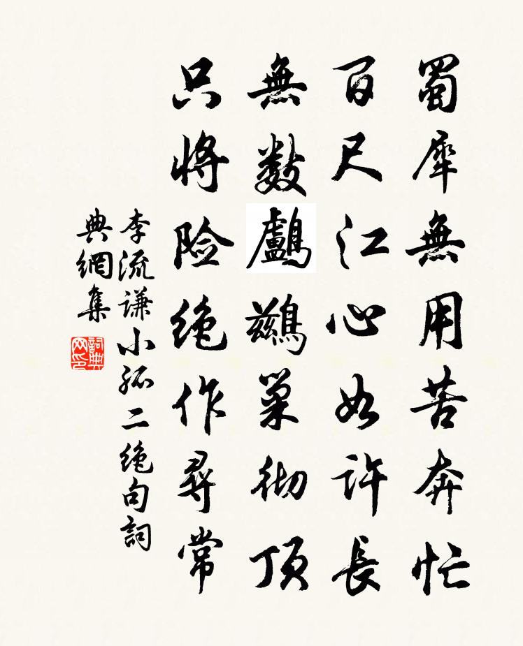 詩詞名句歷史字典書法欣賞書法字典國語詞典說文解字康熙字典古漢語字典標 題 作 者 詩 句 小孤二絕句作者:李流謙 朝代:宋代小孤二絕句原文蜀犀無用苦奔忙,百尺江心如許長。無數鸕鶿巢徹頂,只將險絕作尋常。詩詞問答問:小孤二絕句的作者是誰?答:李流謙問:小孤二絕句寫於哪個朝代?答:宋代李流謙小孤二絕句書法欣賞小孤二絕句書法作品詩詞推薦春晚感事陸游〔宋代〕寒食梁州十萬家,鞦韆蹴鞠尚豪華。犢車轣轆歸城晚,爭碾平蕪入亂花。晦日與盧舍人同詣補闕城南林園孫逖〔唐代〕芳年正月晦,假日早朝回。欲盡三春賞,還欽二阮才。柳迎郊騎入,花近□庭開。宛是人寰外,真情寓物來。玉樹後庭花陳叔寶〔南北朝〕麗宇芳林對高閣,新裝艷質本傾城;映戶凝嬌乍不進,出帷含態笑相迎。妖姬臉似花含露,玉樹流光照後庭;花開謝周睎顏寄惠新芽虞儔〔宋代〕摘鮮分送細茸茸,知在春山第幾重。包裹雅宜青箬篰,寵珍寧羨赤囊封。{左石右靡}驚雪落岩前石,烹訝風生澗赫曦台四景雞鳴出日熊禾〔宋代〕赫曦清晝真奇絕,遠望海門觀出日。金戈鐵騎走千峰,閃閃万旗張天赤。神龍飛上使人驚,爍眼祥光成五色。扶桑效朱公叔絕交詩薛澄〔宋代〕東山有梟,不祥其名。惡木是息,惡聲是鳴。食不棄腐,飲不擇清。宜飛求伏,以晦為明。兇殘滿志,嗜欲惟攖。西江月(賦木犀次李季功韻)郭應祥〔宋代〕碎影亂篩月地,濃香時度風檐。淵明有菊徑開三。不似此花雅淡。蘭蕙芬敷可並,芙蓉淺俗堪嫌。美人妝罷笑窺簾雜興陸游〔宋代〕散發林間萬事輕,夢魂安穩氣和平。只知秋菊有佳色,那問荒雞非惡聲。達士招呼同嘯傲,福人分付與功名。一篇竹隱新籬趙蕃〔宋代〕地迥闕虎落,秋來逢鼠偷。貧居乏給使,力作費營謀。鄰近俱相集,歡言卒未休。濁醪澆渴肺,香飯飽飢喉。密篠冬日雜興趙蕃〔宋代〕日出山門曉,日入山徑陰。區區昏復旦,役役古猶今。竹瘦人群玉,菊荒文碎金。泛觀難究理,默識自明心。宋頌九首聖神石介〔宋代〕二國之君,各何爾土。虎憑于山,莫予敢取。蛟憑於淵,莫予敢侮。萬其年兮,關鐍以固。山中陳與義〔宋代〕當復入州寬作期,人間踏地有安危。風流丘壑真吾事,籌策廟堂非所知。白水春陂天澹澹,蒼峰晴雪錦離離。恰逢元日感事方回〔宋代〕羞將白髮見青春,世事何關蟻虱臣。去就時難千里夢,是非論定百年身。偶然不死由天地,尚可無慚對鬼神。敢問沁園春佚名〔宋代〕不喜輕裘,布衣芒履,任春與秋。傍人笑我生涯拙,塵寰碌碌,畢竟何求。物外蓬瀛,壺中方寸,論此宗風沒價酬偈三十五首釋祖珍〔宋代〕是處青山可垛跟,白雲流水繞孤村。笑攜拄杖出門去,三世誰知一口吞。山園四詠風露亭姜特立〔宋代〕萬物冒春暉,紅紫競芳節。唯此玉井蓮,迥與眾品別。雅受冷風吹,復愛露華潔。亭亭立波上,晚意頗愁絕。疑是句陳伯震〔宋代〕修眉濃淡裹,寸碧有無間。卜運算元楊無咎〔宋代〕婆娑月里枝,隱約空中露。擬訪嫦娥高處看,一夜心生羽。仙種落人間,群艷難儔侶。惱亂騷人有底香,欲賦無奇丙寅十四首效韋蘇州黃庭堅〔宋代〕庭空日色靜,樓迥鐘聲遲。褐叟已爭席,馴鴉更不疑。同來復同去,竟別我為誰。謝潘端叔惠紅梅樓鑰〔宋代〕人閒丹桂亦微黃,未見紅葩解有香。惟喜此花兼眾美,麝臍薰徹絳紗囊。名句推薦眺聽良多感,徙倚獨沾襟。李密《淮陽感秋》 山上層層桃李花,雲間煙火是人家。劉禹錫《竹枝詞九首·其九》 已駕七香車,心心待曉霞。李商隱《壬申七夕》 身後有餘忘縮手,眼前無路想回頭。曹雪芹《紅樓夢·第二回》 用舍由時,行藏在我,袖手何妨閒處看。蘇軾《沁園春·孤館燈青》 數年來往鹹京道,殘杯冷炙謾消魂晏殊《山亭柳·贈歌者》 易醉扶頭酒,難逢敵手棋。賀鑄《南歌子·疏雨池塘見》 若對黃花孤負酒,怕黃花、也笑人岑寂。劉克莊《賀新郎·九日》 念碎劈芳心,縈思千縷,贈將幽素,偷翦重雲。吳文英《風流子·黃鐘商芍藥》 聖人不積,既以為人,己愈有,既以與人,己愈多。天之道,利而不害;聖人之道,為而不爭。老子《老子·德經·第八十一章》