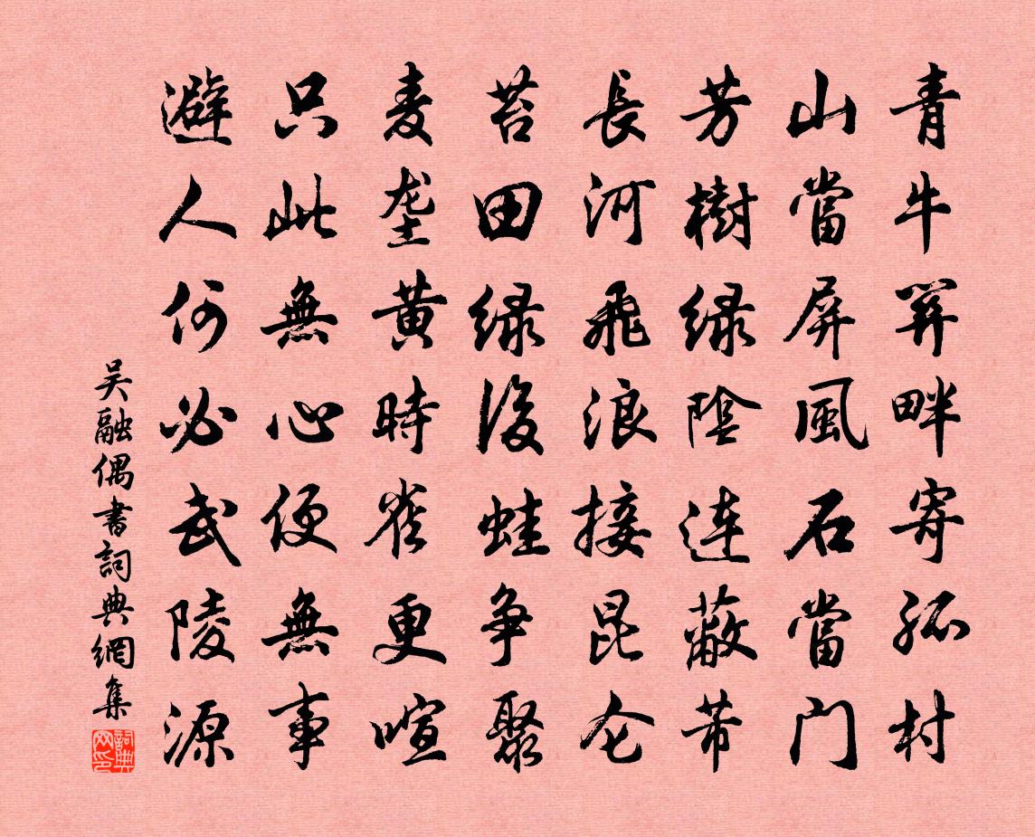 詩詞名句歷史字典書法欣賞書法字典國語詞典說文解字康熙字典古漢語字典標 題 作 者 詩 句 偶書作者:吳融 朝代:唐代偶書原文青牛關畔寄孤村,山當屏風石當門。芳樹綠陰連蔽芾,長河飛浪接崑崙。苔田綠後蛙爭聚,麥壟黃時雀更喧。只此無心便無事,避人何必武陵源?詩詞問答問:偶書的作者是誰?答:吳融問:偶書寫於哪個朝代?答:唐代問:偶書是什麼體裁?答:七律吳融偶書書法欣賞偶書書法作品注釋全唐詩:卷687-11詩詞推薦送張生還和州梅堯臣〔宋代〕山頭孤石望來久,天外行人今獨歸。藥囊自有留生術,不管淮南木葉飛。橫波亭為青口帥賦元好問〔金代〕孤亭突兀插飛流,氣壓元龍百尺樓。萬里風濤接瀛海,千年豪傑壯山丘。疏星淡月魚龍夜,老木清霜鴻雁秋。倚劍過百里大夫冢黃庭堅〔宋代〕行客抱憂端,況復思古人。何年一丘土,不見石麒麟。斷碑略可讀,大夫身霸秦。虞公納垂棘,將軍西問津。安知題郭伯成畫竹道傍人家作雨勢胡寅〔宋代〕可但文翁會寫真,典型今見一枝新。含風帶雨蕭然意,共看林宗墊角巾。偈頌一百零四首釋紹曇〔宋代〕醭醭紅塵,炎炎火聚。著腳無蹤,翻身有路。去時山色慘愁容,歸來幽鳥啼芳樹。不涉去來,如何吐露。碧眼黃頭偈頌七十六首釋子益〔宋代〕識得一,萬事畢。佛法颺在它方,世法拈靠一壁。有問奇特因緣,立秋已過五日。讀王幼學上殿劄子戴復古〔宋代〕才到朝廷被論歸,孤忠幸有九重知。神醫能識未蘇病,國手難翻已敗棋。四海爭傳治安策,諸公如在太平時。老夫畫松徐夤〔唐代〕澗底陰森驗筆精,筆閒開展覺神清。曾當月照還無影,若許風吹合有聲。枝偃只應玄鶴識,根深且與茯苓生。天台贈石台問長老二絕〈並敘〉蘇轍〔宋代〕石台長老問公,本成都吳氏子,棄俗出家,手書《法華經》,字細如黑蟻,前後若一,將誦之萬遍,雖老而精進不宮詞一百首岳珂〔宋代〕夜深雪壓內門前,一榻還驚四璧天。上相傳觴妻擁炭,歸來{右鼻右乾}息頓安眠。送行者妙淙往青龍謁陳七官人敖陶孫〔宋代〕三生同聽寺樓鍾,緊峭芒鞋任所從。莫向華亭覓船子,趙州橋下有青龍。渡伊水張耒〔宋代〕雙崖若爭妍,秀色日相射。遊人夸水東,揮榜渡清瀉。潺潺溪邊風,五月自瀟灑。中流望南北,河漢自天下。嗟予紫溪莊舍讀癸丑壁間舊題轉眼忽十八年同游十劉學箕〔宋代〕維昔舊遊,十有八春。中間往來,合散風塵。詞翰在壁,瞻之愈新。憶我仲弟,眇然懷人。醉蓬萊佚名〔宋代〕看梅腮妝臘,柳眼緘春,小寒交候。蓂莢雙開,慶生賢毓秀。早著蜚聲,榮登鶚表,正是當年少。大器能藏,待當樟鎮夜泊艾可叔〔宋代〕醉卻長年懶著篙,聊依山市泊江皋。船收蒲蓆風初定,人臥蘆花月正高。時有沙禽驚客夢,厭聽櫪馬齕空槽。曉來秋懷二首之二賀鑄〔宋代〕蕭蕭庭木落,格格雞聲惡。荒檐日影斜,飢貓捕黃雀。窗間養痾客,起念丘園樂。欲賦歸去來,西風老藜藿。年老逢春十三首邵雍〔宋代〕年老逢春莫厭春,住家況復在天津。既將水竹為生計,須與風花作主人。故宅費功除瓦礫,新畦加意種蘭薰。未知久雨六言四首劉克莊〔宋代〕夏雨轟轟斷霉,新蟬已噪庭槐。不曉阿香何意,故將車子頻推。頌古十二首釋法泰〔宋代〕三腳臚子弄蹄平,步步蓮華襯足生。堪笑草中尋覓者,不知芳樹囀新鶯。過外弟飲王安石〔宋代〕一自君家把酒杯,六年波浪與塵埃。不知烏石岡邊路,至老相尋得幾回。名句推薦一切福田,不離方寸;從心而覓,感無不通。袁黃《了凡四訓·立命之學》 騮馬新跨白玉鞍,戰罷沙場月色寒。王昌齡《出塞二首》 故園渺何處,歸思方悠哉。韋應物《聞雁》 君子坦蕩蕩,小人長戚戚。孔子弟子《論語·述而篇》 每見寒士將達,必有一段謙光可掬。袁黃《了凡四訓·謙德之效》 終罷斯結廬,慕陶直可庶。韋應物《東郊》 長記別伊時,和淚出門相送。李存勖《如夢令·曾宴桃源深洞》 誠知此恨人人有,貧賤夫妻百事哀。元稹《遣悲懷三首·其二》 流星透疏木,走月逆行雲。賈島《宿山寺》 秋霜不惜人,倏忽侵蒲柳。李白《長歌行》