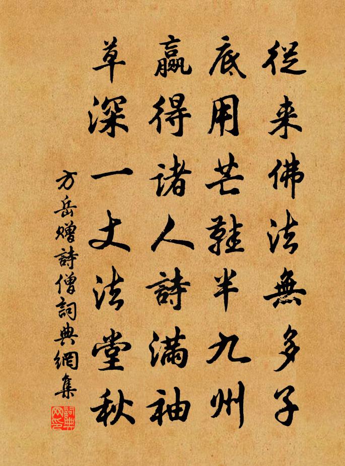 詩詞名句歷史字典書法欣賞書法字典國語詞典說文解字康熙字典古漢語字典標 題 作 者 詩 句 贈詩僧作者:方岳 朝代:宋代贈詩僧原文從來佛法無多子,底用芒鞋半九州。贏得諸人詩滿袖,草深一丈法堂秋。詩詞問答問:贈詩僧的作者是誰?答:方岳問:贈詩僧寫於哪個朝代?答:宋代方岳贈詩僧書法欣賞贈詩僧書法作品詩詞推薦十五里沙劉克莊〔宋代〕只見如山白浪飛,更堪動地黑風吹。渺茫直際九州外,洶湧常如八月時。河伯豈能窮海若,靈胥僅可嚇吳兒。惜無句宋祁〔宋代〕色映堋雲爛,聲迎羽月遲。人月圓(元夜)王詵〔宋代〕小桃枝上春來早,初試薄羅衣。年年此夜,華燈盛照,人月圓時。禁街簫鼓,寒輕夜永,縴手同攜。更闌人靜。千謝虛中上人晚秋見寄齊己〔唐代〕楚外同文在,荊門得信時。幾重相別意,一首晚秋詩。日暮山沈雨,蓮殘水滿池。登樓試南望,為子動歸思。尋三藏上人武元衡〔唐代〕北風吹雪暮蕭蕭,問法尋僧上界遙。全盛手持筇竹杖,逢君不語指芭蕉。遣意二首杜甫〔唐代〕囀枝黃鳥近,泛渚白鷗輕。一徑野花落,孤村春水生。衰年催釀黍,細雨更移橙。漸喜交遊絕,幽居不用名。檐影漢方回〔宋代〕燈前閒覆孟堅書,瞬息炎劉四百餘。五聚井星才屬爾,一抔陵土竟何如。早夸發縱輕烹狗,終藉吞舟失漏魚。若使自太和沖雪歸據鞍偶作書贈令權元凱吳則禮〔宋代〕老去龍紋匕,平生獸錦袍。端知有奇語,大雪滿弓刀。偈頌一百四十一首釋師範〔宋代〕前三後三,今日朝日。達磨不會,九年面壁。及甫坐上分題賦洗竹得百字曹勛〔宋代〕??竹有舊貫,剪伐未容測。長身數竿足,叢薄徒累百。稍令掩翳去,漸放修直色。要知清明朝,惡者在所格。天台道中謝深甫〔宋代〕溪繞青山路繞溪,山長溪曲路高低。晴灘淺濕舟如盪,危磴稜層石作梯。晚照荒村飛鳥入,秋風落木敗蟬嘶。碧雲冬至二首陳與義〔宋代〕少年多意氣,老去一分無。閉戶了冬至,日長添數珠。北風不貸節,鴻雁天南驅。烏帽亦何幸,七日守屋廬。石爐雜詠一百首石崇劉克莊〔宋代〕金谷觴豪友,珠樓擁艷姬。南交來處悖,東市悔何追。送遠杜甫〔唐代〕帶甲滿天地,胡為君遠行。親朋盡一哭,鞍馬去孤城。草木歲月晚,關河霜雪清。別離已昨日,因見古人情。萬壽觀重萼梅李洪〔宋代〕天街倦踏軟紅塵,喜見宮梅漏泄春。千葉剪瓊多態度,九英照日倍精神。香清暗馥維摩榻,韻勝全疑姑射人。好是青霞谷鄭有年〔宋代〕少室隱居空索價,北山俗駕費移文。道人笑破世間事,去住身心如白雲。和趙釴夫見惠姜特立〔宋代〕歸來揩眼望南明,山水光中慰此行。不把篇章供世好,肯將姓字占時名。才疏我合回三舍,語妙君能敵七兵。自此贊三十六祖頌釋印肅〔宋代〕精通無說說,本地亦無生。無生花滿地,本傳無盡燈。又畫嘗醋翁吳則禮〔宋代〕石先戲作忍酸相,未信從來嘗醋難。頭毛鬅鬙面白皺,老夫笑作嬰兒看。輞川集二十首。鹿柴裴迪〔唐代〕日夕見寒山,便為獨往客。不知深林事,但有麏麚跡。名句推薦落日無人松徑里,鬼火高低明滅。薩都剌《念奴嬌·登石頭城次東坡韻》 桃紅復含宿雨,柳綠更帶朝煙。王維《田園樂七首·其六》 日暮東風怨啼鳥,落花猶似墜樓人。杜牧《金谷園》 卓眾來東下,金甲耀日光。蔡琰《悲憤詩》 去好去惡,臣乃見素;去舊去智,臣乃自備。韓非及後人《韓非子·主道》 想文君望久,倚竹愁生步羅襪。姜夔《八歸·湘中送胡德華》 時無英雄,使豎子成名!房玄齡《晉書·列傳·第十九章》 君歌楊叛兒,妾勸新豐酒。李白《楊叛兒》 千里之馬時一有,其利緩;駑馬日售,其利急。韓非及後人《韓非子·說林下》 志忍私,然後能公;行忍情性,然後能修荀子《荀子·儒效》