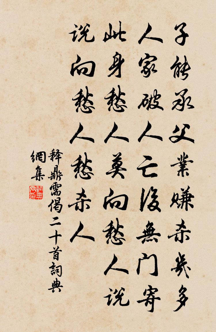 詩詞名句歷史字典書法欣賞書法字典國語詞典說文解字康熙字典古漢語字典標 題 作 者 詩 句 偈二十首作者:釋鼎需 朝代:宋代偈二十首原文子能承父業,賺殺幾多人。家破人亡後,無門寄此身。愁人莫向愁人說,說向愁人愁殺1/1人。詩詞問答問:偈二十首的作者是誰?答:釋鼎需問:偈二十首寫於哪個朝代?答:宋代釋鼎需偈二十首書法欣賞偈二十首書法作品詩詞推薦春思贈人柳中庸〔唐代〕紅粉當三五,青娥艷一雙。綺羅回錦陌,弦管入花江。落雁驚金彈,拋杯瀉玉缸。誰知褐衣客,憔悴在書窗。山中夜宿顧況〔唐代〕涼月掛層峰,蘿林落葉重。掩關深畏虎,風起撼長松。遠齋和示疏字韻四詩復用韻並呈子肅趙蕃〔宋代〕竹經載伐似微疏,濩落猶能伴我居。自分舉家長食粥,從渠厚祿絕無書。諸公漫仰蘇門隱,吾輩還羞李武車。役役昆陽元好問〔金代〕古木荒煙集暮鴉,高城落日隱悲笳。并州倦客初投跡,楚澤寒梅又過花。滿眼旌旗驚世路,閉門風雪羨山家。忘憂題桃花源龔桂馨〔宋代〕碧樹花開醉晚春,靈槎幾度泛天津。可憐太守仙緣薄,不是衣冠不屬秦。十月七日早起方回〔宋代〕己亥十月六,早為立冬日。是日晴頗暄,虛叟偶飲客。醉臥二更醒,起視天宇黑。三更至四更,大風一何急。吼哮送許狀元赴召項安世〔宋代〕十年門巷斷經過,讀易吟詩長薛蘿。始向新春歌伐木,忽逢佳士赴卷阿。面如呂叟精神王,身似章公貴氣多。既出讀韓退之詩有作晁說之〔宋代〕萬樹殘英委泥滓,柳花成絮獨高飛。自憐織質無人賞,宛轉還從洛浦歸。銷暑白居易〔唐代〕何以銷煩暑,端居一院中。眼前無長物,窗下有清風。熱散由心靜,涼生為室空。此時身自得,難更與人同。送鄭少卿景望知建寧陳傅良〔宋代〕屏廢誠愚分,牢愁更索居。若逢知己問,猶解課兒書。地僻門長閉,年飢菜自鋤。相望無一字,不是故情疎。無題陳棣〔宋代〕斥鷃蒿蓬足,鯤鵬謾北溟。餘生薰白業,內景練黃庭。大白蟻浮綠,短檠燈閃青。欲知陶令趣,應向醉中醒。偶成釋斯植〔宋代〕東風玉勒馬蹄輕,多少遊人士鳳城。燕子不來春寂寞,海棠共綠近清明。句王隨〔宋代〕客館月斜寒夢斷,仙舟風穩去帆飛。和崔大夫新廣北樓登眺許渾〔唐代〕北望高樓夏亦寒,山重水闊接長安。修梁暗換丹楹小,疏牖全開彩檻寬。風卷浮雲披睥睨,露涼明月墜闌乾。庾公郡中即事書懷楊億〔宋代〕海隅為郡真卑屑,簿領沉迷箠楚喧。王事更逾星火急,吏曹何啻米鹽煩。甘棠聽訟曾無倦,丹筆書刑幸不冤。境上荊南師姚參政輓詩項安世〔宋代〕劍履三以亞,旌旄十國連。春風迎上日,秋色送歸船。露泣千山月,雲愁萬里天。堂堂寧復有,玉立照人鮮。胭脂菊花董嗣杲〔宋代〕綠蒂黃心簇絳英,何時負取旱蓮名。預知荒徑非全盛,先吐芳葩破獨清。籬落赬填空有艷,風霜風槁卻無情。紅嫣陰地關見入蕃公主石上手跡雍陶〔唐代〕漢家公主昔和蕃,石上今餘手跡存。風雨幾年侵不滅,分明纖指印苔痕。祁陽縣晚渡項安世〔宋代〕郭外湘江清徹底,江頭石壁新如洗。呼舟斜日度空明,脫帽中流照清泚。一聲欸乃忽心驚,曾與漁郎有舊盟。日暮次韻王鬱林蘇軾〔宋代〕晚途流落不堪言,海上春泥手自翻。漢使節空餘皓首,故侯瓜在有頹垣。平生多難非天意,此去殘年盡主恩。誤辱名句推薦情知已被山遮斷,頻倚闌乾不自由。辛棄疾《鷓鴣天·晚日寒鴉一片愁》 天秋木葉下,月冷莎雞悲。李白《秋思》 不怕官,只怕管。施耐庵《水滸傳·第二回》 君子莫大乎與人為善。孟子《孟子·公孫丑章句上·第八節》 暮雨忽來鴻雁杳,莽關山、一派秋聲里。龔自珍《金縷曲·癸酉秋出都述懷有賦》 自春來、慘綠愁紅,芳心是事可可。柳永《定風波·自春來》 倉稟無宿儲,徭役猶未已。韋應物《觀田家》 不虛美,不隱惡司馬光《資治通鑑·唐紀·唐紀十三》 晴風初破凍,柳眼梅腮,已覺春心動。李清照《蝶戀花·暖雨晴風初破凍》 無人收廢帳,歸馬識殘旗。張籍《沒蕃故人》