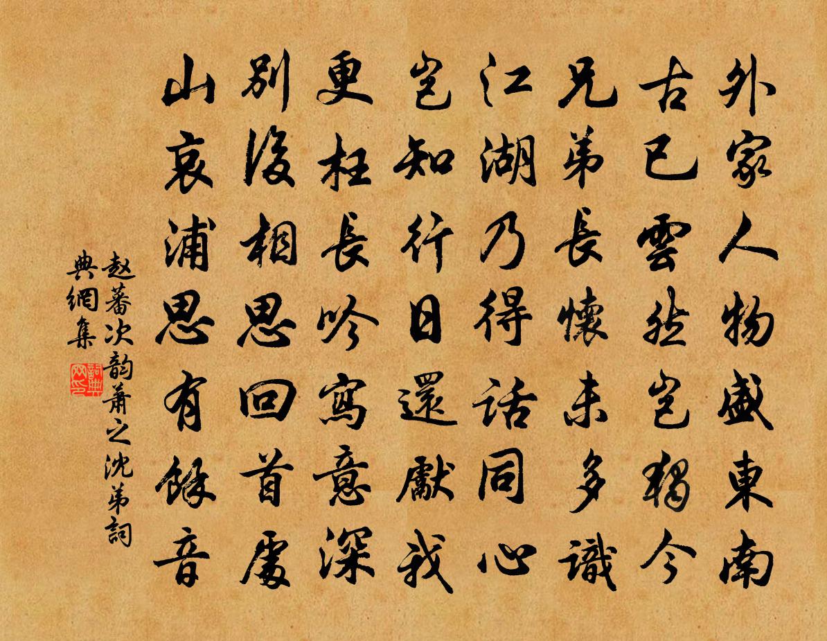 詩詞名句歷史字典書法欣賞書法字典國語詞典說文解字康熙字典古漢語字典標 題 作 者 詩 句 次韻蕭之沈弟作者:趙蕃 朝代:宋代次韻蕭之沈弟原文外家人物盛東南,古已云然豈獨今。兄弟長懷未多識,江湖乃得話同心。豈知行日還先我,更枉長吟寫意深。別後相思回首處,山哀浦思有餘音。詩詞問答問:次韻蕭之沈弟的作者是誰?答:趙蕃問:次韻蕭之沈弟寫於哪個朝代?答:宋代趙蕃次韻蕭之沈弟書法欣賞次韻蕭之沈弟書法作品詩詞推薦鵲橋仙(落梅)張孝祥〔宋代〕吹香成陣,飛花如雪,不那朝來風雨。可憐無處避春寒,但玉立、仙衣數縷。清愁萬斛,柔腸千結,醉里一時分付四五用喜雪韻四首吳潛〔宋代〕富貴家家遺五虛,不須乞米效顏書。垢除與物重更始,朴散於今暫復初。狡兔迷藏罝謾設,游魚潛伏網應疎。此恩臨江仙(晁以道見和答韓文若之句,復答之。二首)葉夢得〔宋代〕三月鶯花都過了,曉來雪片猶零。嵩陽居士記行行。西湖初水滿,遙想縠紋生。欲為海棠傳信息,如今底事長醒。雪峰寺劉克莊〔宋代〕七里深林集暮鴉,插空金碧被林遮。華堂何止容千衲,菜地猶堪置萬家。虎去有靈知伏弩,僧來敘舊約分茶。世人參部至三山簡王宗教子文野二首仍寄觀潮拙稿王邁〔宋代〕昔艤歸舟傍淺沙,逢君躍馬看梅花。匆匆相見還相別,三十六彎天一涯。上塘值清明八首曹勛〔宋代〕客路逢寒食,禾身出已齊。清溪三汊淺,白鷺一行低。禊飲心何在,茅峰路恐迷。隨時隨有樂,何處不幽棲。奉使契丹二十八首其二十送文太師致仕還洛三蘇轍〔宋代〕國老無心豈為身,五年朝謁慰簪紳。元臣事業通三世,舊將威名服四鄰。遍閱後生真有道,欲談前事恐無人。比公菊花十二首史鑄〔宋代〕露裛幽花泠自香,藥 * 效不尋常。祛風偏重山泉嘖,胡廣隨緣卻壽長。金谷園張繼〔唐代〕彩樓歌館正融融,一騎星飛錦帳空。老盡名花春不管,年年啼鳥怨東風。戲同舍與內競陳宗遠〔宋代〕龍泉函氣清,歐冶吐霞綺。干將墮龜文,莫邪潛漫理。藏鋒金匣夜光芒,銅花玉暈相磨砥。雄雌一落東與西,相從簡石橋僧璧暉高似孫〔宋代〕只在間雲里,房虛濕翠屏。童歸收晚果,客至歇殘經。月落千峰黑,龍旭白水腥。關門無一事,草木共冥冥。次韻真歇和尚圓覺經頌一十四首普眼菩薩章釋正覺〔宋代〕誰從普眼道場來,天帝堂前珠網開。徹底光明成一段,箇中清淨絕纖埃。交羅理事真空觀,照破根塵不夜台。恰恰長相思·其一李白〔唐代〕長相思,在長安。絡緯秋啼金井闌,微霜淒淒簟色寒。孤燈不明思欲絕,卷帷望月空長嘆。美人如花隔雲端!上有出白下周文璞〔宋代〕南朝禁篽夕陽明,猶與遊人作隊行。煙滿天淵池上路,菜花黃盡綠陰成。洛陽試院樓上新晴五絕蘇轍〔宋代〕伊闕遙臨鳳闕前,龍門女幾氣蒼然。唐朝御路依稀在,猶想東巡塵暗天。讀修睦上人歌篇李鹹用〔唐代〕李白亡,李賀死,陳陶趙睦尋相次。須知代不乏騷人,貫休之後,惟修睦而已矣。睦公睦公真可畏,開口向人無所集慶寺仇遠〔宋代〕平生三宿此招提,眼底交遊更有誰。顧愷漫留金粟影,杜陵忍賦玉華詩。旋烹紫筍猶含籜,自摘青茶未展旗。聽徹華陽吟三十首白玉蟾〔宋代〕飲金波數百鍾,醉時仗劍指虛空。腳根戲躡交乾斗,長嘯一聲天地紅。踏莎行(寄遠)郭應祥〔宋代〕一撮精神,百般體態。蘭心蕙性誰能賽。霎時不見早思量,許多日子如何捱。我已安排,你須寧耐。看看重了鴛鴦將赴上庠偶成張耒〔宋代〕卷中課最詩成後,枕上功名睡美余。弟子解疑常隱几,輪人能笑久觀書。山林沉痼時搔首,松菊耽淫自荷鋤。乾世名句推薦日出入安窮?時世不與人同。佚名《日出入》 佳人獨立相思苦。薄袖欺寒脩竹暮。劉鎮《玉樓春·東山探梅》 日日深杯酒滿,朝朝小圃花開。朱敦儒《西江月·日日深杯酒滿》 男兒少為客,不辨是他鄉。李流芳《黃河夜泊》 渺萬裡層雲,千山暮雪,隻影向誰去?元好問《摸魚兒·雁丘詞 / 邁陂塘》 夜市賣菱藕,春船載綺羅。杜荀鶴《送人游吳》 不怕三十而死,只怕死後無名。佚名《增廣賢文·下集》 霜降碧天靜,秋事促西風。葉夢得《水調歌頭·九月望日與客習射西園余偶病不能射》 以三寸之舌,彊於百萬之師。司馬遷《史記·平原君虞卿列傳》 有過則改之,未萌則戒之馮夢龍《警世通言·卷三十八》