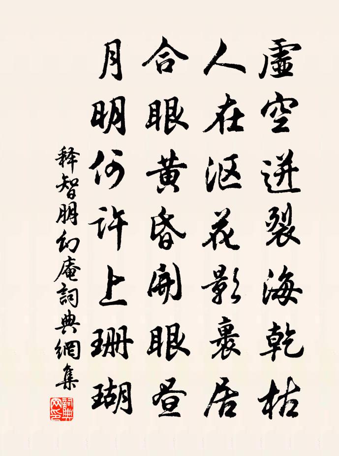 詩詞名句歷史字典書法欣賞書法字典國語詞典說文解字康熙字典古漢語字典標 題 作 者 詩 句 幻庵作者:釋智朋 朝代:宋代幻庵原文虛空迸裂海乾枯,人在漚花影裹居。合眼黃昏開眼晝,月明何許上珊瑚。詩詞問答問:幻庵的作者是誰?答:釋智朋問:幻庵寫於哪個朝代?答:宋代釋智朋幻庵書法欣賞幻庵書法作品詩詞推薦後江行十絕岳珂〔宋代〕擁騎年時憶往來,舊時行處半莓苔。山雲勒駕應頻笑,又是江南勾當回。送僧歸護國寺劉筠〔宋代〕暫寄長安寺,時聞寶偈傳。南歸宗派盛,外護帝臣賢。桂色陵庵雪,芝腴助茗泉。離懷杳何許,鳳剎際霞天。月華清(春夜對月)洪瑹〔宋代〕花影搖春,蟲聲吟暮,九霄雲幕初卷。誰駕冰蟾,擁出桂輪天半。素魄映、青瑣窗前,皓彩散、畫闌乾畔。凝眄。偈頌一百二十三首釋祖欽〔宋代〕呼六為五,破二作三。眼觀東北,意在西南。仰山門下卻不用遮般茶飯,佛法不怕爛。再和楊公濟梅花十絕蘇軾〔宋代〕一枝風物便清和,看盡千林未覺多。結習已空從著袂,不須天女問云何。和石庵洪府理金沙酴醾牡丹二首何夢桂〔宋代〕洛茶欲放趁春忙,一架花添兩樣芳。倚檻白紅多侍女,臨軒黃紫是真王。只愁吳苑館娃老,無奈唐宮春恨長。說與莆門陳東野輓詞戴栩〔宋代〕碧海雲邊為小隱,暮年世味等空濛。笑看朝友題銜闊,愛共鄰翁話歲豐。書述南軒兒自注,詩參東野字應同。一丘傷靡草雍陶〔唐代〕靡草似客心,年年亦先死。無由伴花落,暫得因風起。代陽春登荊山行鮑照〔南北朝〕旦登荊山頭。崎嶇道難游。早行犯霜露。苔滑不可留。極眺入雲表。窮目盡帝州。方都列萬室。層城帶高樓。奕奕偶作晁公溯〔宋代〕官居復何有,幽事亦堪夸。高樹行春蔓,疏篁上晚花。常年皆作客,隨地即為家。尚想關山路,傷心故國賒。寄剡縣主簿羅隱〔唐代〕金庭養真地,珠篆會稽官。境勝堪長往,時危喜暫安。洞連滄海闊,山擁赤城寒。他日拋塵土,因君擬煉丹。北亭獨宿白居易〔唐代〕悄悄壁下床,紗籠耿殘燭。夜半獨眠覺,疑在僧房宿。傷進士謝庭皓徐夤〔唐代〕獻書猶未達明君,何事先游岱嶽雲。惟有春風護冤魄,與生青草蓋孤墳。青房並蒂蓮王沂孫〔宋代〕醉凝眸。是楚天秋曉,湘岸雲收。草綠蘭紅,淺淺小汀洲。芰荷香里鴛鴦浦,恨菱歌、驚起眠鷗。望去帆,一片孤金陵十二釵正冊——妙玉曹雪芹〔清代〕欲潔何曾潔?雲空未必空。可憐金玉質,終陷淖泥中。逍遙詠宋太宗〔宋代〕鼎內蓮花出,如塵發絳紅。坎鉛將匹配,離火好相逢。陰散何優劣,陽歸自契約。消停方可信,輝華大道雄。東池孫錫〔宋代〕一片滄州景,寒光湛碧流。有時雙鯉躍,盡日采鴛浮。綠荇千絲密,紅蕖萬朵稠。琴尊約佳客,乘月泛歸舟。別章杭山汪元量〔宋代〕抱琴曾北向,彈鋏復南圖。李泌游衡岳,知章賜鑑湖。柱頭仙是鶴,濠上子非魚。此夜同聯鼎,他年莫寄書。哭潘義榮二首鄭剛中〔宋代〕沈約樓前落葉黃,朝來玉折報潘郎。一區每嘆如懸馨,三版俄驚戒若堂。泉石半生閒日月,絲綸餘事人文章。但應送朱大入秦孟浩然〔唐代〕遊人武陵去,寶劍值千金。分手脫相贈,平生一片心。名句推薦銜霜當路發,映雪擬寒開。何遜《詠早梅 / 揚州法曹梅花盛開》 投宿駸駸征騎,飛雪滿孤村。孔夷《南浦·旅懷》 塘上有塔院,中秋夜曾隨吾父觀潮於此。沈復《浮生六記·浪遊記快》 富貴易生禍端,必忠厚謙恭,才無大患王永彬《圍爐夜話·第六三則》 海日生殘夜,江春入舊年。王灣《次北固山下》 床空委清塵,室虛來悲風。潘安《悼亡詩三首》 花自飄零水自流。一種相思,兩處閒愁。李清照《一剪梅·紅藕香殘玉簟秋》 雪霏霏,風凜凜,玉郎何處狂飲?魏承班《滿宮花·雪霏霏》 牆頭馬上遙相顧,一見知君即斷腸。白居易《井底引銀瓶·止淫奔也》 虛牖傳寒柝,孤燈照絕編。歐陽詹《除夜長安客舍》