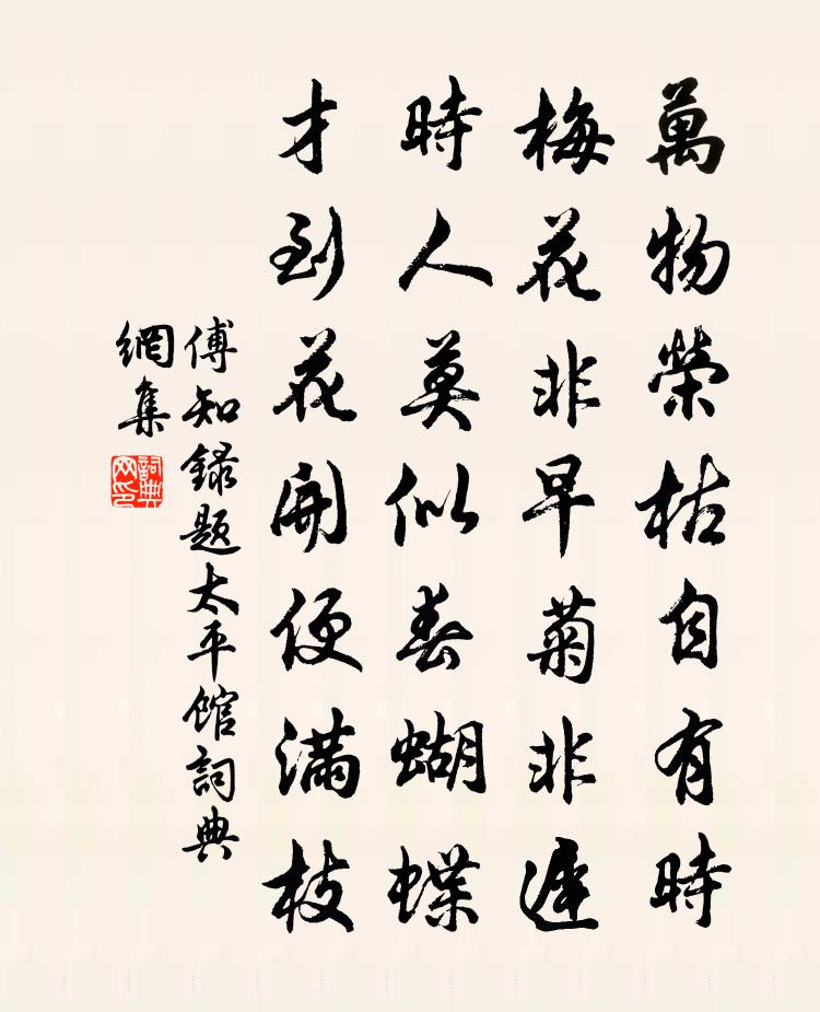 詩詞名句歷史字典書法欣賞書法字典國語詞典說文解字康熙字典古漢語字典標 題 作 者 詩 句 題太平館作者:傅知錄 朝代:宋代題太平館原文萬物榮枯自有時,梅花非早菊非遲。時人莫似春蝴蝶,才到花開便滿枝。詩詞問答問:題太平館的作者是誰?答:傅知錄問:題太平館寫於哪個朝代?答:宋代傅知錄題太平館書法欣賞題太平館書法作品詩詞推薦和楊仲軻春難度文同〔宋代〕春難度。歌滿闋,酒萬舉。喉欲破,腸欲腐。風光滿天已不暮。春難度。百丈岩觀水白玉蟾〔宋代〕手攜青藜杖,岩上俯清池。池水夜來冰,凍磷殊未澌。戲以藜杖尖,斲破黃琉璃。橫杖擔兩片,忍凍岩前嬉。愛日奉和襲美謝友人惠人參陸龜蒙〔唐代〕五葉初成椵樹陰,紫團峰外即雞林。名參鬼蓋須難見,材似人形不可尋。品第已聞升碧簡,攜持應合重黃金。殷勤寄衡陽尉徐智伯三首曾豐〔宋代〕衡陽容有雁,嶺表得無梅。半歲人南北,中宵夢片來。燈為輸喜使,酒作嫁愁媒。莫決敲門句,幾經改作推。見王參政李思衍〔宋代〕獵獵風沙透紙窗,地爐火歇冷侵床。一聲孤鶴淚殘月,幾杵疏鍾敲曉霜。黍律噓春燕谷暖,梅花入夢楚天長。歸期挽少師相國李公張元乾〔宋代〕往在東都日,傷心丙午年。不從三鎮割,安得兩宮遷。抗議行營上,排奸御榻前。英風成昨夢,遺恨落窮邊。岩桂花徐似道〔宋代〕重重簾幕護金猊,小樹花開逼麝臍。寒色十分新疹粟,春心一點暗通犀。香延棋畔仙人斧,影射燈前太乙藜。從此窗前古槐二首裘萬頃〔宋代〕密葉繁陰畫不成,捲簾雙眼為渠明。人間炎熱無來處,贏得軒窗分外清。中隱岩李師中〔宋代〕訪隱尋幽緩著鞭,梅花初試小春天。孤峰上下分三洞,一水縈紆溉萬田。好向忙中拋俗事,卻來閒處覓神仙。清虛中書黃舍人父總乾輓詩虞儔〔宋代〕孝子推慈父,明君有直臣。豈惟成羽翼,況復掌絲綸。想像成齋舊,昭回宸翰新。固應方寸地,種德玉堂人。菩薩蠻·春風試手先梅蕊趙令畤〔宋代〕春風試手先梅蕊,頩姿冷艷明沙水。不客群芳知,端須月與期。清香閒自遠,先向釵頭見。雪後燕瑤池,人間第一左目劉克莊〔宋代〕已盲猶赤痛,久不出雞窠。丹荔曾遺毒,青燈亦一魔。拋書無味甚,節腹柰饞何。二痴依然在,徒勞問眼科。觀潮閣王奕〔宋代〕南岸客來過北岸,浙山盡處見閩山。清秋井邑棋枰里,落日汀洲畫軸間。和錢處和梅花五絕王之望〔宋代〕萬木歸根冷未滋,可憐孤絕發寒枝。心期本在冰霜後,占得隆冬未恨遲。寓嘆陸游〔宋代〕江上霜風透弊袍,區區無奈簿書勞。衰遲始憶壯遊樂,仕宦更知歸臥高。人怪羊裘忘富貴,我從牛儈得賢豪。俗間夜賦陸游〔宋代〕老人不食覺魂清,況若身游白玉京。夜靜月驚林鵲起,水涼風颭露荷傾。昏燈一點窺孤夢,畫角三終轉五更。欲醉禪人並化主寫真求贊釋正覺〔宋代〕識浪瀝乾,肚皮束寬。口翻瀾而海闊,發垂雪而山寒。妙傳家法髑髏眼,巧幻神通赤肉團。相隨來也,搥鑿無瘢。歲寒堂三題其一歲寒堂范仲淹〔宋代〕我先本唐相,奕世天衢行。子孫四方誌,有家在江城。雙松儼可愛,高堂因以名。雅知堂上居,宛得山中情。目有嘉泰二年恭上太皇太后尊號八首佚名〔宋代〕蕩蕩天門,金鋪玉戶。采旄翠旌,流蘇葆羽。千官影從,迺導迺輔。都人從親,填道呼舞。浣溪沙莫將〔宋代〕寶釧香裙上玉梯。雲重應恨翠樓低。愁同芳草兩萋萋。名句推薦倉無備粟,不可以待凶飢。墨子《墨子·05章 七患》 天下三分明月夜,二分無賴是揚州。徐凝《憶揚州》 大雪北風催,家家貧白屋。環山樵《薛寶釵·雪竹》 陪都歌舞迎佳節,遙祝延安景物華。 * 《元旦口占用柳亞子懷人韻》 喜怒豈妄發哉?皆逆之所犯也。列子及其弟子《列子·黃帝》 止戈為武。左丘明《左傳·宣公·宣公十二年》 東風靜、細柳垂金縷。万俟詠《三台·清明應制》 無情明月,有情歸夢,同到幽閨。劉基《眼兒媚·秋思》 過頭飯好吃,過頭話難聽!佚名《增廣賢文·下集》 功被天下,守之以讓。荀子《荀子·宥坐》