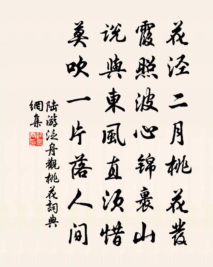 花涇二月桃花發,霞照波心錦裹山。說與東風直須惜,莫吹一片落人間。