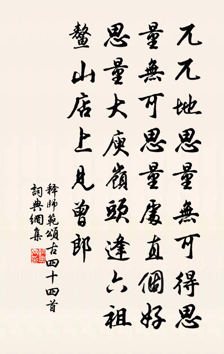 詩詞名句歷史字典書法欣賞書法字典國語詞典說文解字康熙字典古漢語字典標 題 作 者 詩 句 頌古四十四首作者:釋師範 朝代:宋代頌古四十四首原文兀兀地思量,無可得思量。無可思量處,直個好思量。大庾嶺頭逢六祖,鰲山店上見曾郎。詩詞問答問:頌古四十四首的作者是誰?答:釋師範問:頌古四十四首寫於哪個朝代?答:宋代釋師範頌古四十四首書法欣賞頌古四十四首書法作品詩詞推薦寓嘆陸游〔宋代〕江上霜風透弊袍,區區無奈簿書勞。衰遲始憶壯遊樂,仕宦更知歸臥高。人怪羊裘忘富貴,我從牛儈得賢豪。俗間北窗雨中作陸游〔宋代〕鬱蒸作不解,風雨來有信,豈惟窗戶清,更喜草木潤。簡編既陳前,燈火亦可近。跂予望聖賢,傾河洗驕吝。扶衰龍鳳茶王禹偁〔宋代〕樣標龍鳳號題新,賜得還因作近臣。烹處豈期商嶺外,碾時空想建溪春。香於九畹芳蘭氣,圓似三秋皓月輪。愛惜賀李微之兼工侍二首岳珂〔宋代〕當時邛蜀起徵君,褒貶春秋賴洽聞。又見璧跗攽異數,要令金匱闡斯文。魚鳧西隔一隅地,龍馬南來四世勛。陳古挽翟親杜范〔宋代〕時運遭逢亦偶然,著鞭莫訝祖生先。閉門終負三冬用,脂篋徒夸十部賢。玉樹幸能光舊德,爵羅寧復嘆當年。生平懷寄彭城朋好十首之七王十三賀鑄〔宋代〕不見會之久,每思詩酒豪。扁舟由甬上,乘興可須招。子修步屧相過屬疾不能倒屣戲贈沈與求〔宋代〕簿書日在手,佳思挽不留。而能痛撥置,時來訪清幽。古木占城陰,一曲縈寒流。落影插清泚,綠蔭亦已稠。結亭和運使王密學西亭未開牡丹宋庠〔宋代〕新年西圃帶輕寒,芳意含華洽客歡。瑞露只知催濯錦,朝霞猶欲隱乘鸞。暗期玉蕊蜂窠潤,偷裛天香蝶粉乾。應為鳳歸雲趙以夫〔宋代〕正愁予,可堪去馬便駢駢。擬折一枝。堤上萬垂絲。離思無邊,離席易散,落日照清漪。苦是禁城催鼓,虛床難寐和公美一絕陳文蔚〔宋代〕欺人一任雪堆頭,豈復長懷身外愁。涉世自知今已慣,風婆應不覆虛舟。侍宴長寧公主東莊應制李乂〔唐代〕紫禁乘宵動,青門訪水嬉。貴游鱣序集,仙女鳳樓期。合宴簪紳滿,承恩雨露滋。北辰還捧日,東館幸逢時。秋懷項安世〔宋代〕有營何日得無悲,無欲無時不自宜。竹影一窗泉一曲,山齋非是愛吟詩。放言十首黃庭堅〔宋代〕輕肥馬上郎,枯槁林下士。聲名斲自然,勢利焚和氣。智人不駭俗,同朝皆用事。物外有華胥,時時夢中至。和育王十二題重台蓮李覯〔宋代〕長疑佛界中,天女來行樂。為怕山風寒,仙衣盡重著。題柴言山水陸游〔宋代〕草亭臨峭絕,霜嶂起嶙峋。危磴儻可上,老夫思卜鄰。句諶祜〔宋代〕兩水夾城飄近遠,萬山擁翠綠參差。滿庭芳晁端禮〔宋代〕淺約鴉黃,輕勻螺黛,故教取次梳妝。減輕琶面,新樣小鸞凰。每為花嬌玉嫩,容對客、斜倚銀床。春來病,蘭薰和用明梅十三絕胡寅〔宋代〕公子曾游翰墨場,詩成寒律帶春光。杯中竹葉悠悠夢,句里梅花字字芳。吳仲庶殿院寄示與呂沖之馬仲塗唱和詩六篇邀梅堯臣〔宋代〕我實山野人,不識經濟宜。聞歌汴渠勞,謾綴汴渠詩。汴水源本清,隨分黃河枝。濁流方已盛,清派不可推。天王元日班賀任希夷〔宋代〕百華照曉歲更初,黼座當中列辟趨。舞蹈三回嚴贊唱,虔恭百拜聽傳呼。麾旗簇仗朝儀肅,韎韐班庭遠意孚。元會名句推薦磧里征人三十萬,一時回向月明看。李益《從軍北征》 笑漸不聞聲漸悄,多情卻被無情惱。蘇軾《蝶戀花·春景》 西風稍急喧窗竹,停又續,膩臉懸雙玉。閻選《河傳·秋雨》 柳梢聽得黃鸝語,此是春來第一聲。楊載《到京師》 願春暫留,春歸如過翼。周邦彥《六醜·落花》 酒酣應對燕山雪,正冰河月凍,曉隴雲飛。周密《高陽台·送陳君衡被召》 秋陰不散霜飛晚,留得枯荷聽雨聲。李商隱《宿駱氏亭寄懷崔雍崔袞》 舊時王謝、堂前燕子,飛向誰家。吳激《人月圓·南朝千古傷心事》 澗影見松竹,潭香聞芰荷。孟浩然《夏日浮舟過陳大水亭 / 浮舟過滕逸人別業》 火樹銀花合,星橋鐵鎖開。蘇味道《正月十五夜》
