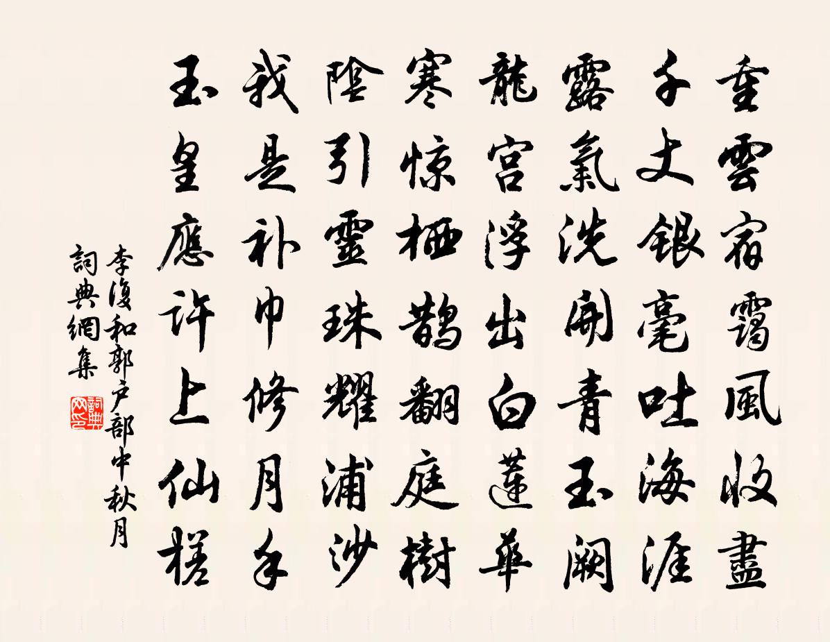 詩詞名句歷史字典書法欣賞書法字典國語詞典說文解字康熙字典古漢語字典標 題 作 者 詩 句 和郭戶部中秋月作者:李復 朝代:宋代和郭戶部中秋月原文重雲宿靄風收盡,千丈銀毫吐海涯。露氣洗開青玉闕,龍宮浮出白蓮華。寒驚棲鵲翻庭樹,陰引靈珠耀浦沙。我是補巾修月手,玉皇應許上仙槎。詩詞問答問:和郭戶部中秋月的作者是誰?答:李復問:和郭戶部中秋月寫於哪個朝代?答:宋代李復和郭戶部中秋月書法欣賞和郭戶部中秋月書法作品詩詞推薦武德殿朝退望九衢春色曹松〔唐代〕玉殿朝初退,天街一看春。南山初過雨,北闕淨無塵。夾道夭桃滿,連溝御柳新。蘇舒同舜澤,煦嫗並堯仁。佳氣送子坦陸游〔宋代〕老境寧容別,諸兒仕為貧。一春多臥病,幾度送行人。五斗方須祿,千金且愛身。長安雖可樂,憐汝正思親。聞鵲喜·吳山觀濤周密〔宋代〕天水碧。染就一江秋色。鰲戴雪山龍起蟄。快風吹海立。 數點菸鬟青滴。一杼霞綃紅濕。白鳥明邊帆影直。隔江重九游郁孤台和座客韻李昴英〔宋代〕座上多俊人,奇掘角拔犀。追風飆館游,鼉鳴玉龍嘶。夕陽催歸鞭,更酌樽重攜。懷開鉤鉤簾,語合印印泥。似與送師旻禪者釋重顯〔宋代〕深岩寂寂披蘭芷,碧霧紅霞映流水。空生別我期未期,絕域殊方擬輕擬。堪笑歸嶺南,賓士何鄙彼。危急亂拋下,贈沙書先生白玉蟾〔宋代〕生蛇滿地走如飛,入石三分未是奇。掇取恆河歸掌握,毫毛不動始知機。代白紵舞歌詞鮑照〔南北朝〕三星參差露沾濕。弦悲管清月將入。寒光蕭條候蟲急。荊王流嘆楚妃泣。紅顏難長時易戢。凝華結藻久延立。非君題榔樹楊萬里〔宋代〕化工到得巧窮時,東補西移也大奇。君看桄榔一窠子,竹身杏葉海棕枝。和姜邦傑感興葉翥〔宋代〕枌梓交遊盡,靈光巋獨存。聲名今綺皓,公論自推尊。四序釋文珦〔宋代〕四序迭遷變,春光獨豐茂。生意遍群物,動植不違候。噰噰塞鴻歸,喔喔野雉雊。軟草鋪作茵,芳葩粲成繡。唯有次韻德先步月答所問語魏了翁〔宋代〕三更端正月,皎亮直瑤京。客問心之體,無言對太清。永別楊氏〔宋代〕春盡花隨盡,其如自是花。從來說花意,不過此容華。五星謝枋得〔宋代〕五緯煌煌聚在秦,項王稱霸沛公臣。誰知四百年天下,已屬寬仁大度人。餞友宰丹陽万俟紹之〔宋代〕昔曾覘吏事,不是小規模。萬象胸中布,全牛眼底無。迅雷推敏速,片月對清孤。鐵瓮城邊邑,今番凋瘵蘇。賀趙法曹華岳〔宋代〕紅日轉檐花,飛鳴一聲鵲。鵲翅未離檐,有客拽鈴索。呼童急啟戶,問客意何若。客聞笑而言,法曹參計鑰。因知橫石潭傅權〔宋代〕圓如冰鑒石平橫,一派泉流到此停。我信龍潛應咫尺,終歸大海潤生靈。水調歌頭(出郊玩水)吳潛〔宋代〕小隊旌旗出,畫鷁倚嵩竹。青秧白水無際,中有一犁耕。聽得田翁相語,今歲時年恰好,眨眼是秋成。老守何能解從人求花黃庭堅〔宋代〕舍南舍北勃姑啼,體中不佳陰雨垂。欲向黃梅問訊息,背陰合有兩三枝。鄚州道中作乾隆〔清代〕土郭猶存古鄚州,人家負郭頗稱稠。年年四月集藥市,風俗應從民便由。送客洞庭西楊維楨〔元代〕送客洞庭西,雷堆青兩兩。陳殿出空明,吳城連蒼莽。春隨湖色深,風將潮聲長。揚柳讀書堂,芙蓉采菱槳。懷人名句推薦商女不知亡國恨,隔江猶唱後庭花。杜牧《泊秦淮》 濤瀾洶湧,風雲開闔。蘇轍《黃州快哉亭記》 徙倚霜風裡,落日伴人愁。袁去華《水調歌頭·定王台》 多少新亭揮淚客,誰夢中原塊土。劉克莊《賀新郎·送陳真州子華》 記得年時臨上馬,看人眼淚汪汪。如今不忍更思量。劉彤《臨江仙·千里長安名利客》 江流天地外,山色有無中。王維《漢江臨泛 / 漢江臨眺》 才有淺深,無有古今;文有偽真,無有故新。王充《論衡·卷二十九·案書篇》 雨余溪水掠堤平,閒看村童謝晚晴。陸游《觀村童戲溪上》 憐夜冷孀娥,相伴孤照。吳文英《花犯·謝黃復庵除夜寄古梅枝》 零落江南不自由。兩綢繆。料得吟鸞夜夜愁。姜夔《憶王孫·番陽彭氏小樓作》