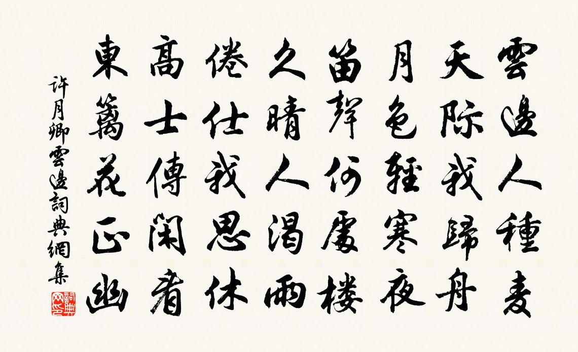 詩詞名句歷史字典書法欣賞書法字典國語詞典說文解字康熙字典古漢語字典標 題 作 者 詩 句 雲邊作者:許月卿 朝代:宋代雲邊原文雲邊人種麥,天際我歸舟。月色輕寒夜,笛聲何處樓。久晴人渴雨,倦仕我思休。高士傳閒看,東籬花正幽。詩詞問答問:雲邊的作者是誰?答:許月卿問:雲邊寫於哪個朝代?答:宋代許月卿雲邊書法欣賞雲邊書法作品詩詞推薦鷓鴣天(壽何簿乃尊)牟巘〔宋代〕鳩杖龐眉鶴髮仙。詩中有史筆如椽。愛蓮自是平生趣,吟到梅花晚更堅。珍九鼎,食萬錢。誰如有子采衣鮮。蜀陳閏月二十日離玉山八月到餘干易舟又二日抵鄱趙蕃〔宋代〕借石誰為主,叫應呼莫譍。樓高才隱約,樹遠更崚嶒。掛席凡三過,停橈欠一登。扁舟向何許,漂泊傍漁罾。題省中院壁杜甫〔唐代〕掖垣竹埤梧十尋,洞門對霤常陰陰。落花遊絲白日靜,鳴鳩乳燕青春深。腐儒衰晚謬通籍,退食遲回違寸心。袞職靈照女贊釋妙倫〔宋代〕生不居家,長不出嫁。一柄笊籬,天上天下。雖然不直分文,只是無人著價。卜運算元(立石道中)趙師俠〔宋代〕晴日斂春泥,陌上東風軟。料峭寒禁花柳閒,枉恨春工淺。綠漲一江深,黛潑千山遠。目斷平蕪無際愁,數盡征鴻江城子沈與求〔宋代〕華燈高宴水精宮。浪花中。意無窮。十載江湖,重綰漢符銅。應有青藜存往事,人縹緲,佩丁東。臥聽蕭寺響疏鍾壽傅守釋若芬〔宋代〕教令浮民一歲期,只將平易抗澆漓。朝廷若用循良課,換取樵川老吏歸。奉別唐寺丞丈一首度正〔宋代〕正家巴山陽,占田才百畝。春秋自耕稼,亦足糊其口。中年或水旱,采蕨充飯糗。四壁固屢空,滿屋貯蝌蚪。少蒙清平樂·風高浪快劉克莊〔宋代〕風高浪快,萬里騎蟾背。曾識姮娥真體態。素麵元無粉黛。身游銀闕珠宮。俯看積氣蒙蒙。醉里偶搖桂樹,人間喚旅次感事方回〔宋代〕溪港周遭曲,田原迤邐賒。猿猱崖刻削,烏鳥樹槎牙。近水皆宜竹,先春已報茶。千村經劫火,萬境嘆虛花。破落題高房山寫山村圖卷仇遠〔宋代〕我家仇山陽,昔有數椽屋。誤落塵市間,讀書學乾祿。井枯灶煙絕,況復問松菊。如此五十年,一出不可復。高侯入閩道中戴復古〔宋代〕山中寂寞去程賒,莫惜頻頻到酒家。行李蕭然還不倍,擔頭顛倒插梅花。七夕分韻得絲字姚勉〔宋代〕柳子中庭乞巧時,始知抱拙不污卑。向令早似愚溪日,未必緇塵涅素絲。苦雨王安石〔宋代〕靈場奔走尚無功,去馬來車道不通。風助亂雲陰更密,水爭高岸氣尤雄。平時溝洫今多廢,下戶京囷久已空。肉食春日宴林亭陳襄〔宋代〕把灑春亭覽眾芳,水精簾箔逗山光。孤松冷落千年操,野槿紛華一日香。綠圃煙深迷蛺蝶,曲池波暖睡鴛鴦。文園都下賦歸奉別天台金彥如惠子明沈新之馬景昭金履祥〔宋代〕多士趨京我亦東,不排閶闔不南宮。此行識得天台彥,誰道歸舟載月空。送包佶賦得天津橋皇甫冉〔唐代〕洛陽歲暮作征客,□□□□□□□。相望依然一水間,相思已如千年隔。晴煙霽景滿天津,鳳閣龍樓映水濱。豈無雜詠黃庚〔宋代〕人非陶令空看菊,詩不林逋漫詠梅。晉宋後來愛花者,輸他高節與高才。八月十八夜月有懷伯封李洪〔宋代〕秋半青要未降霜,溪邊獨對露華涼。風清月白興不淺,斗轉參橫夜未央。每望庾塵頻障扇,莫逢伊笛據胡床。揚暉從趙季仁游洞作羅大經〔宋代〕瑰奇恣搜貝千趾,老仙遺祠邈誰始。後繼述之□□李,異枝同根隆復祉。巨畫更鑱埒前美,紫氣臨關西未止。張留名句推薦自昔佳人多薄命,對古來、一片傷心月。辛棄疾《賀新郎·用前韻送杜叔高》 看蓬門秋草,年年破巷,疏窗細雨,夜夜孤燈。鄭燮《沁園春·恨》 己欲立而立人,己欲達而達人。孔子弟子《論語·雍也篇》 閉門覓句陳無己,對客揮毫秦少游。黃庭堅《病起荊江亭即事》 洞庭之東江水西,簾旌不動夕陽遲。陳與義《登岳陽樓》 聖人不治已病,治未病;不治已亂,治未亂佚名《黃帝內經·素問·四氣調神大論》 白日來深殿,青雲滿後塵杜甫《寄李十二白二十韻》 大道廢,有仁義;智慧出,有大偽;六親不和,有孝慈;國家昏亂,有忠臣。老子《老子·道經·第十八章》 雨落不上天,水覆難再收。李白《妾薄命》 莫道桑榆晚,為霞尚滿天。劉禹錫《酬樂天詠老見示》