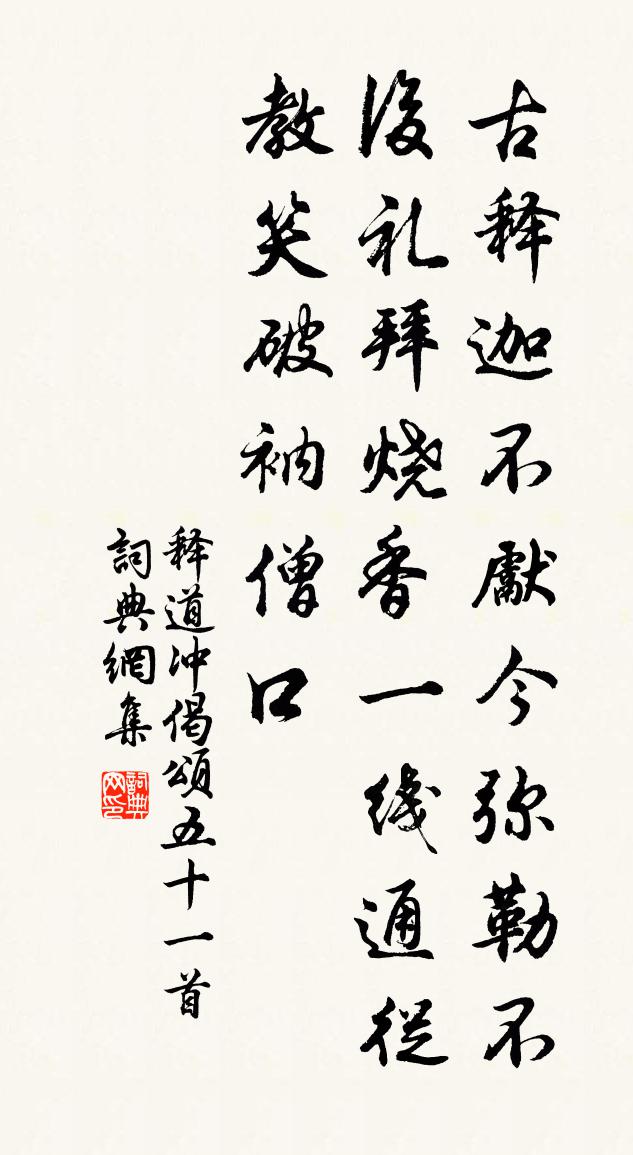 詩詞名句歷史字典書法欣賞書法字典國語詞典說文解字康熙字典古漢語字典標 題 作 者 詩 句 偈頌五十一首作者:釋道沖 朝代:宋代偈頌五十一首原文古釋迦不先,今彌勒不後。禮拜燒香一線通,從教笑破衲僧口。詩詞問答問:偈頌五十一首的作者是誰?答:釋道沖問:偈頌五十一首寫於哪個朝代?答:宋代釋道沖偈頌五十一首書法欣賞偈頌五十一首書法作品詩詞推薦將進酒楊維楨〔元代〕將進酒,舞趙婦。歌吳娘。糟床嘈嘈落紅雨,鱠刀聶聶飛瓊霜。金頭雞,銀尾羊,主人舉案勸客嘗。孟公君卿坐滿永遇樂佚名〔宋代〕試問諸公,本來模樣,如何形狀。縱使丹青,難描這個,曠劫端嚴相。無形無影,觀之不見,聽之又無響。露堂堂過江上衛博〔宋代〕失腳塵凡不易收,莫思冠佩裹狙猴。但逢司馬心相許,便似中郎賦遠遊。弱水蓬萊三萬里,仙家日月八千秋。聞名長思仙 贈零口權先生馬鈺〔元代〕出家兒。處無為。至死如同初出時。何愁道不知。內慈悲。外憨痴。絕慮忘機無執迷。刀圭有分攜。批養性存心二說宋理宗〔宋代〕方寸中涵一太虛,操存須用養工夫。瑩然鏡淨無纖翳,一性融明萬理俱。贈宿松楊明府黃滔〔唐代〕溪上家家禮樂新,始知為政異常倫。若非似水清無底,爭得如冰凜拂人。月狖聲和琴調咽,煙村景接柳條春。宦遊題太湖竹軒王之道〔宋代〕粉節儲霜競出籬,我來猶及筍生時。清風一榻君休問,明月半窗予自知。菊花天 眼王哲〔元代〕此藥神功別有名。專醫兩目多情。一點變澄清。自然仰面認得前程。更用金篦輕掠刮,便教換了塵睛。觀俗緣空朗次韻汪以南閒居漫吟十首方回〔宋代〕采芑采于田,采芹采於水。豈弟君子心,作人豈異此。神農昔嘗藥,志在起人死。百聖一樂育,亦如嘗藥然。醫國買花 / 牡丹白居易〔唐代〕帝城春欲暮,喧喧車馬度。共道牡丹時,相隨買花去。貴賤無常價,酬直看花數:灼灼百朵紅,戔戔五束素。上張宿盧岩寺張舜民〔宋代〕先生事業老空谷,弟子幾多作絳紗。鶴板當年來上國,碧岩今日屬僧家。松風生籟延虛室,瀑水噴珠綴鮮花。我有化僧求詩往宣城王洋〔宋代〕草鞋踏破世間塵,乞飯因緣不為身。一路春風好訊息,不知此事付何人。三游洞鄧深〔宋代〕詰曲山蹊晚,清冷石澗秋。三門儼呀豁,四壁極琱鎪。上穴重岩閟,中龕一室幽。斐然成五字,聊爾繼乘風。毛詩甘棠陳普〔宋代〕一時決訟憩棠陰,底事南人惜到今。德化及人仍及樹,止緣當日本根深。得餘干李尉書綠示唐人于越亭詩因以寄題梅堯臣〔宋代〕余水之于越之鄙,築基相對琵琶尾。琵琶日日有秋聲,雁過洞庭風入葦。南斗戛湖波不起,長刀剡鋒碧耳耳。姱娥和王長史臥病詩謝朓〔南北朝〕崥岫欵崇崖。派別朝洪河。兔園文雅盛。章台冠蓋多。淵襟眷睿岳。燮贊動甿歌。顧影慚騑服。載筆旅江沱。縞衣晚至松門僧舍懷寄李太祝余靖〔宋代〕日暮倦行役,解鞍初息肩。霧昏臨水寺,風勁欲霜天。蓼浦初聞雁,人家半在船。思君正怊悵,黃葉正翩翩。送右司薛員外赴處州姚合〔唐代〕懷中天子書,腰下使君魚。瀑布和雲落,仙都與世疏。遠程兼水陸,半歲在舟車。相送難相別,南風入夏初。憶秦娥王炎〔宋代〕頭如雪。塵緣滾滾無休歇。無休歇。買田築屋,是何時節。從今事事都休說。巢安寮里藏疏拙。藏疏拙。許誰為伴守犬呂徽之〔宋代〕風恬月朗眠花影,吏不敲門門恰靜。何事猛然吠一聲,有人來汲門前井。名句推薦哀蟬無留響,叢雁鳴雲霄。陶淵明《己酉歲九月九日》 松月生夜涼,風泉滿清聽。孟浩然《宿業師山房期丁大不至 / 宿業師山房待丁大不至》 未老莫還鄉,還鄉須斷腸。韋莊《菩薩蠻·人人盡說江南好》 臣子恨,何時滅!駕長車,踏破賀蘭山缺。岳飛《滿江紅·寫懷》 博學之,審問之,慎思之,明辨之,篤行之。子思《中庸·第二十章》 行非恆者,天禁之。爽事,地禁之。佚名《黃帝四經·十大經·三禁》 相看兩不厭,只有敬亭山。李白《獨坐敬亭山》 東風有恨致玄都,吹破枝頭玉,夜月梨花也相妒。周文質《小桃紅·詠桃》 不知天外雁,何事樂長征?徐禎卿《在武昌作》 學問無大小,能者為尊。李汝珍《鏡花緣·第二十三回》