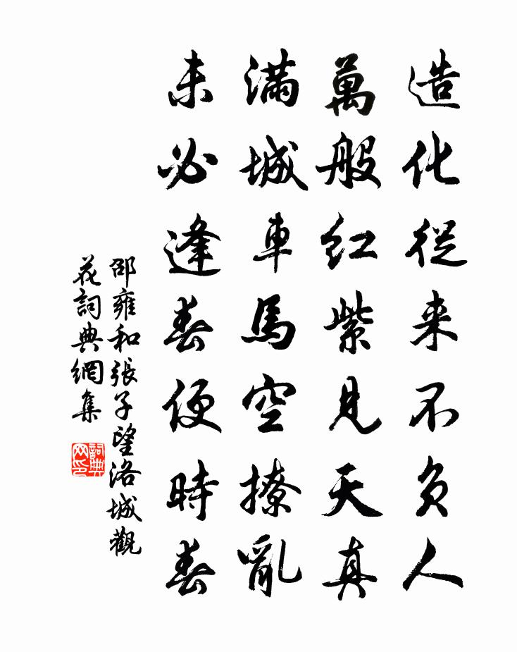 詩詞名句歷史字典書法欣賞書法字典國語詞典說文解字康熙字典古漢語字典標 題 作 者 詩 句 和張子望洛城觀花作者:邵雍 朝代:宋代和張子望洛城觀花原文造化從來不負人,萬般紅紫見天真。滿城車馬空撩亂,未必逢春便時春。詩詞問答問:和張子望洛城觀花的作者是誰?答:邵雍問:和張子望洛城觀花寫於哪個朝代?答:宋代邵雍和張子望洛城觀花書法欣賞和張子望洛城觀花書法作品詩詞推薦小雪後書事陸龜蒙〔唐代〕時候頻過小雪天,江南寒色未曾偏。楓汀尚憶逢人別,麥隴唯應欠雉眠。更擬結茅臨水次,偶因行藥到村前。鄰翁春寒·漫脫春衣浣厲鶚〔清代〕漫脫春衣浣酒紅,江南二月最多風。梨花雪後酴醿雪,人在重簾淺夢中。失鶴陳允平〔宋代〕頂上新成九轉丹,銜花日日到詩壇。夜深飛上雲霄去,華表月明風露寒。香澗老衲示似玉林首介極道竹溪宴月之樂玉林史彌寧〔宋代〕長松翠竹拱晴波,不飲其如月色何。珍重阿連能好事,高軒攜酒夜深過。和無在木蛇歌釋慧空〔宋代〕小小蛇兒大大身,曾吞眾象空巴陵。歸蟠故山骨欲槁,混入草木人要徵。瞎屢生,甚手腳,不善提持休捉摸。枯木詠史宋祁〔宋代〕一馬浮江擁瑞圖,青規群彥掎長裾。本緣獻替居門下,不為江蝦與{上制下魚}魚。春晚寄盧使君貫休〔唐代〕滿郭春如畫,白堂心自澄。禪拋金鼎藥,詩和玉壺冰。白雨飄花盡,晴霞向閣凝。寂寥還得句,因寄柳吳興。過繁昌陳造〔宋代〕江山互映帶,竹樹渺隱見。居人江山閒,安處忘古縣。泊舟穴子初,舊觀儼自薦。{山盍}山高攙雲,雲際抹深靛郊行即事程顥〔宋代〕芳原綠野恣行時,春入遙山碧四圍。興逐亂紅穿柳巷,困臨流水坐苔磯。莫辭盞酒十分勸,只恐風花一片飛。況是己卯十月一日至燕越五日罹狴犴有感而賦文天祥〔宋代〕風霜陰忽忽,天地澹悠悠。我自操吳語,誰來問楚囚。寂中惟滅想,達處盡忘憂。手有韋編在,朝聞夕死休。頌古一百二十一首釋宗杲〔宋代〕天地同根伸一問,未曾抬步已亡家。無陰陽處華重發,玉本無瑕卻有瑕。齋祠湖上作張嵲〔宋代〕還山映平湖,未厭傷極目。籃輿值初晴,步步轉湖曲。宿霧郁喬林,寒曦煦穹谷。廢剎今幾時,浮圖在山腹。村荒寄子堂舒岳祥〔宋代〕知君不寂寞,禪悅只空房。書卷依經藏,吟聲繞寺廊。早霜狸面白,新酒菊花黃。共此山家景,西峰隔夕陽。江寧府園示元度王安石〔宋代〕畫船南北水遙通,日暮幅巾篁竹中。行到月台逢翠碧,背人飛過子城東。送子仁侄南歸而首楊萬里〔宋代〕再歲來相嘆,三杯忽語離。忍將垂老淚,滴作送行詩。子去儂猶住,身留夢亦隨。南溪舊風月,千萬寄相思。木蘭花慢 以上振綺堂刻本趙待制遺稿。朱本趙雍〔元代〕恨匆匆賦別,回首望,一長嗟。記執手臨流,遲遲去馬,浩浩平沙。此際黯然腸斷,柰一痕、明月兩天涯。南去孤又和蔡子直蘇頌〔宋代〕官局誠俱冷,交盟信不寒。風霜兩鬢白,冰櫱一心丹。未剖方州竹,猶熏畫省蘭。北宮陪論定,應似漢丁桓。調笑晁補之〔宋代〕鸞天漢津。恍如夢覺空江暮。雲雨無蹤珮何處。君非玉斧望歸來,流水桃花定相誤相誤。空凝佇。鄭子江頭逢二女次韻邢懷正通判游蔣山周必大〔宋代〕仙人薄蓬萊,乘槎度河滸。舊觀桑田變,今訪鐘山古。駕言出東門,恍若之帝所。朝曦霽青霜,楓葉落紅雨。亭亭送張甥赴青州幕王安石〔宋代〕人情每期費,之子適予心。老餞城東陌,悲分歲暮襟。少留班露草,遂往隔雲林。未筧青丘遠,因風嗣好音。名句推薦掃眉才子知多少,管領春風總不如。王建《寄蜀中薛濤校書》 滿目飛花萬點,回首故人千里,把酒沃愁腸。葛長庚《水調歌頭·江上春山遠》 白雲千里萬里,明月前溪後溪。劉長卿《謫仙怨·晴川落日初低》 醉別江樓橘柚香,江風引雨入舟涼。王昌齡《送魏二》 莫道不銷魂,簾卷西風,人比黃花瘦。李清照《醉花陰·薄霧濃雲愁永晝》 歸來報名主,恢復舊神州。岳飛《送紫岩張先生北伐》 竹影和詩瘦,梅花入夢香。王庭筠《絕句·竹影和詩瘦》 寒鴉飛數點,流水繞孤村。楊廣《失題》 楝花飄砌。蔌蔌清香細。謝逸《千秋歲·詠夏景》 不誘於譽,不恐於誹,率道而行,端然正己。荀子《荀子·非十二子》