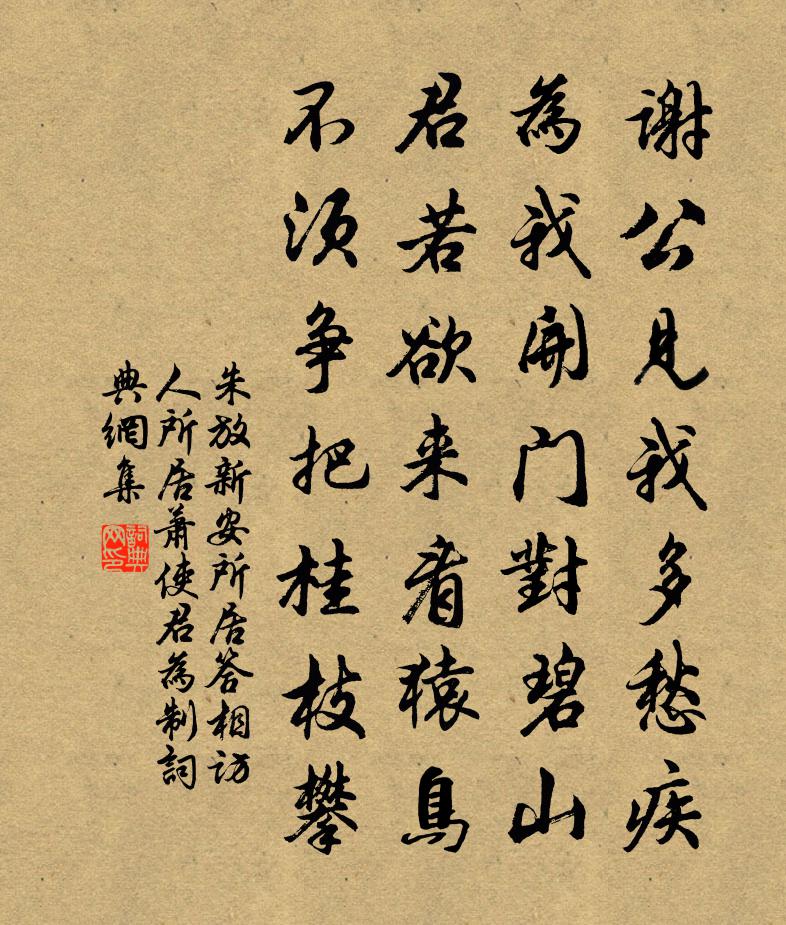 詩詞名句歷史字典書法欣賞書法字典國語詞典說文解字康熙字典古漢語字典標 題 作 者 詩 句 新安所居答相訪人所居蕭使君為制作者:朱放 朝代:唐代原文謝公見我多愁疾,為我開門對碧山。君若欲來看猿鳥,不須爭把桂枝攀。詩詞問答問:《新安所居答相訪人所居蕭使君為制》的作者是誰?答:朱放問:該詩寫於哪個朝代?答:唐代問:該詩是什麼體裁?答:七絕書法欣賞新安所居答相訪人所居蕭使君為制書法作品注釋全唐詩:卷315-23詩詞推薦峴山亭易士達〔宋代〕峴山亭是昔人非,忍讀羊公墮淚碑。回首山翁花下處,淒淒芳草晚風悲。小本蘭亭二種方回〔宋代〕子云可擬易論無,頗似蘭亭細字模。始信聖經非小藝,不羞依樣畫葫蘆。庚寅元夕月當蝕雨作不見明日奚相士索詩書此黎廷瑞〔宋代〕月中八萬四千宮,不管妖蟆啖老瞳。白兔藥成無用處,墨龍雲上有奇功。且忻玉宇瓊樓在,莫恨銀花火樹空。自古竹馬子·登孤壘荒涼柳永〔宋代〕登孤壘荒涼,危亭曠望,靜臨煙渚。對雌霓掛雨,雄風拂檻,微收煩暑。漸覺一葉驚秋,殘蟬噪晚,素商時序。覽次韻張濟川二首李若水〔宋代〕父老霑襟訟不平,千岩鬼哭亂泉聲。烏鳶誤飽忠義肉,點檢戰功誰眼明。蒙齋習庵皆有詩在慈雲閣沈端憲又有記文刻石陳著〔宋代〕景照堂中憩佛騷,闌乾憑處接雲高。賦詩時會苦吟甫,破約難留嗜酒陶。步虛詞·青溪道士人高駢〔唐代〕青溪道士人不識,上天下天鶴一隻。洞門深鎖碧窗寒,滴露研朱寫周易。題鹿田西寺壁吳琳〔宋代〕為從吏隱招提宿,相望城中隔幾塵。雲暗雨來疑是晚,山深寒在不知春。鋤松得石添幽徑。接竹通泉隔近鄰。此去子規潘牥〔宋代〕一聲啼破萬山雲,我正思歸自喜聞。莫向貴人庭樹下,王孫金彈不饒君。寒食雨二首蘇軾〔宋代〕自我來黃州,已過三寒食。年年欲惜春,春去不容惜。今年又苦雨,兩月秋蕭瑟。臥聞海棠花,泥污胭脂雪。暗中志峽船具詩梢王周〔唐代〕制之居首尾,俾之辨斜正。首動尾聿隨,斜取正為定。有如提吏筆,有如執時柄。有如秉師律,有如宣命令。守彼和三鄉詩高衢〔唐代〕南北千山與萬山,軒車誰不思鄉關。獨留芳翰悲前跡,陌上恐傷桃李顏。和洪司令梅花吳泳〔宋代〕素肌香骨水為寒,曲樹斜枝木作酸。百匝繞花看未足,庭代參斗夜闌乾。秋色吳融〔唐代〕染不成乾畫未銷,霏霏拂拂又迢迢。曾從建業城邊路,蔓草寒煙鎖六朝。初伏休沐宋祁〔宋代〕伏時詔休偃,閉門謝朋儕。羲和挾昇陽,曉氣紅崔嵬。炎林欝歊露,焦原橫赭埃。怒甚崒崒雲,旱始隆隆雷。況我步蟾宮(九月二十六夜宿周師從家。睡覺,風雨起,有懷木犀)楊無咎〔宋代〕桂花馥郁清無寐。覺身在、廣寒宮裡。憶吾家、妃子舊遊,瑞龍腦、暗藏葉底。不堪午夜西風起。更颭颭、萬絲斜贈隱者薛能〔唐代〕自得高閒性,平生向北棲。月潭雲影斷,山葉雨聲齊。庭樹人書匝,欄花鳥坐低。相留永不忘,經宿話丹梯。讀笠澤叢書三首楊萬里〔宋代〕松江縣尹送圖經,中有唐詩喜不勝。看到燈青仍火冷,雙眸如割腳如冰。初夏姜特立〔宋代〕松花金粉落,荷葉翠鈿浮。啼鵙千山暮,一年春事休。與子仁登天柱岡,過胡家塘蒪塘歸東園四首楊萬里〔宋代〕數間茅屋傍山根,一隊兒童出竹門。只愛行穿楊柳渡,不知失卻李花村。名句推薦節用儲蓄,以備凶災范曄《後漢書·本紀·肅宗孝章帝紀》 長風萬里送秋雁,對此可以酣高樓。李白《宣州謝朓樓餞別校書叔雲 / 陪侍御叔華登樓歌》 幾多情,無處說,落花飛絮清明節。魏承班《漁歌子·柳如眉》 春色惱人眠不得,月移花影上欄乾。王安石《春夜》 衰蘭送客鹹陽道,天若有情天亦老。李賀《金銅仙人辭漢歌》 當君懷歸日,是妾斷腸時。李白《春思》 理貴有中,不必過厚李大師、李延壽《南史·列傳·卷十八》 風住塵香花已盡,日晚倦梳頭。李清照《武陵春·春晚》 三更月。中庭恰照梨花雪。賀鑄《子夜歌·三更月》 花氣襲人知驟暖,鵲聲穿樹喜新晴。陸游《村居書喜》