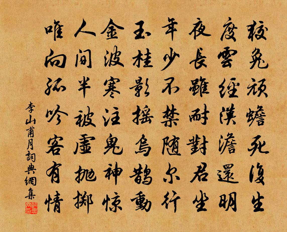 詩詞名句歷史字典書法欣賞書法字典國語詞典說文解字康熙字典古漢語字典標 題 作 者 詩 句 月作者:李山甫 朝代:唐代月原文狡兔頑蟾死復生,度雲經漢澹還明。夜長雖耐對君坐,年少不禁隨爾行。玉桂影搖烏鵲動,金波寒注鬼神驚。人間半被虛拋擲,唯向孤吟客有情。詩詞問答問:月的作者是誰?答:李山甫問:月寫於哪個朝代?答:唐代問:月是什麼體裁?答:七律李山甫月書法欣賞月書法作品注釋全唐詩:卷643-3詩詞推薦見遠亭鄭俠〔宋代〕天邊毫末見千峰,景物都窮見不窮。因念當時小天下,亦如亭上老仙翁。題梅四首袁甫〔宋代〕雪欺梅耶,抑梅欺雪。孤高之操,凜凜清絕。一叢花楊無咎〔宋代〕娟娟□月可庭方。窗戶進新涼。美人為我歌新曲,翻身調、韻超出宮商。犀箸細敲,花瓷清響,餘韻繞紅梁。風流玉照堂觀梅二十首張鎡〔宋代〕蒼帝妃嬪總素裝,勝游常是遍江鄉。玉樓謫墮遲歸去,冷淡工夫笑我忙。鄜州留別王從事李頻〔唐代〕相識未十日,相知如十年。從來易離別,此去忽留連。路險行沖雨,山高度隔天。難終清夜坐,更聽說安邊。客信豐寄劉起潛鄧有功〔宋代〕嶺南咫尺莫如虔,和暖嚴寒別有天。一夜詩魂清到骨,曉霜封卻釣魚船。如夢令王沂孫〔宋代〕妾似春蠶抽縷。君似箏弦移柱。無語結同心,滿地落花飛絮。歸去。歸去。遙指亂雲遮處。題城山掛月堂壁范成大〔宋代〕百疊煙鬟得眼明,坐來心跡喜雙清。秋陽滿地西風起,猶有啼鶯四五聲。蝶戀花陳允平〔宋代〕寂寞長亭人別後。一把垂絲,亂拂閒軒牖。三月春光濃似酒。傳懷莫放纖縴手。金縷依依紅日透。舞徹東風,不減送瓜與胡原仲劉子翬〔宋代〕呼兒急走送筠籃,敵暑惟應此物堪。一握青瑤含秀潤,滿襟寒雪沍清甘。搔園底用修鄰怨,剪棘聊應益盜慚。它日和陶勸農六首蘇軾〔宋代〕天下假易,亦不汝匱。春無遺勤,秋有厚冀。雲舉雨決,婦姑畢至。我良孝愛,袒跣何媿。滿江紅(洪雲岩、劉朔齋用韻)李曾伯〔宋代〕蝶夢驚殘,仿佛似、東方才白。人報導、城疑不夜,界幾無色。敲瓦微聽冰線響,開窗倏放風花入。擁重貂、曾不留汪子明徐瑞〔宋代〕美人渺渺隔秋水,六年不見心茫茫。麥昴黍低各自媚,鶴長鎬短庸何傷。荷鑰未未素業在,讀憶具來真味長。是間罷鏡李益〔唐代〕手中青銅鏡,照我少年時。衰颯一如此,清光難復持。欲令孤月掩,從遣半心疑。縱使逢人見,猶勝自見悲。太皇太后輓詞張耒〔宋代〕坐安民物由修己,默合神明為至公。他日已占懷月夢,後來方信補天功。四時化育坤無事,六合清明日正中。九載送徐正時之官贛州四首曹勛〔宋代〕報導君乘六月潮,在齊端可比聞韶。探湯劇暑不易度,應喜南雲瞻玉霄。暮春書懷寄董正翁寺正舒岳祥〔宋代〕尋春曾作太平民,說著花時淚濕巾。風雨差池桃杏過,山林牢落鳥烏親。書中悶見傷心事,畫裡思逢避世人。霄漢望遠行黃庭堅〔宋代〕自見花來,虛過花卻、好時好日。這訑尿粘膩得處煞是律。據眼前言定,也有十分七八。冤我無心除告佛。花人閒覽柳渾汀洲采白蘋之什因成一章徐夤〔唐代〕采盡汀蘋恨別離,鴛鴦總雙飛。月明南浦夢初斷,花落洞庭人未歸。天遠有書隨驛使,夜長無燭照寒機。年來泣淚題山居十絕梅澗胡仲弓〔宋代〕今昨孤山迥不同,逋仙誰與管春風。暗香疎影無尋處,元在冷冷一澗中。名句推薦父兄教子弟,必正其身以率子,無庸徒事言詞也。王永彬《圍爐夜話·第三三則》 芳原綠野恣行事,春入遙山碧四圍。程顥《郊行即事》 小童疑是有村客,急向柴門去卻關。崔道融《溪居即事》 人道惡盈而好謙。佚名《易傳·彖傳上·謙》 上邪,我欲與君相知,長命無絕衰。佚名《上邪》 石卵不敵。蛇龍不鬥。馮夢龍《警世通言·卷九》 歲寒,然後知松柏之後凋也。孔子弟子《論語·子罕篇》 儻寄相思字,愁人定解顏。錢起《送夏侯審校書東歸》 晝短苦夜長,何不秉燭游!佚名《生年不滿百》 力拔山兮氣蓋世。時不利兮騅不逝。項羽《垓下歌》