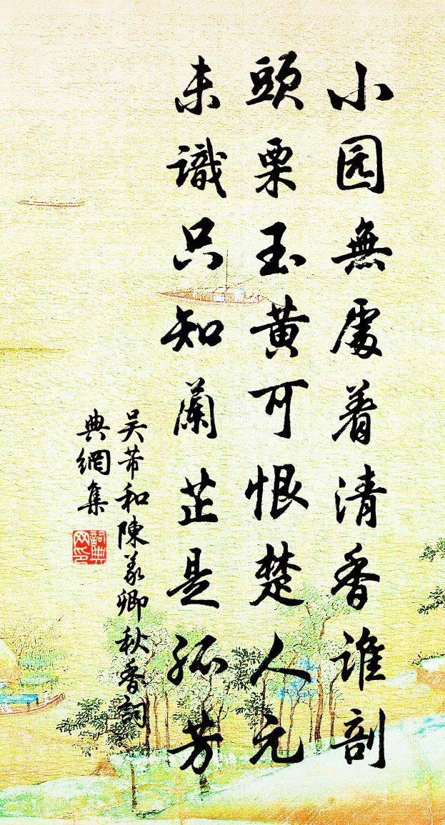 詩詞名句歷史字典書法欣賞書法字典國語詞典說文解字康熙字典古漢語字典標 題 作 者 詩 句 和陳義卿秋香作者:吳芾 朝代:宋代和陳義卿秋香原文小園無處著清香,誰剖頭栗玉黃。可恨楚人元未識,只知蘭芷是孤芳。詩詞問答問:和陳義卿秋香的作者是誰?答:吳芾問:和陳義卿秋香寫於哪個朝代?答:宋代吳芾和陳義卿秋香書法欣賞和陳義卿秋香書法作品詩詞推薦春閨羅鄴〔唐代〕愁坐蘭閨日過遲,捲簾巢燕羨雙飛。管弦樓上春應在,楊柳橋邊人未歸。玉笛豈能留舞態,金河猶自浣戎衣。梨花直宿省中鄭獬〔宋代〕娟娟海棠花,小蕊春來瘦。斑斑青竹枝,疏葉未生就。碧砌畫欄乾,雨斷黃昏後。厭酒未能眠,時拾殘花嗅。換追風/浣溪沙賀鑄〔宋代〕掌上香羅六寸弓。雍容胡旋一盤中。目成心許兩匆匆。別夜可憐長共月。當時曾約換追風。草生金埒畫堂空。答元珍見贈孔武仲〔宋代〕汴柳氎氎綠蔽河,春城旅舍數相過。一聞高論煩襟豁,更捧新詩雅貺多。清鑒欲回荊玉價,蕪音難斷郢人歌。儒林題義門胡氏華書院許堅〔唐代〕盡說靈蹤妨畫圖,幽奇高尚義群居。山林總是神仙隱,禮樂爰修周孔書。解駕十年惟壯士,擔簦千里結名廬。功成同和詠樓前海石榴二首孫逖〔唐代〕客自新亭郡,朝來數物華。傳君妓樓好,初落海榴花。露色珠簾映,香風粉壁遮。更宜林下雨,日晚逐行車。海上鷓鴣天魏了翁〔宋代〕誰把璇璣運化工。參旗又掛玉梅東。三三律琯聲餘亥,九九玄經卦起中。新歲月,舊遊從。一觴還似去年冬。人間送叔規李石〔宋代〕鳳台卻望桑麻川,殘僧孤客同一年。我窮自取君更苦,只有布襪青行纏。松楠陰 * 邊寺,一餉欵尋香火緣。筆端禮投子青禪師塔釋正覺〔宋代〕塔藏玉骨,雲抱山腰。跡塵外泯,道光內昭。度金針之玉線,續鳳弦之鸞膠。壺春在而花芳枯木,夜鶴鳴而月浸孤滁上謫居王禹偁〔宋代〕跡忝詞林舊,官為郎署卑。同群甘鳥獸,苟祿為妻兒。未有一事立,空驚雙鬢衰。唯憐文集裡,添得謫官詩。病起釋雲岫〔宋代〕病起稜層骨數莖,盡情提挈強為生。思量襏襫當年事,道在大雄山上行。病中王銍〔宋代〕遙夜支頤坐,春醪負十分。碧煙沈宿靄,清月入微雲。真妄怯多病,翔潛喜不聞。秋韃人樂處,十載愴離群。和陶淵明飲酒二十首方回〔宋代〕高台翳榛棘,荷鍤岡路開。振衣陟雲端,朗然豁秋懷。言念半死樹,類我晚節乖。風雷劈半腹,葉落禽不棲。幸不采芹亭方蒙仲〔宋代〕屈指夫容次第開,典衣去買海棠栽。溪邊堪插荷花否,便可四時攜酒來。即事樓鑰〔宋代〕雨外山光淡,煙中草色鮮。斷橋依古岸,流水自斜川。紫椹余桑表,青藤繞樹顛。人情兼物態,只合付天然。周浦道中釋行海〔宋代〕淺蘆深葦雨叢叢,一浦潮來一浦風。船傍水籬門外過,數聲白犬吠魚翁。夢得墨四片一差短戲呈廷玉仇遠〔宋代〕昔賢曾夢筆,夢墨定何如。應使山中隱,重研世上書。磨人驚老大,飲汁笑空疏。長短無庸較,三螺已有餘。古松感興皇甫松〔唐代〕皇天后土力,使我向此生。貴賤不我均,若為天地情。我家世道德,旨意匡文明。家集四百卷,獨立天地經。寄言吳仲庶殿院寄示與呂沖之馬仲塗唱和詩六篇邀梅堯臣〔宋代〕出舟湖渺渺,月白絕纖氛。已見水如監,莫生波上雲。獨征何慕侶,冷酌不知醺。露下清吟久,同心本愛君。偈頌一百五十首釋心月〔宋代〕把手同歸者,琅琅笑語新。移身藏北斗,舉步入南辰。少室殘冬雪,武林三月春。轆轤千萬偈,頑石兩眉伸。名句推薦不求見面惟通謁,名紙朝來滿敝廬。文徵明《拜年》 寧添一斗,莫添一口。佚名《增廣賢文·上集》 當斷不斷,反受其亂。司馬遷《史記·齊悼惠王世家》 獨自淒涼還自遣,自製離愁。龔自珍《浪淘沙·寫夢》 佳辰強飲食猶寒,隱几蕭條戴鶡冠。杜甫《小寒食舟中作》 君子無入而不自得焉。子思《中庸·第十四章》 非我而當者,吾師也;是我而當者,吾友也。荀子《荀子·修身》 因風吹火,用力不多。佚名《增廣賢文·上集》 過江千尺浪,入竹萬竿斜。李嶠《風》 大道之行也,天下為公。戴聖《禮記·禮運》