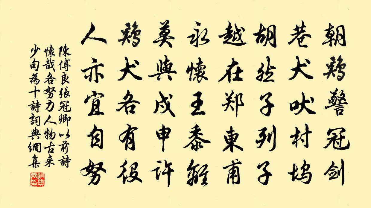 詩詞名句歷史字典書法欣賞書法字典國語詞典說文解字康熙字典古漢語字典標 題 作 者 詩 句 張冠卿以前詩懷哉各努力人物古來少句為十詩作者:陳傅良 朝代:宋代原文朝雞警冠劍,巷犬吠村塢。胡然子列子,越在鄭東甫。永懷王黍離,莫與戍申許。雞犬各有役,人亦宜自努。詩詞問答問:《張冠卿以前詩懷哉各努力人物古來少句為十詩》的作者是誰?答:陳傅良問:該詩寫於哪個朝代?答:宋代書法欣賞張冠卿以前詩懷哉各努力人物古來少句為十詩書法作品詩文賞析【原題】:張冠卿以前詩懷哉各努力人物古來少句為十詩見寄次韻奉酬詩詞推薦奉和始平公憶東平司馬光〔宋代〕相印東臨汶水陽,兩看春葉與秋霜。登山置酒延鄒湛,上馬回鞭問葛強。溪竹低垂寒滴翠,露荷相倚淨交香。宵衣九日陪崔郎中北山宴嚴維〔唐代〕上客南台至,重陽此會文。菊芳寒露洗,杯翠夕陽曛。務簡人同醉,溪閒鳥自群。府中官最小,唯有孟參軍。宮詞四首吳百生〔宋代〕阿嬌金屋閉,群玉奉龍舉。夜色明光酒,春風長信裾。傳宣嚴伏合,應侍冶容虛。笑簇嫣然地,名花總不如。泛湖歸出樓中望月詩謝惠連〔南北朝〕日落泛澄瀛。星羅游輕橈。憩榭面曲汜。臨流對回潮。輟策共駢筵。並坐相招要。哀鴻鳴沙渚。悲猿響山椒。亭亭送涪守何常卿十六韻馮時行〔宋代〕一時周屏翰,千載漢循良。寵渥分民社,疲羸賴紀綱。洪恩隨雨潤,令問與風翔。日月流年駛,江山別恨長。已聞紹興祀皇地祗十五首佚名〔宋代〕於穆媼神,媲德彼天。我修毖祀,以莫不虔。肆陳時夏,乾羽相宣。靈其來游,降福綿綿。馬嵬賈島〔唐代〕長川幾處樹青青,孤驛危樓對翠屏。一自上皇惆悵後,至今來往馬蹄腥。秧馬歌(並引)蘇軾〔宋代〕過廬陵,見宣德郎致仕曾君安止,出所作《禾譜》。文既溫雅,事亦詳實,惜其有所缺,不譜農器也。予昔游武昌同崔峒補闕慈恩寺避暑盧綸〔唐代〕寺涼高樹合,臥石綠陰中。伴鶴慚仙侶,依僧學老翁。魚沉荷葉露,鳥散竹林風。始悟塵居者,應將火宅同。送陳宗諭進叔晉接赴慶元添卒及乃弟泰來四首王邁〔宋代〕若見青山老,煩言仆寄聲。人新無好況,依舊是狂生。國事今如許,庸醫見亦驚。不知靈壽杖,還解拄天傾。范增徐鈞〔宋代〕項王暴不減強秦,一語箴規總未聞。白首尚嫌君不忍,料知增更忍於君。漁父詞(和玄真子)孫銳〔宋代〕平湖千頃浪花飛。春後銀魚霜更肥。菱葉飯,蘆花衣。酒酣載月忙呼歸。奉和龜翁送別施樞〔宋代〕為說吟邊事,曾陪宴笑頻。自慚無韻者,敢對有名人。雨洗秦山曉,波明鏡水春。匆匆還別去,芳草正如茵。次韻徐仲車喜董元達訪之作南郭篇四韻黃庭堅〔宋代〕董侯從軍來,意望名不朽。款門拜徐公,在德不在酒。徐公雖避俗,對客輒粲然。耳不聞世事,時誦陶令篇。擣衣曲熊禾〔宋代〕北望肉悠悠音信肉少,空房肉念遠心常肉早。流螢煜煜夜稍清,寒雁嗈嗈寒已到。細絲清水練方新,在椸半濕日中句李建中〔宋代〕晴山雲罨畫,孤嶼水含稜。哭徐山民翁卷〔宋代〕已是窮侵骨,何期早喪身。分明上天意,磨折苦吟人。花色連晴晝,鶯聲在近鄰。誰憐三尺像,猶帶瘦精神。朝中措朱敦儒〔宋代〕夜來聽雪曉來看。驚失卻塵寰。搖撼瓊林玉樹,心疑身是仙官。乘風縹緲,凌空徑去,不怕高寒。卻被孤鴻相勸,醉桃源/阮郎歸楊 * 〔宋代〕大都修煉似蒸沙。陰陽失兩家。正如飛鱉舞長蛇。寧知飲月華。回老貌,假群娃。熏蒸成絳霞。但教心地不傾斜。虞丞相輓詞三首楊萬里〔宋代〕保奭方為左,希文自請西。不勞三尺劍,已辦一丸泥。已矣歸黃壤,傷哉夢白雞。清風誰作誦,何石不天齊?名句推薦遠樹帶行客,孤城當落暉。王維《送綦毋潛落第還鄉 / 送別》 遠岫出山催薄暮,細風吹雨弄輕陰。李清照《浣溪沙·小院閒窗春色深》 野戰格鬥死,敗馬號鳴向天悲。李白《戰城南》 古剎疏鍾度,遙嵐破月懸。李賀《南園十三首》 君歌楊叛兒,妾勸新豐酒。李白《楊叛兒》 樹挪死,人挪活。佚名《增廣賢文·下集》 惟有樓前流水,應念我、終日凝眸。李清照《鳳凰台上憶 * ·香冷金猊》 獨立揚新令,千營共一呼。盧綸《和張僕射塞下曲·其一》 漢臣曾此作縲囚,茹血衣毛十九秋。汪遵《詠北海》 花謝花飛花滿天,紅消香斷有誰憐。曹雪芹《紅樓夢·第二十七回》