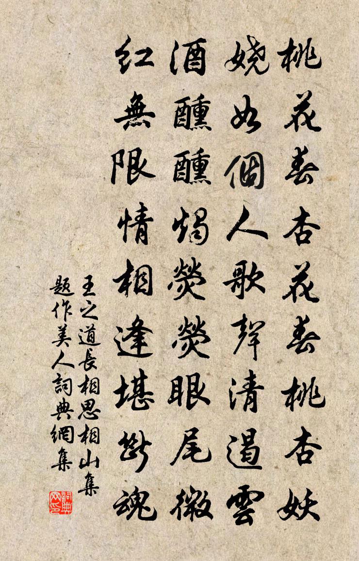 詩詞名句歷史字典書法欣賞書法字典國語詞典說文解字康熙字典古漢語字典標 題 作 者 詩 句 長相思(相山集題作美人)作者:王之道 朝代:宋代長相思(相山集題作美人)原文桃花春。杏花春。桃杏妖嬈如個人。歌聲清遏雲。酒醺醺。燭熒熒。眼尾微紅無限情。相逢堪斷魂。詩詞問答問:長相思(相山集題作美人)的作者是誰?答:王之道問:長相思(相山集題作美人)寫於哪個朝代?答:宋代王之道長相思(相山集題作美人)書法欣賞長相思(相山集題作美人)書法作品詩詞推薦梁鞞舞歌 明之君 一沈約〔南北朝〕七梁七百始。天監三元初。聖功澄宇縣。帝德總車書。熙熙億兆臣。其志皆歡愉。被旨許浦蒐兵道中凍合舍舟行陸二首袁說友〔宋代〕已辦輕舟著腳登,笑渠河伯故陰凝。徵車政欲周阡陌,贏得天教一夜冰。鵲橋仙姬翼〔元代〕天真靈種。華胥入夢。趣取人間無用。玄珠天府密封藏,誓不敢、紅塵賣弄。麾軍齊哄。聲音迎送。饒取威嚴尊重夏日山居好十首舒岳祥〔宋代〕夏日山居好,清溪一笛風。瘦軀便褐短,寡發愛梳忪。細雨明歸鷺,斜陽飲遠虹。有時吟未穩,飲步自書空。滬上雜書何紹基〔清代〕新閘才開老閘過,樓台金碧照江波。愁風悶雨人無寐,海國平分鬼氣多。謁金門陳克〔宋代〕春寂寂。綠暗溪南溪北。溪水沈沈天一色。鳥飛春樹黑。腸斷小樓吹笛,醉里看朱成碧。愁滿眼前遮不得。可憐雙用韻送夔師何侍郎以待制奉祠東歸項安世〔宋代〕萬念頭頭灰冷,三田日日春妍。曉起珠岩漱瀑,夜深玉海升煙。用前韻留琴窗文天祥〔宋代〕百年矛上淅,萬事枕中炊。病苦還思老,貪嗔未若痴。雲低天欲動,江長岸如馳。明月西風健,山頭賦別詩。又登碧雲亭感懷三十首吳芾〔宋代〕晚上危亭喜有秋,民安物阜本無憂。鈴齋坐嘯雖多暇,爭似歸田得自由。鳥夜啼 閒適劉敏中〔元代〕日長誰伴中庵。太初*。靜掃閒庭,獨自看晴嵐。嵐翠滴。雲影濕。雨聲酣。欲借昌黎老筆,賦終南。冬夜即事曾鞏〔宋代〕印奩封罷閣鈴閒,喜有秋毫免素餐。市粟易求倉廩實,邑尨無警里閭安。香清一榻氍毹暖,月淡千門霿凇寒。聞說夏秋之交小舟早夜往來湖中絕句陸游〔宋代〕雞頭累累如大珠,紅草綠荷風味殊。天與楊梅成二絻,吾鄉獨有異鄉無。讀楊文公集蘇頌〔宋代〕文公名節冠當年,沒世清風更凜然。梁父舊廬空德里,西州華屋慟時賢。平生奏御三千牘,不朽文章二百篇。瀟灑二月二日大雪喻良能〔宋代〕磬湖二月雪,寒氣故裴回。面市連天合,銀花照眼開。送窮窮不去,招隱隱難來。幸有曲生在,何妨略恥罍。室空釋文珦〔宋代〕室空無侍者,坐臥一團蒲。但見朝還暮,焉知榮與枯。山心便寂寞,天籟聽喁於。雲外幽人好,時來問老夫。僧正倚大師庵居曾鞏〔宋代〕蘭裓方袍振錫回,結茅蕭寺遠塵埃。五峰日破朝雲出,三谷花浮澗水來。風散異香禪榻靜,鳥窺清唄法筵開。因過憶長安。四月丘丹〔唐代〕憶長安,四月時,南郊萬乘旌旗。嘗酎玉卮更獻,含桃絲籠交馳。芳草落花無限,金張許史相隨。滿江紅李壁〔宋代〕次韻上呈,並以寄洋州也簾卷東風,□林外、鳥啼姑惡。政迤邐、花梢紅綻,柳梢黃著。散策丘園容懶□,折衝樽元夕范成大〔宋代〕粉痕紅點萬花攢,玉氣珠光寶月團。簾箔通明香似霧,東君無處著春寒。行路難三首顧況〔唐代〕君不見擔雪塞井空用力,炊砂作飯豈堪食。一生肝膽向人盡,相識不如不相識。冬青樹上掛凌霄,歲晏花凋樹不凋名句推薦言之易,行之難呂不韋《呂氏春秋·論·不苟論》 憐不可存,憐人者無證其忠。友宜重懲,援友者惟其害。來俊臣《羅織經·問罪卷第十》 惶恐灘頭說惶恐,零丁洋里嘆零丁。文天祥《過零丁洋》 朝作輕寒暮作陰,愁中不覺已春深。屈大均《壬戌清明作》 縱然生得好皮囊,腹內原來草莽。曹雪芹《紅樓夢·第三回》 人學始知道,不學亦徒然。佚名《增廣賢文·上集》 晚年唯好靜,萬事不關心。王維《酬張少府》 脫衣換得商山酒,笑把離騷獨自傾。王禹偁《清明日獨酌》 臨砌影,寒香亂、凍梅藏韻。吳文英《花犯·郭希道送水仙索賦》 昨夜雨疏風驟,濃睡不消殘酒。李清照《如夢令·昨夜雨疏風驟》