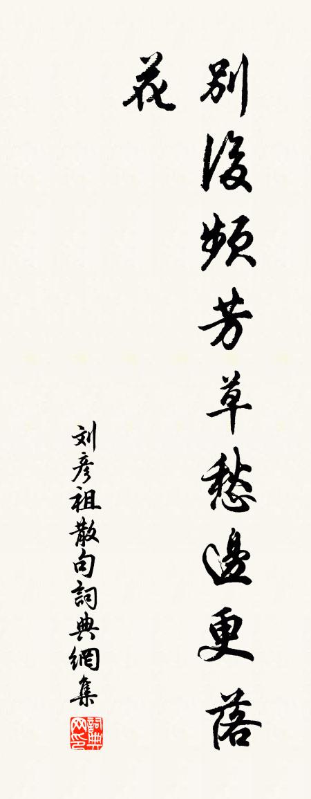 詩詞名句歷史字典書法欣賞書法字典國語詞典說文解字康熙字典古漢語字典標 題 作 者 詩 句 句作者:劉彥祖 朝代:宋代句原文別後頻芳草,愁邊更落花。詩詞問答問:句的作者是誰?答:劉彥祖問:句寫於哪個朝代?答:宋代劉彥祖句書法欣賞句書法作品詩詞推薦南郊慶成歐陽修〔宋代〕祀教民昭孝,天惟德是親。太宮嚴大饗,吉土兆精禋。禮樂三王盛,梯航萬國賓。恩沾群動洽,慶與一陽新。奉冊效王建詩體三首趙希丙〔宋代〕王釵半落珊瑚枕,金屋低垂翡翠簾。莫喚女醫來問病,逢春自是可曾忺。春野五首宋庠〔宋代〕衡蓽負城開,春兼野色來。煙扶霽日柳,雪惱故年梅。波影魚先動,林聲鳥並催。欣欣群意悅,病骨獨邅回。贈送澶州監酒稅劉銓殿直晁補之〔宋代〕頓丘淇水雄朔方,官收榷算資公藏。晨朝百販羅庭堂,望門逆鼻聞椒漿。惜哉劉子氣方剛,峨冠凜凜頎而揚。丈夫金陵有美堂梅堯臣〔宋代〕李白愛山如洛陽,三杯為歌愁日長。廢基台殿不可識,玉燕舊棲王謝堂。公來碧瓦起棟宇,羅列圖畫牙作床。池頭浣溪沙吳潛〔宋代〕雨過池堂水長芽。放開晴日正宣花。十洲三島撰繁華。水畔麗人唐客恨,山陰佳客晉人懷。可憐雲蕊與風葩。然公發人自天台來不以烏藥見寄晁說之〔宋代〕石橋不得往,烏藥不寄來。空令圖畫裡,指點說天台。白紵歌謝翱〔宋代〕江頭蓬沓走吳女,浣水為花朝浣紵。晝隨睛網曬日中,夜覆井闌飄白露。織成素雪裁稱身,夫為吳王戍柏舉。田家少年游歐陽修〔宋代〕綠雲雙嚲插金翹。年紀正妖饒。漢妃束素,小蠻垂柳,都占洛城腰。錦屏春過衣初減,香雪暖凝消。試問當筵眼波謁金門晏殊〔宋代〕秋露墜。滴盡楚蘭紅淚。往事舊歡何限意。思量如夢寐。人貌老於前歲。風月宛然無異。座有嘉賓尊有桂。莫辭終送高郎中北使杜審言〔唐代〕北狄願和親,東京發使臣。馬銜邊地雪,衣染異方塵。歲月催行旅,恩榮變苦辛。歌鐘期重錫,拜手落花春。別趙運使二首彭龜年〔宋代〕君子豈無欲,有欲未足憂。百計護此短,此心尚可求。向來畏人言,言者不肯休。不畏固未可,無言我誰尤。事當早發交崖山還太室作崔曙〔唐代〕東林氣微白,寒鳥急高翔。吾亦自茲去,北山歸草堂。仲冬正三五,日月遙相望。蕭蕭過潁上,曨曨辨少陽。川冰郊廟歌辭。晉朝饗樂章。群臣酒行歌佚名〔唐代〕劍佩儼如林,齊傾拱北心。渥恩頒美祿,鹹濩聽和音。一德君臣合,重瞳日月臨。歌時兼樂聖,唯待贊泥金。萬國句胡君防〔宋代〕水邊閒詠處,雲島月斜明。題青龍寺縱公房無可〔唐代〕從誰得法印,不離上方傳。夕磬城霜下,寒房竹月圓。煙殘衰木畔,客住積雲邊。未隱滄洲去,時來於此禪。梁謝朏小輿孫元晏〔唐代〕小輿升殿掌鈞台,不免無憀卻憶回。應恨被他何胤誤,悔先容易出山來。題皇雩山圖宋孝宗〔宋代〕仙鵝飛去是何年,靈跡猶存古嶺邊。藤老龍蟠疑護法,山幽禽語是逃禪。水攀古木身忘倦,口吸香泉骨欲仙。鄰叟晨興韓元吉〔宋代〕北窗松竹夜蕭騷,詩就呼兒進濁醪。睡美不知新雨足,曉來南澗水聲高。閏重陽菊花張明中〔宋代〕鈿金托蠟道家妝,籬下秋風久久香。前後開來二十日,只應分付兩重陽。名句推薦泰山嵯峨夏雲在,疑是白波漲東海。李白《早秋單父南樓酬竇公衡》 雁引愁心去,山銜好月來。李白《與夏十二登岳陽樓》 別夢依依到謝家,小廊回合曲闌斜。張泌《寄人》 皎皎窗中月,照我室南端。潘安《悼亡詩三首》 問君何事輕離別,一年能幾團圓月。納蘭性德《菩薩蠻·問君何事輕離別》 東風有信無人見,露微意、柳際花邊。蘇軾《一叢花·今年春淺侵年》 竹邊荷外再相逢,又還是、浮雲飛去。趙以夫《鵲橋仙·富沙七夕為友人賦》 意輕千金贈,顧向平原笑。李白《古風·齊有倜儻生》 人以自是,反以相誹。呂不韋《呂氏春秋·覽·慎大覽》 當年不肯嫁春風,無端卻被秋風誤。賀鑄《芳心苦·楊柳回塘》