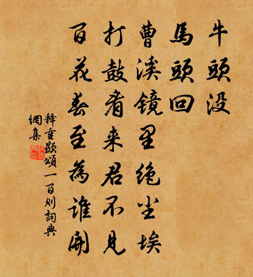 詩詞名句歷史字典書法欣賞書法字典國語詞典說文解字康熙字典古漢語字典標 題 作 者 詩 句 頌一百則作者:釋重顯 朝代:宋代頌一百則原文牛頭沒,馬頭回,曹溪鏡里絕塵埃。打鼓看來君不見,百花春至為誰開。詩詞問答問:頌一百則的作者是誰?答:釋重顯問:頌一百則寫於哪個朝代?答:宋代釋重顯頌一百則書法欣賞頌一百則書法作品詩詞推薦奉和聖制溫泉歌張九齡〔唐代〕有時神物待聖人,去後湯還冷,來時樹亦春。今茲十月自東歸,羽旆逶迤上翠微。溫谷蔥蔥佳氣色,離宮奕奕葉光傷硤石縣病叟杜荀鶴〔唐代〕無子無孫一病翁,將何筋力事耕農。官家不管蓬蒿地,須勒王租出此中。瀑布洪咨夔〔宋代〕白龍飛出翠雲堆,不見源頭只見來。勢有盛衰惟視雨,聲無高下尺成雷。誰教河鼓翻將落,我欲陽侯挽取回。東陌挽南康冷知軍孫應時〔宋代〕禮樂三千字,聲名五十秋。士元才展驥,李廣不封侯。香火猶強健,笙歌足燕休。如何早仙去,寒日慘山丘。武岡李簿回多問蕭判官東夫楊萬里〔宋代〕客有來從天一隅,相逢喜問子何如。橘洲各自分馬首,湘水更曾烹鯉魚。心近人遐長作惡,離多合少可無書。得知望漢月/憶漢月李遵勗〔宋代〕 * 一叢臨砌。顆顆露珠裝綴。獨教冷落向秋天,恨東君不曾留意。雕闌新雨霽。綠蘚上,亂鋪金蕊。此花開後更已酉三月二十一日夜夢中作鄭剛中〔宋代〕曲闌乾畔短籬邊,用意春工剪不圓。一夜西風借霜力,幽香噴出小金錢。雨中花/夜行船陸凝之〔宋代〕三百年間,青史幾多人物,俱委埃塵。獨先生斯世,鍊氣成神。將我一支丹桂,換他千載青春。岳陽樓上,紗巾羽復留侯從效問南漢劉岩改名龑字音義詹敦仁〔唐代〕伏羲布初畫卦,布蒼氏乃制布字。點畫布有偏旁,陰陽貴協比。古者不嫌名,周公始稱諱。始諱猶未酷,後習轉多頌古八首釋雲〔宋代〕春風有時惡,春風有時好。人競逐春風,卻被春風惱。醉蓬萊劉子寰〔宋代〕訪鶯花陳跡,姚魏遺風,綠陰成幄。尚有餘香,付寶階紅藥。淮海維陽,物華天產,未覺輸京洛。時世新妝,施朱游朝陽洞次孫機宜韻張自明〔宋代〕綠野年來喜有秋,行春到處小淹留。朝陽亭上初披霧,水月冉中更枕漢。竹徑不容周俗駕,桃蹊還泊晉漁舟。遨頭偈頌一百四十一首釋師範〔宋代〕太白峰前收陣腳,鑑湖歸唱村田樂。無端調轉入新豐,誰知錯處非常錯。直得洞水逆流,乳峰倒卓。石女攢眉,木秋晴張嵲〔宋代〕時事任從兒輩說,新詩誰得老夫降。鬼名罷檢秋堂靜,臥看風枝動晚窗。趣諸友觀牡丹袁甫〔宋代〕天工不管國香奇,流落民家識者希。特地邀賓賓不至,國香也是少人知。病中詩十五首。自解白居易〔唐代〕房傳往世為禪客,王道前生應畫師。[世傳房太尉前生為禪僧,與婁師德友善,慕其為人,故今生有婁之遺風也。暮春上塘道中范成大〔宋代〕店舍無煙野水寒,競船人醉鼓闌珊。石門柳綠清明市,洞口桃紅上已山。飛絮著人春共老,片雲將夢晚俱還。明朝監中直舍種竹同沖卿鄰幾探韻賦得風字韓維〔宋代〕職事惰不理,種竹養疏慵。愛此炎暵辰,獨抱霜雪容。清陰動脩架,秀色如本叢。日落眾客散,蕭蕭庭戶風。句祖詠〔唐代〕不知疊嶂夜來雨,清曉石楠花亂流。第一百三十二卷會稽頌城隍龐王諸葛興〔宋代〕虬髯起兮龍翔,耀兵威兮八方。法羽林兮嚴禁衛,握鉤陳兮掃欃槍。視諸將兮噲等伍,咨舊臣兮忠且武。聳萬目兮名句推薦柏台霜威寒逼人,熱海炎氣為之薄。岑參《熱海行送崔侍御還京》 人迷洞庭水,雁度瀟湘煙。李白《郢門秋懷》 民之無良,相怨一方,受爵不讓,至於己斯亡。荀子《荀子·儒效》 千步虹橋,參差雁齒,直趨水殿。柳永《破陣樂·露花倒影》 所作福德不應貪著。鳩摩羅什譯《金剛經·不受不貪》 何處飛來林間鵲,蹙踏松梢微雪。辛棄疾《賀新郎·把酒長亭說》 露濕晴花春殿香,月明歌吹在昭陽。李益《宮怨》 酒困路長惟欲睡,日高人渴漫思茶。蘇軾《浣溪沙·簌簌衣巾落棗花》 處所多霜雪,胡風春夏起。蔡琰《悲憤詩》 卻憶安石風流,東山歲晚,淚落哀箏曲辛棄疾《念奴嬌·登建康賞心亭呈史致道留守》