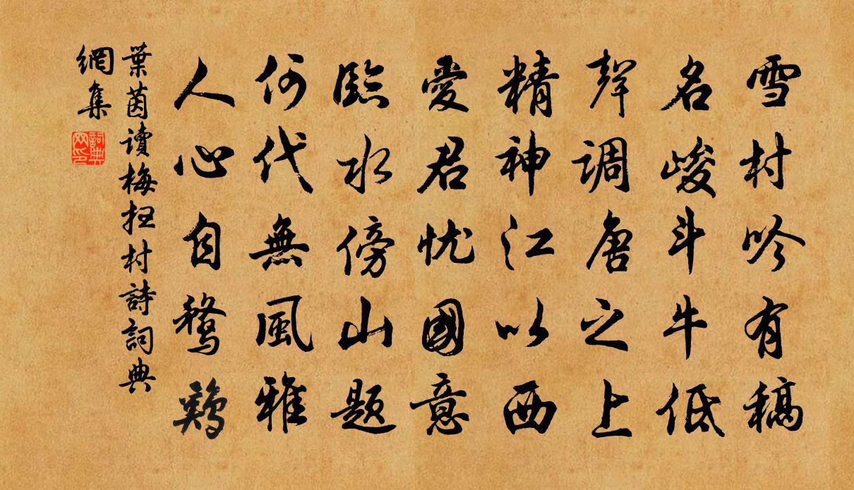 詩詞名句歷史字典書法欣賞書法字典國語詞典說文解字康熙字典古漢語字典標 題 作 者 詩 句 讀梅掃村詩作者:葉茵 朝代:宋代讀梅掃村詩原文雪村吟有稿,名峻鬥牛低。聲調唐之上,精神江以西。愛君憂國意,臨水傍山題。何代無風雅,人心自鶩雞。詩詞問答問:讀梅掃村詩的作者是誰?答:葉茵問:讀梅掃村詩寫於哪個朝代?答:宋代葉茵讀梅掃村詩書法欣賞讀梅掃村詩書法作品詩詞推薦挽使相傅忠簡陳宓〔宋代〕中原文獻舊,四世煒相傳。節操生來異,勛名晚更全。方喔衛武什,遽止太丘年。竟郁經綸志,蒼黔敢扣天。送梁李二明府陳子昂〔唐代〕負書猶在漢。懷策未聞秦。復此窮秋日。芳樽別故人。黃金裝屢盡。白首契逾新。空羨雙鳧舄。俱飛向玉輪。送晏延平宰邑分寧兼過鄉墅宋庠〔宋代〕銅紐腰新綬,鳥衣省故廬。鄉無夜行彥,楹有世藏書。楚潦蘭浮檝,潘園板御輿。蚩蚩吳俗美,庖刃一投虛。贈禪師薛能〔唐代〕嗜欲本無性,此生長在禪。九州空有路,一室獨多年。鳴磬微塵落,移瓶濕地圓。相尋偶同宿,星月坐忘眠。登燕子樓陳師道〔宋代〕綠暗連村柳,紅明委地花。畫梁初著燕,廢沼已鳴蛙。鷗沒輕春水,舟橫著淺沙。相逢千歲語,猶說一枝花。徐教下第歸釋善珍〔宋代〕奏賦長安不遇知,丈夫失意肯生悲。科名自古與風漢,造物至今猶小兒。道在布韋輕將相,時危耕釣隱英奇。渡江謝李侯枉過牟巘五〔宋代〕鳴騶窮巷忽相過,其奈將迎窘步何。每望故都身不羽,欲賡機關報句硯。籃輿端復為公出,泥飲叭應說尹多。卻是偈頌七十二首釋祖欽〔宋代〕行也是,坐也是。俯仰折旋,無是不是。自題白居易〔唐代〕老宜官冷靜,貧賴俸優饒。熱月無堆案,寒天不趁朝。傍看應寂寞,自覺甚逍遙。徒對盈樽酒,兼無愁可銷。慶元二年皇后冊寶十三首佚名〔宋代〕肅肅台的,雍雍陰教。陰詖自防,警下是俲。中章端委,列御硼告。其國輔順,永翼帝孝。水調歌頭 賀汪覺翁受吉水州判 茲者陳櫟〔元代〕里推吉水為名州斗南。公一人擢高才而上佐,除書星耀,喜氣雲蒸。僭揭短歌,用旌手,以芹香之贊,少見柏悅之九日哭子柔弟周必大〔宋代〕自酹黃花酒,心酸苦淚零。常時愛鳴雁,從此不堪聽。秋到方回〔宋代〕秋到山居僻,貧無異味嘗。擘黃新栗嫩,炊白早秈香。漸減家人病,徐添夜氣涼。憑誰理荒穢,籬落菊苗長。夭桃詩佚名〔唐代〕鉛華久御向人間,欲舍鉛華更慘顏。縱有青丘吟夜月,無因重照舊雲鬟。仙岩登覽李洪〔宋代〕造物蘊神巧,軒豁露真趣。嵌空劃仙掌,罅拆噴石乳。半壁垂鮫綃,晴天灑飛雨。捫蘿不知疲,酷愛岩石古。彼姝贈鍾道士范仲淹〔宋代〕人間無復動機心,掛了儒冠歲已深。惟有詩家風味在,一壇松月伴秋吟。送趙南仲出視江淮郭庭芝〔宋代〕劍戟翩翩鐵騎攢,前軍飛渡潤州灣。烽連淮陸胡塵遠,月照金山漢壘寒。虎旅亦知平□易,龍庭不數靖邊難。來威梅花喜神譜大蕊八枝宋伯仁〔宋代〕高山流水音,泠泠生指下。無與俗 * ,伯牙恐嘲罵。水調歌頭(雪中篘酒,恰得三十六壺,乃酹黃山之神,而歌以侑之)汪莘〔宋代〕釀秫小春月,取酒雪花晨。漏壺插破浮蟻,湧起碧鱗鱗。誰覺東風密至,更帶梅香潛入,瓮里淨無塵。一見酒之面和綿州於中丞登越王樓作李汶儒〔唐代〕珍重巴西守,殷勤寄遠情。劍峰當戶碧,詩韻滿樓清。日照涪川闊,煙籠雪嶠明。徵黃看即及,莫嘆滯江城。名句推薦民無廉恥,不可治也;非修禮義,廉恥不立。劉安及其門客《淮南子·泰族訓》 歲歲金河復玉關,朝朝馬策與刀環。柳中庸《征人怨 / 征怨》 憂勞可以興國,逸豫可以亡身歐陽修《伶官傳序》 海畔尖山似劍鋩,秋來處處割愁腸。柳宗元《與浩初上人同看山寄京華親故》 神女生涯原是夢,小姑居處本無郎。李商隱《無題·重幃深下莫愁堂》 山甫歸應疾,留侯功復成。張九齡《奉和聖制送尚書燕國公赴朔方》 並官省事,靜事息役,上下用心,惟農是務也。房玄齡《晉書·列傳·第十七章》 回日樓台非甲帳,去時冠劍是丁年溫庭筠《蘇武廟》 美人慵翦上元燈,彈淚倚瑤瑟。朱敦儒《好事近·春雨細如塵》 未知生,焉知死?孔子弟子《論語·先進篇》