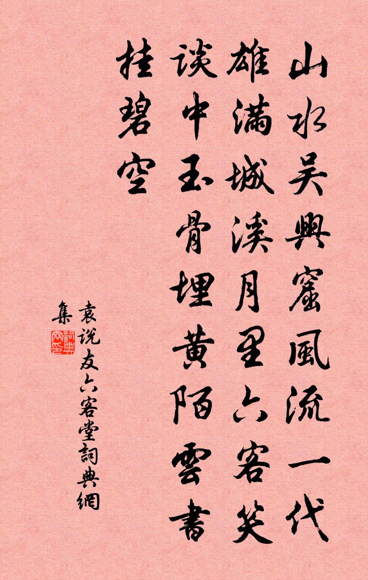 詩詞名句歷史字典書法欣賞書法字典國語詞典說文解字康熙字典古漢語字典標 題 作 者 詩 句 六客堂作者:袁說友 朝代:宋代六客堂原文山水吳興窟,風流一代雄。滿城溪月里,六客笑談中。玉骨埋黃陌,雲書掛碧空。詩詞問答問:六客堂的作者是誰?答:袁說友問:六客堂寫於哪個朝代?答:宋代袁說友六客堂書法欣賞六客堂書法作品詩詞推薦龔立道家藏虢月石屏敖陶孫〔宋代〕桑田鑒一奪,周官寒如灰。賜珏先淪奔,乃自垂棘胎。劫火到鹹陽,六國無珍材。空餘虢山在,蚌水相縈迴。古潭送邢孟貞還石臼顧夢遊〔清代〕月當分手夜,分外冷高秋。蟲響坐來歇,林風相與幽。到家收晚稻,攜子上湖舟。莫戀衡門好,遲君上酒樓。秋霽(雲麓園長橋)吳文英〔宋代〕一水盈盈,漢影隔游塵,淨洗寒綠。秋沐平煙,日回西照,乍驚飲虹天北。彩闌翠馥。錦雲直下花成屋。試縱目。送僧常妙還永嘉毛滂〔宋代〕杖策辭江寺,秋途誰與偕。霜風侵布衲,草露濕芒鞋。收缽無餘事,還鄉非俗懷。金剛真有力,魔避不須排。鶯聲繞紅樓姜夔〔宋代〕十畝梅花作雪飛。冷香下、攜手多時。兩年不到斷橋西。長笛為予吹。人妒垂楊綠,春風為、染作仙衣。垂楊卻又送薛奎殿院赴闕魏野〔宋代〕謫監陝郡滯賢才,清雪忻將紫詔開。緩步未親龍扆去,迴車願擁隼輿來。辭蒙得得過三徑,送合迢迢到柏台。秋霽變行路難王昌齡〔唐代〕向晚橫吹悲,風動馬嘶合。前驅迎旗節,千里陣雲匝。單于下陰山,砂礫空颯颯。封侯取一戰,豈復念閨閣。詠史詩濮水胡曾〔唐代〕青春行役思悠悠,一曲汀蒲濮水流。正見塗中龜曳尾,令人特地感莊周。廣慧法師贊陸游〔宋代〕東土震旦,西方極樂。一緉草鞋,到處行腳。山亭柳杜安世〔宋代〕曉來風雨,萬花飄落。嘆韶光虛過。卻芳草萋萋,映樓台、淡煙漠漠。紛紛絮飛院宇,燕子過朱閣。玉容淡妝添寂南鄉子(大雪韓叔夏坐中)向子諲〔宋代〕梅與雪爭姝。試問春風管得無。除卻個人多樣態,誰如。細把冰姿比玉膚。一曲倒金壺。既醉仍煩翠袖扶。同向凌頌古四首釋景元〔宋代〕阿家新婦最相憐,新婦騎驢家便牽。幾度醉歸明月夜,笙歌引入畫堂前。謝黃師是惠碧瓷枕張耒〔宋代〕鞏人作枕堅且青,故人贈我消炎蒸。持之入室涼風生,腦寒發冷泥丸驚。夢入瑤都碧玉城,仙翁支頤飯未成。鶴鳴題天平壽老方丈范成大〔宋代〕二十三年再入山,此山於我有前緣。時人不用憐衰病,天與丹房一線泉。留題霍山應聖公廟陳網〔宋代〕峻極巍峨勢望雄,層巒疊嶂翠重重。為神有感興唐祚,作鎮無疆福晉封。材產十州資構廈,泉分數邑潤耕農。幽岩養蠶宋沆〔宋代〕男必耕耘女必蠶,古人尚爾我何貪。浴沂時候成春服,歌詠來歸道味甘。送鄭邛叔珪之博羅尉四首王邁〔宋代〕奇士束科目,炯如金在沙。孤吟娛草帶,幾度見槐花。此舉衣纏綠,相看鬢欲華。泥金墨猶濕,已報熟葵瓜。懷素上人草書歌任華〔唐代〕吾嘗好奇,古來草聖無不知。豈不知右軍與獻之,雖有壯麗之骨,恨無狂逸之姿。中間張長史,獨放蕩而不羈,以京口懷古戴叔倫〔唐代〕大江橫萬里,古渡渺千秋。浩浩波聲險,蒼蒼天色愁。三方歸漢鼎,一水限吳州。霸國今何在,清泉長自流。沁園春舒頔〔元代〕多少閒情,桃源問蹊,柯山看棋。把杏花春雨,從頭吟了,木犀秋月,開戶邀之。氣捲風雲,眼空江海,萬古從前名句推薦千嬌面、盈盈佇立,無言有淚,斷腸爭忍回顧。柳永《採蓮令·月華收》 春風只在園西畔。薺菜花繁胡蝶亂。嚴仁《玉樓春·春思》 風定落花深,簾外擁紅堆雪。李清照《好事近·風定落花深》 俄而未霰零,密雪下。謝惠連《雪賦》 銜霜當路發,映雪擬寒開。何遜《詠早梅 / 揚州法曹梅花盛開》 長因送人處,憶得別家時張籍《薊北旅思/送遠人》 吳宮花草埋幽徑,晉代衣冠成古丘。李白《登金陵鳳凰台》 有真性情,須有真涵養:有大識見,乃有大文章。王永彬《圍爐夜話·第一六二則》 潮打三更瓜步月,雨荒十里紅橋火。鄭燮《滿江紅·思家》 如切如磋,如琢如磨。佚名《淇奧》