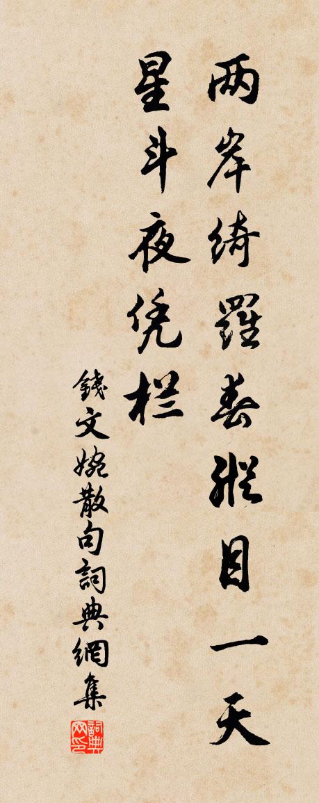 詩詞名句歷史字典書法欣賞書法字典國語詞典說文解字康熙字典古漢語字典標 題 作 者 詩 句 句作者:錢文婉 朝代:宋代句原文兩岸綺羅春縱目,一天星斗夜憑欄。詩詞問答問:句的作者是誰?答:錢文婉問:句寫於哪個朝代?答:宋代錢文婉句書法欣賞句書法作品詩詞推薦和陳子良海棠四首吳芾〔宋代〕花間春色麗晴空,惱我狂來只繞叢。試問妖嬈誰與比,一株勝卻萬株紅。句李師中〔宋代〕山響催茶候,梅蒸熟荔天。言懷李群玉〔唐代〕白鶴高飛不逐群,嵇康琴酒鮑昭文。此身未有棲歸處,天下人間一片雲。和白雪老禪二偈鄭清之〔宋代〕檐鐸吟風月半凹,黃金布地欠誅茅。三更出日真光景,大好欽身正笠包。西江月張孝祥〔宋代〕蓋未知其事,重為感嘆,賦此不識平原太守,向來水北山人。世間功業謾虧成。華發蕭蕭滿鏡。幸有田園故里,聊驀山溪王吉昌〔元代〕元來一點,本也無生滅。逐景落陰陽,匠成形、頭面轉別。五濁惡代,八苦鎮交煎,生還死,死還生,生死何時徹題馬儒乂石門山居顧非熊〔唐代〕尋君石門隱,山近漸無青。鹿跡入柴戶,樹身穿草亭。雲低收藥徑,苔惹取泉瓶。此地客難到,夜琴誰共聽。題華嚴寺瑰公禪房岑參〔唐代〕寺南幾十峰,峰翠晴可掬。朝從老僧飯,昨日崖口宿。錫杖倚枯松,繩床映深竹。東谿草堂路,來往行自熟。生事寄餞趙清中主上元簿林表民〔宋代〕六代舊都遺在,詞人懷古去登入臨。長乾塔上青山遠,玄武湖邊碧草深。肯把簿書庶望眼,但圖方略副焦心。平江南樓李彌遜〔宋代〕百尺危樓枕水濱,風煙入眼亂紛紛。趁虛漁唱來成市,入壠田歌去作群。閣雨雲深山著帽,駕潮風急浪翻雲。寄言送劉職方知汾州梅堯臣〔宋代〕西河風俗厚,尚翅古所聞。子夏有遺廟,乾木有遺墳。太守下車日,當先此二君。不必汾水上,秋風看雁群。偈六十九首釋道寧〔宋代〕枯木岩前,道人不顧。塵勞界內,衲子興悲。戀著玄關,全虧大用。灰身滅智,豈是良圖。裂破面門,救諸苦趣。和次道奉慈齋宮見寄司馬光〔宋代〕去住邈如霄與塵,依依欲別更相親。唱知洛邑饒英俊,莫忘齋廬並直人。贈郭功甫二絕袁陟〔宋代〕從來多病王僧佑,自小能文謝惠連。各厭塵勞思物外,莫辭攜手訪林泉。何秀才郊園五首司馬光〔宋代〕濁酒不取味,素琴無復弦。何須更清論,相見自蕭然。池上篇白居易〔唐代〕十畝龜之宅,五龜畝之園。有水一池,有竹千竿。勿謂土狹,勿謂地偏。足以容膝,足以息肩。有堂有庭,有橋有片石唐彥謙〔唐代〕小齋廬阜石,寄自沃洲僧。山客勞攜笈,幽人自得朋。瘦雲低作段,野浪凍成雲。便可同清話,何須有物憑。漁家傲佚名〔宋代〕經行。善導可嗟今已往。化來老少皆歸響。佛念一聲分一鏹。聲才響。一聲一佛虛空上。八萬四千奇妙相。光明壽春貼子詞皇帝閣六首司馬光〔宋代〕鸞路迎長日,農祥正曉天。九垓同燠沐,萬物向蕃鮮。鳳池吟吳文英〔宋代〕萬丈巍台,碧罘罳外,袞袞野馬游塵。舊文書幾閣,昏朝醉暮,覆雨翻雲。忽變清明,紫垣敕使下星辰。經年事靜名句推薦不讓則不和,不和不可以遠征。左丘明《左傳·定公·定公五年》 春衫著破誰針線,點點行行淚痕滿。黃公紹《青玉案·年年社日停針線》 舉頭望明月,低頭思故鄉。李白《靜夜思》 黃金燃桂盡,壯志逐年衰。孟浩然《秦中感秋寄遠上人 / 秦中寄遠上人》 雖有高世之名,無咫尺之功者不賞。劉向《戰國策·秦五·四國為一將以攻秦》 怒不過奪,喜不過予。荀子《荀子·修身》 飛雲當面化龍蛇,夭矯轉空碧。秦觀《好事近·夢中作》 千古江山,英雄無覓孫仲謀處辛棄疾《永遇樂·京口北固亭懷古》 洞房昨夜停紅燭,待曉堂前拜舅姑。朱慶餘《近試上張籍水部 / 近試上張水部 / 閨意獻張水部》 僵臥孤村不自哀,尚思為國戍輪台。陸游《十一月四日風雨大作》