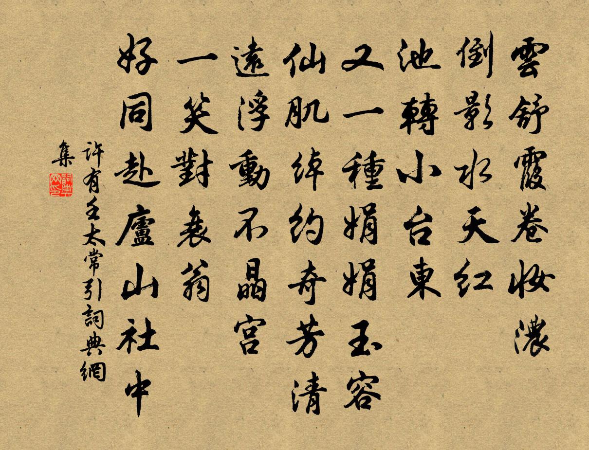 詩詞名句歷史字典書法欣賞書法字典國語詞典說文解字康熙字典古漢語字典標 題 作 者 詩 句 太常引作者:許有壬 朝代:元代太常引原文雲舒霞卷妝濃。倒影水天紅。池轉小台東。又一種、娟娟玉容。仙肌綽約,奇芳清遠,浮動不晶宮。一笑對衰翁。好同赴、廬山社中。詩詞問答問:太常引的作者是誰?答:許有壬問:太常引寫於哪個朝代?答:元代問:太常引是什麼體裁?答:詞許有壬太常引書法欣賞太常引書法作品詩詞推薦病中作丘葵〔宋代〕獨坐茅檐靜養疴,亦知來日苦無多。此心不動窮無鬼,元氣將衰病有魔。嘆老嗟卑非我事,貪生怛化欲如何。平生村居即事劉雪崖〔宋代〕數聲雞犬自相聞,借得茅廬住水濆。梅欲黃時常是雨,稻才青處便如雲。憂時每歡朝廷遠,學稼方知畎畝勤。若使禮部貢院閱進士試歐陽修〔宋代〕紫殿焚香暖吹輕,廣庭清曉席群英。無嘩戰士銜枚勇,下筆春蠶食葉聲。鄉里獻賢先德行,朝廷列爵待公卿。自慚寄題喻叔奇國傅郎中園亭二十六詠磬湖楊萬里〔宋代〕洞庭張樂起天風,玉磬吹來隨圃中。卻被仙人熔作水,為君到底寫秋空。赴官安溪回與柯東海同宿閒吟陳宓〔宋代〕道逢酒舍定遲回,無奈詩篇費剪裁。忽得好風還自喜,那知細雨隔溪來。朱買臣徐鈞〔宋代〕長歌負擔久棲棲,一旦高車守會稽。衣錦還鄉成底事,只將富遺耀前妻。好事近仲並〔宋代〕今古滿胸中,韜略一時人傑。高臥溪山好處,遲十年齋鉞。朱轓休傍武陵溪,梅花記曾別。早晚殿前歸侍,總周廬送彥珍王安石〔宋代〕挾策窮鄉滿鬢絲,陂田荒盡豈嘗窺。未應谷口終身隱,正合菑川舉國推。握手百憂空往事,還家一笑即芳時。柘岡過李楫宅王維〔唐代〕閒門秋草色,終日無車馬。客來深巷中,犬吠寒林下。散發時未簪,道書行尚把。與我同心人,樂道安貧者。一罷懷昔舒岳祥〔宋代〕淮海新封國,東南望止戈。紗衣秋意早,石枕雨聲多。白露皺紅棗,西風擺老荷。昔年游萬里,今日興如何。團扇歌沈約〔南北朝〕團扇復團扇。持許自障面。憔悴無復理。羞與郎相見。見天地心黃庚〔宋代〕乾坤主宰妙難窺,識破倪便萬可知。陽動於陰分太陰,剝窮必復露真機。化工自有經綸處,生意元無間斷時。萬象再賦前韻五首王洋〔宋代〕子美才高不自期,卻言蘇李是吾師,若從欲逞蘭苕句,試掣鯨魚與對治。九張機南宋無名〔宋代〕六張機,行行都是耍花兒。花間更有雙蝴蝶,停梭一響,閒窗影里,獨自看多時。吳聲子夜歌(一作崔國輔詩,題雲古意)薛奇童〔唐代〕淨掃黃金階,飛霜皓如雪。下簾彈箜篌,不忍見秋月。寄在伯三首後一首並示逸趙蕃〔宋代〕出門欲尋岩,聞君已行舟。川遠不可涉,佇立空夷猶。雨風既冥冥,離思復幽幽。人生苟無別,安能成白頭。詠竹檳榔盤詩沈約〔南北朝〕梢風有勁質。柔用道非一。平織方以文。穹成圓且密。薦羞雖百中國。所貴浮天實。幸承歡醑余。寧辭嘉宴畢。同胡原仲吳公路游清湍亭賦詩得流字劉子翬〔宋代〕出山曾幾時,桂露颯已秋。興來任兩屐,散此默默憂。嵐光近仍滅,鳥語靜忽流。新亭迥臨危,急潤循岩陬。上有題雪霽望弁山圖錢選〔宋代〕弁山之陽冠吳興,峮嶙巀嶭望不平。煥烯仙宮隱請其,眾山所仰青復青。雪花夜積山如換,乘興行舟須放緩。平生鷓鴣天佚名〔宋代〕鶴算遺芳績世傳。武夷來作散神仙。柳營隱隱兵戎整,蘭砌詵詵子舍賢。傾柏酒,爇沉煙。殷勤起舞祝長年。行須名句推薦量入以為出戴聖《禮記·王制》 故人不可見,新知萬里外。文天祥《端午即事》 短籬殘菊一枝黃。正是亂山深處、過重陽。呂本中《南歌子·驛路侵斜月》 綺席凝塵,香閨掩霧。晏殊《踏莎行·碧海無波》 既熟慣,則更覺親密;既親密,則不免一時有求全之毀,不虞之隙。曹雪芹《紅樓夢·第五回》 今夜不知何處宿,平沙萬里絕人煙。岑參《磧中作》 凡所有相。皆是虛妄。若見諸相非相。則見如來。鳩摩羅什譯《金剛經·如理實見》 一朝春盡紅顏老,花落人亡兩不知。曹雪芹《紅樓夢·第二十七回》 楚人悲屈原,千載意未歇。蘇軾《屈原塔》 知者不博,博者不知。老子《老子·德經·第八十一章》