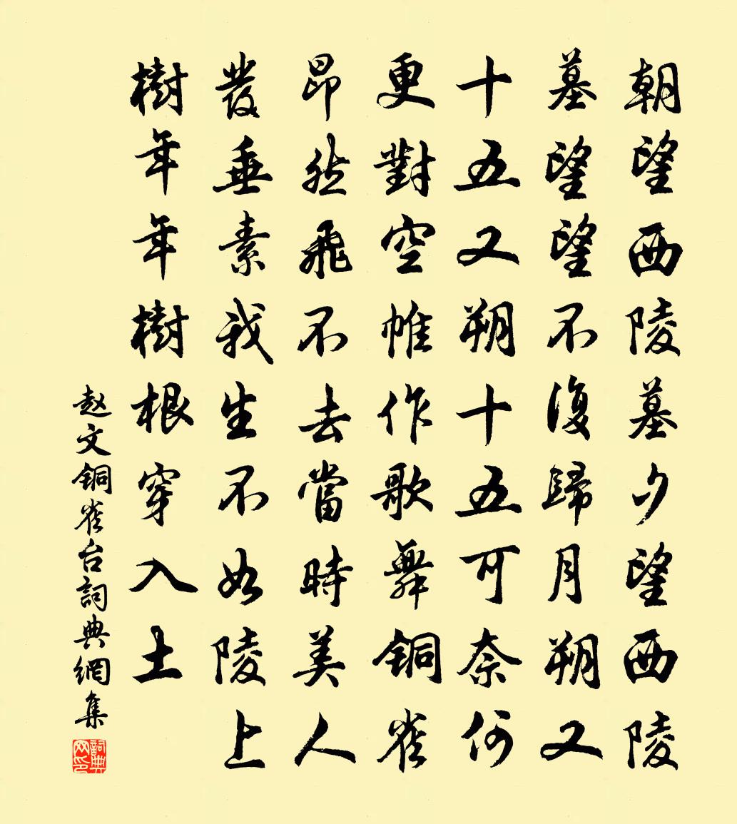 詩詞名句歷史字典書法欣賞書法字典國語詞典說文解字康熙字典古漢語字典標 題 作 者 詩 句 銅雀台作者:趙文 朝代:宋代銅雀台原文朝望西陵墓,夕望西陵墓。望望不復歸,月朔又十五。又朔十五可奈何,更對空帷作歌舞。銅雀昂然飛不去,當時美人發垂素。我生不如陵上樹,年年樹根穿入土。詩詞問答問:銅雀台的作者是誰?答:趙文問:銅雀台寫於哪個朝代?答:宋代趙文銅雀台書法欣賞銅雀台書法作品詩詞推薦送季平道中四絕鄭剛中〔宋代〕田夫擊喜祀田神,盤案相呼盡欲醺。我願四郊無犬吠,常令此輩樂耕耘。送來賓宰戴復古〔宋代〕君作來賓宰,聽我說來賓。蠻俗無王化,當為行化人。有民無租賦,租賦出商旅。逐利遭重徵,商旅亦良苦。能放寶雲庵戒師洪咨夔〔宋代〕鍾山好住苦弗住,馱嶺難居真欲居。出地入天須任我,來今去古不關渠。萬由旬上起膚寸,一剎那間彌太虛。識得病中有人惠海蟹轉寄魯望皮日休〔唐代〕紺甲青筐染菭衣,島夷初寄北人時。離居定有石帆覺,失伴唯應海月知。族類分明連瑣王吉,形容好個似蟛蜞。病姑蘇台同年會次袁說友韻詹體仁〔宋代〕秋鴻社燕巧相違,從古交遊會合稀。海內弟兄今有幾,吳中賢士得相依。已不消桃李爭春,且向桑榆共夕暉。回首送陳判之邑庠丘葵〔宋代〕君去采芹藻,那知事不同。乾坤已易主,禮樂尚儒宮。雨過山仍綠,春歸花盡紅。悠悠聖門意,千古獨清風。送李兄赴省方大琮〔宋代〕乃翁場屋負高名,里許工夫共講明。謝氏弟兄輝玉樹,韋侯父子薄金籯。世科莫訝爭寒畯,少作曾看到老成。此去戴迪功輓詞樓鑰〔宋代〕猶記天街會,同為乳竇游。姻家頻會聚,親意愈綢繆。吉德宜多壽,奇痾竟不瘳。無由見安道,汎雪悵回舟。會慶聖節曹勛〔宋代〕帝出乘時葉小春,中興復古付曾孫。奉親聖德躬仁孝,御極天章廓晏溫。書軌自應歸正統,蠻夷先已侍修門。凌虛雜詠一百首彭祖劉克莊〔宋代〕活得如彭老,憂愁八百春。頻為哭殤叟,屢作悼亡人。已亥雜詩 213龔自珍〔清代〕此閣宜供天人師,檀香三尺博士為。阮公施香孰施字,徐公字似蕭梁碑。和樂天過秘閣書省舊廳元稹〔唐代〕聞君西省重徘徊,秘閣書房次第開。壁記欲題三漏合,吏人驚問十年來。經排蠹簡憐初校,芸長陳根識舊栽。司馬次韻王敏仲池上張耒〔宋代〕春晚余芳尚可尋,晴雷沙岸走車音。苑分廣樂和聲度,池受晴天倒影深。席上宮花輝御醴,坐中瓊樹間瑤林。歸人玉樓春歐陽修〔宋代〕夜來枕上爭閒事。推倒屏山褰繡被。盡人求守不應人,走向碧紗窗下睡。直到起來由自殢。向道夜來真箇醉。大家寄越友方岳〔宋代〕茂竹修林已陳跡,禹穴剡溪俱勝游。秋風倘未理歸夢,我欲買船官渡頭。西江月黃庭堅〔宋代〕宋玉短牆東畔,桃源落日西斜。濃妝下著繡簾遮。鼓笛相催清夜。轉眄驚翻長袖,低徊細踏紅靴。舞餘猶顫滿頭花楊花趙蕃〔宋代〕雨樹蒙茸集,晴空散亂飛。若為散亂飛,何只詠依依。花里渾迷蝶,風前屢點衣。未妨吹盡得,病起頻寬圍。宮詞李建勛〔唐代〕自遠凝旒守上陽,舞衣頓減舊朝香。簾垂粉閣春將盡,門掩梨花日漸長。草色深濃封輦路,水聲低咽轉宮牆。君王朝中措(賀生第三子)哀長吉〔宋代〕自從佳偶共黃姑。幾見設門弧。方喜階庭聯玉,又聞老蚌生珠。一門三秀,賈家虎子,薛氏鸞雛。從此公侯袞袞,虞美人胡文卿〔宋代〕樞庭喜慶生辰到。仙伯離蓬島。魯台雲物正呈祥。線繡工夫從此、日添長。滿斟綠醑深深勸。歲歲長相見。蟠桃結名句推薦聽元宵,往歲喧譁,歌也千家,舞也千家。王磐《古蟾宮·元宵》 布被秋宵夢覺,眼前萬里江山。辛棄疾《清平樂·獨宿博山王氏庵》 石卵不敵。蛇龍不鬥。馮夢龍《警世通言·卷九》 夫見亂而不惕,所殘必多,其飾彌章。左丘明《國語·周語·太子晉諫靈王壅谷水》 有才無德,如家無主而奴用事矣,幾何不魍魎猖狂。洪應明《菜根譚·概論》 一年春又盡,倚杖對斜暉。左緯《春晚》 誰念遷客歸來,老大傷名節。李綱《六么令·次韻和賀方回金陵懷古鄱陽席上作》 風自火出,家人;君子以言有物而行有恆。佚名《易傳·象傳下·家人》 雲來氣接巫峽長,月出寒通雪山白。杜甫《古柏行》 風風雨雨梨花,窄索簾櫳,巧小窗紗。喬吉《折桂令·客窗清明》