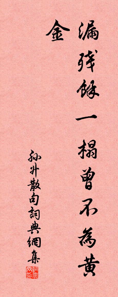 詩詞名句歷史字典書法欣賞書法字典國語詞典說文解字康熙字典古漢語字典標 題 作 者 詩 句 句作者:孫升 朝代:宋代句原文漏殘餘一榻,曾不為黃金。詩詞問答問:句的作者是誰?答:孫升問:句寫於哪個朝代?答:宋代孫升句書法欣賞句書法作品詩詞推薦九華菊史鑄〔宋代〕流芳千古傲霜英,剪玉絲金照眼明。若論駐顏功不涉,仙丹端可與齊名。水調歌頭朱敦儒〔宋代〕中秋一輪月,只和舊青冥。都緣人意,須道今夕別般明。是處登臨開宴,爭看吳歌楚舞,沈醉倒金尊。各自心中事留別龔處士李白〔唐代〕龔子棲閒地,都無人世喧。柳深陶令宅,竹暗辟疆園。我去黃牛峽,遙愁白帝猿。贈君卷葹草,心斷竟何言。十二月安七日補綴舊詩寄正仲舒岳祥〔宋代〕歲闌思飲酒,人老且捐書。春日將輝賁,陰風為掃除。花前看燈蟹,雪後坐庵魚。有約君無負,牆根摘露蔬。雜書示陳國佐胡元茂四首陳與義〔宋代〕杜門十日疾,因得觀妄身。勿雲千金軀,今視如埃塵。平生老赤腳,每見生怒嗔。揮汗煮我藥,見此愧其勤。歲除自語二首錢時〔宋代〕盡道今年歲運惡,誰知最好是今年。夜光明月反散落,遺稿一朝成巨編。寄李趙二友生賀鑄〔宋代〕東風掠地百草青,顛毛余幾今星星。長年嬰疾斷還往,無處避愁徒醉醒。聯馬尋芳狹斜道,銜舟待月滄浪亭。遙輸清江引馬致遠〔元代〕樵夫覺來山月底,釣叟來尋覓。你把柴斧拋,我把魚船棄。尋取個穩便處閒坐地。綠蓑衣紫羅袍誰為你,兩件兒都排悶晁說之〔宋代〕鄜頭來為吏,多愁尚喜論。山川分漢郡,人物客羌村。宮廢人仙在,天清貳負昏。莫言無妙麗,土稚動金門。和曾克俊惠詩楊萬里〔宋代〕眼底春光正入年,社前燕子已言旋。雨多厭聽鳩夫婦,病起全疏酒聖賢。舊喜作詩今已懶,君能得句我先傅。略無讀書辛棄疾〔宋代〕是非得失兩茫茫,閒把遺書細較量。掩卷古人堪笑處,起來摩腹步長廊。水龍吟 和馬西麓韻張野〔元代〕故人邂逅相逢,滿懷和氣無邊際。別來一載,光陰回首,水流星墜。白雪歌詞,青雲人物,知音有幾。把滄溟倒卷【雙調】風入松_九日哀箏一張可久〔元代〕九日哀箏一抹十三弦,飛雁隔秋煙。攜壺莫道登臨晚,蝶雙雙為我留連。仙客玲瓏玉樹,佳人窄索金蓮。琅琅新雨詠德上韋檢察(即韋相皋之弟也,名纁)歐陽詹〔唐代〕少華類太華,太室似少室。亞相與丞相,亦復無異質。渟如月臨水,肅若松照日。輝影互光澄,陰森兩蔥鬱。連城鳳棲梧 和碧虛坦詞尹志平〔元代〕至道幽微何處究。妄想邪思,便是魔 * 。欲要三田苗長秀。真常真靜真無朽。五氣朝元真一湊。萬語千言,須候喜遷鶯(立春)史浩〔宋代〕譙門殘月。正畫角曉寒,梅花吹徹。瑞日烘雲,和風解凍,青帝乍臨東闕。暖響土牛簫鼓,夾路珠簾高揭。最好是小重山(數椽甫葺,知府載酒寵臨,輒次日近環湖所賦韻為一杯壽)李壁〔宋代〕燕雀風輕二月天。一枝何處是家園。有花不惜是誰憐。生嫌怕,不為老人妍。眉黛擁連娟。高情時載酒、雁湖邊。客中釋文珦〔宋代〕客中春又半,舊隱欲歸難。唯恐傷懷抱,花開不欲看。觀佛跡寺王勃〔唐代〕蓮座神容儼,松崖聖趾餘。年長金跡淺,地久石文疏。頹華臨曲磴,傾影赴前除。共嗟陵谷遠,俄視化城虛。丙子寅月九日五鼓夢余憶舊作因用韻程公許〔宋代〕來誤解縈牽豈自,寺逢此劫在儒流。昏昏心似未磨鏡,役役身如不纜丹。聞道無緣時已晚,養生欠術鬢先秋。向平名句推薦狂風吹我心,西掛鹹陽樹。李白《金鄉送韋八之西京》 故人何在,水村山郭。孫道絢《憶秦娥·季溫老友歸樵陽人來閒書因以為寄》 功遂身退,天之道老子《老子·道經·第九章》 說法者無法可說。是名說法。鳩摩羅什譯《金剛經·非說所說》 百年歌自苦,未見有知音。杜甫《南征》 興,百姓苦;亡,百姓苦!張養浩《山坡羊·潼關懷古》 愚而好自用,賤而好自專。子思《中庸·第二十八章》 艷妝臨水最相宜。風來吹繡漪。吳文英《醉桃源·芙蓉》 田夫荷鋤至,相見語依依。王維《渭川田家》 遍身羅綺者,不是養蠶人張俞《蠶婦》