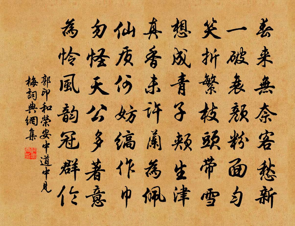 詩詞名句歷史字典書法欣賞書法字典國語詞典說文解字康熙字典古漢語字典標 題 作 者 詩 句 和榮安中道中見梅作者:郭印 朝代:宋代和榮安中道中見梅原文春來無奈客愁新,一破衰顏粉面勻。笑折繁枝頭帶雪,想成青子頰生津。真香未許蘭為佩,仙質何妨縞作巾。勿怪天公多著意,為憐風韻冠群倫。詩詞問答問:和榮安中道中見梅的作者是誰?答:郭印問:和榮安中道中見梅寫於哪個朝代?答:宋代郭印和榮安中道中見梅書法欣賞和榮安中道中見梅書法作品詩詞推薦知非權德輿〔唐代〕名教自可樂,搢紳貴行道。何必學狂歌,深山對豐草。木蘭花慢 至大戊申八月二十五日,同疏仙萬許有壬〔元代〕雲左丞未老休致,指清露堂扁,命予二人分賦長短句,予得清字,皆即席成章,喜甚,榜之堂上。疏仙其甥也,後金蓮出玉花 萊州倉使廬武義馬鈺〔元代〕廬公倉使。意在留心風馬二。未解修丹。送我勞勞到武官。速回車馬。欲要全真先棄假。功行須周。定是將來看十百字謠 海棠周權〔元代〕輕陰滯雨,正社燕新來,東風院落。十萬紅妝梳洗罷,翠袖春寒猶薄。富貴天姿,風流睡足,酒暈潮紅玉。個般艷散懷陸游〔宋代〕少年已遂遯山林,何況霜毛兩鬢侵。習氣尚存詩入夢,病根未去藥關心。猿知秋近啼先苦,鶴閱年多頂漸深。不忍題東山子李適碑陰二首徐彥伯〔唐代〕隴嶂縈紫氣,金光赫氛氳。美人含遙靄,桃李芳自薰。圖高黃鶴羽,寶奪驪龍群。忽驚薤露曲,掩噎東山雲。回也松間王安石〔宋代〕偶向松間覓舊題,野人休誦北山移。丈夫出處非無意,猿鶴從來不自知。送呂希道知和州蘇軾〔宋代〕去年送君守解梁,今年送君守歷陽。年年送人作太守,坐受塵土堆胸腸。君家聯翩三將相,富貴未已今方將。鳳雛答林昌宗詩筌韻劉翼〔宋代〕經鋤小暇弄詩筌,老去仍知默是祥。滄海移舟盡琴趣,雖然終不似無弦。病中即事十五首趙蕃〔宋代〕端居念朋友,多病懶書題。懷舊頻搔首,看雲獨杖藜。魚沉秋水闊,鴻遠暮天低。直恐乖離久,相逢老少迷。和劉侍郎入隆唐觀楊炯〔唐代〕福地陰陽合,仙都日月開。山川臨四險,城樹隱三台。伏檻排雲出,飛軒繞澗回。參差凌倒影,瀟灑軼浮埃。百果馬上作陸游〔宋代〕平橋小陌雨初收,淡日穿雲翠靄浮。楊柳不遮春色斷,一枝紅杏出牆頭。三日岐王宅張諤〔唐代〕玉女貴妃生,嫛婗始發聲。金盆浴未了,繃子繡初成。翡翠雕芳縟,真珠帖小纓。何時學健步,斗取落花輕。句曲山朝真詞二首送真陸龜蒙〔唐代〕縈雲鳳髻飄然解,玉鉞玄乾儼先邁。朝真弟子悄無言,再拜碧杯添沆瀣。火釒靈跳躍龍毛蓋,腦發青青赮綷綷。萬文登蓬萊閣下石壁千丈為海浪所戰時有碎裂淘蘇軾〔宋代〕蓬萊海上峰,玉立色不改。孤根捍滔天,雲骨有破碎。陽侯殺廉角,陰火發光彩。累累彈丸間,瑣細成珠琲。閻浮後溪晚步文同〔宋代〕陰陰芳樹暗回堤,路入蒙籠轉野溪。澤雉應媒高復下,林鴉引子曷還啼。青蒲宛宛全淹水,紫筍斑斑半出泥。倚杖送劉秀才南歸(一作陳存詩)劉復〔唐代〕鳥啼楊柳垂,此別千萬里。古路入商山,春風生灞水。停車落日在,罷酒離人起。蓬戶寄龍沙,送歸情詎已。寄雲台觀田秀才馬戴〔唐代〕雲壓松枝拂石窗,幽人獨坐鶴成雙。晚來漱齒敲冰渚,閒讀仙書倚翠幢。余於沂流至安仁楊萬里〔宋代〕半篙新漲滿帆風,兩岸千山一抹中。慚愧棹郎能袖手,若非袖手更無功。更題杜甫〔唐代〕只應踏初雪,騎馬發荊州。直怕巫山雨,真傷白帝秋。群公蒼玉佩,天子翠雲裘。同舍晨趨侍,胡為淹此留。名句推薦不食人間煙火。袁枚《隨園詩話·補遺 卷九》 月明星稀,烏鵲南飛。繞樹三匝,何枝可依?曹操《短歌行》 形影忽不見,翩翩傷我心。曹植《雜詩六首·其一》 客子光陰詩卷里,杏花訊息雨聲中。陳與義《懷天經智老因訪之》 未羞他、雙燕歸來,畫簾半卷張炎《解連環·孤雁》 攻人之惡毋太嚴,要思其堪受;教人以善毋過高,當使其可從。洪應明《菜根譚·概論》 自憐十五餘,顏色桃李紅。李白《長干行二首》 日入群動息,歸鳥趨林鳴陶淵明《飲酒·七》 草木也知愁,韶華竟白頭。曹雪芹《唐多令·柳絮》 應無所住而生其心。鳩摩羅什譯《金剛經·莊嚴淨土》