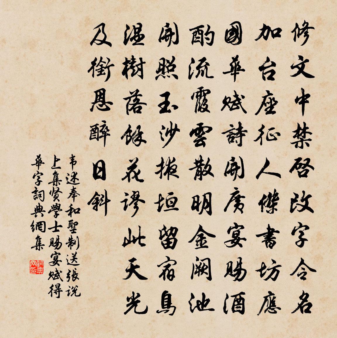 詩詞名句歷史字典書法欣賞書法字典國語詞典說文解字康熙字典古漢語字典標 題 作 者 詩 句 奉和聖制送張說上集賢學士賜宴(賦得華字)作者:韋述 朝代:唐代原文修文中禁啟,改字令名加。台座征人傑,書坊應國華。賦詩開廣宴,賜酒酌流霞。雲散明金闕,池開照玉沙。掖垣留宿鳥,溫樹落餘花。謬此天光及,銜恩醉日斜。詩詞問答問:《奉和聖制送張說上集賢學士賜宴(賦得華字)》的作者是誰?答:韋述問:該詩寫於哪個朝代?答:唐代書法欣賞奉和聖制送張說上集賢學士賜宴(賦得華字)書法作品注釋全唐詩:卷108_13詩詞推薦袁從道山廬三首葛紹體〔宋代〕日月久棲遲,姓名誰得知。頭戴世儒冠,身著山人衣。峻頷帶薄髭,瘦骨撐疎眉。青編口能誦,白飯手自炊。苦茗菩薩蠻趙長卿〔宋代〕倚樓小小穿針女。秋光點點蛛絲雨。今夕是何宵。龍車烏鵲橋。經年謀一笑。豈解令人巧。不用問如何。人間巧更次韻子瞻延生觀後山上小堂蘇轍〔宋代〕謝公游意未能厭,踏盡登山屐齒尖。古殿神仙深杳杳,香爐煙翠起纖纖。岩花寂歷飄瓊片,庭檜蕭疏漏玉蟾。帝子何草不黃佚名〔先秦〕何草不黃?何日不行?何人不將?經營四方。何草不玄?何人不矜?哀我征夫,獨為匪民。匪兕匪虎,率彼曠野。送禪照大師歸越錢惟演〔宋代〕金剎杳霞扃,南風漾彩舲。吳天六幕遠,越岫萬螺青。龍篆霏雕像,鯨濤注淨瓶。上方堪逈望,支策見春溟。透法身句釋重顯〔宋代〕一葉飄空便見秋,法身須透鬧啾啾。明年更有新條在,惱亂春風卒未休。滿庭芳馬鈺〔元代〕人生七十,罕希壽數。我今四旬有五。一個形骸便是七分入土。其餘晚霞殘照,遇風仙、才方省悟。好險咱,爭些河西太守杜公輓歌四首岑參〔唐代〕蒙叟悲藏壑,殷宗惜濟川。長安非舊日,京兆是新阡。黃霸官猶屈,蒼生望已愆。唯餘卿月在,留向杜陵懸。鼓角命子篇趙友直〔宋代〕悠悠我祖,肇自軒轅。迄於趙城,因而氏焉。漢家涿郡,繼族於燕。卜遷大梁,世系綿綿。宋自中葉,徙都南塘。癸已聖節二首曹勛〔宋代〕堪輿亨會接洪基,鬱鬱蔥蔥動紫微。理契弈秋專國手,德兼周武一戎衣。恩言下浹皆中道,帝意終潛復九圍。升濟止齋即事二首陳傅良〔宋代〕性已耐岑寂,老應忘隱憂。齊年雙白髮,盡日一蒼頭。竹閉緘門鑰, * 數漏籌。未知庭廡下,還有雀羅不。蟬薛濤〔唐代〕露滌清音遠,風吹數葉齊。聲聲似相接,各在一枝棲。菩薩蠻(同僚友泛舟作)郭應祥〔宋代〕泉江三遇昌陽節。棹歌還向中流發。急槳更輕橈。看誰奪得標。明年歸紫淦。尚憶舟同泛。應有舊雙鬟。能謳菩薩食田螺韓元吉〔宋代〕幾年客勾吳,盤饌索無有。鯹鹹咀彭蜞,臭腐羹石首。牛心與熊掌,夢寐不到口。朅來靈山下,空腸尚雷吼。苜蓿河滿子賀鑄〔宋代〕每恨相逢薄處,可憐欲去遲回。猶記新聲團扇□,殷勤再引餘杯。為問依依楊柳,秋風好住章台。疏雨忽隨雲斷,瑣窗寒(和巽吾聞鶯)劉辰翁〔宋代〕嫩綠如新,嬌鶯似舊,今吾非故。空山過雨,睍完留春春去。似尊前曲曲陽關,行人回首江南處。漫停雲低黯,當可有詩索和章次韻答之郭印〔宋代〕日斜弄孤桐,妙趣寄無弦。暮天四垂幕,溪山當華筵。碧玉湛新醪,招集飲中仙。雲車夜未散,短燭蟠青煙。合坐再和二首蘇轍〔宋代〕宸心惻惻念污萊,南御西池閉不開。長樂鳴鞘千乘出,顧成薦鬯萬方來。從臣暗泣新宮柳,父老行依輦路槐。雙闕次韻仇仁近有懷見寄十首方回〔宋代〕猶喜看書懶作詩,暮年自合省云為。預知陰雨骨骸痛,怯上好山筋力罷。不寐有時忘數息,無疑焉用扣歸奇。寄聲秋思陸游〔宋代〕烏柏微丹菊漸開,天高風送雁聲哀。詩情也似並刀快,翦得秋光入捲來。名句推薦凡人之患,蔽於一曲,而闇於大理。荀子《荀子·解蔽》 玉屏風冷愁人。醉爛漫、梅花翠雲。吳文英《柳梢青·與龜翁登研意觀雪懷癸卯歲臘朝斷橋並馬之游》 酒酣應對燕山雪,正冰河月凍,曉隴雲飛。周密《高陽台·送陳君衡被召》 高築牆,廣積糧張廷玉《明史·列傳·卷二十四》 調角斷清秋,征人倚戍樓。張喬《書邊事》 呵筆難臨帖,敲床且煮茶。大須《暮雪》 士有妒友,則賢交不親;君有妒臣,則賢人不至。荀子《荀子·大略》 雲鎖嫩黃煙柳細,風吹紅蒂雪梅殘。閻選《八拍蠻·雲鎖嫩黃煙柳細》 又到斷腸回首處,淚偷零。納蘭性德《山花子·風絮飄殘已化萍》 去時梅萼初凝粉。不覺小桃風力損。歐陽修《玉樓春·去時梅萼初凝粉》