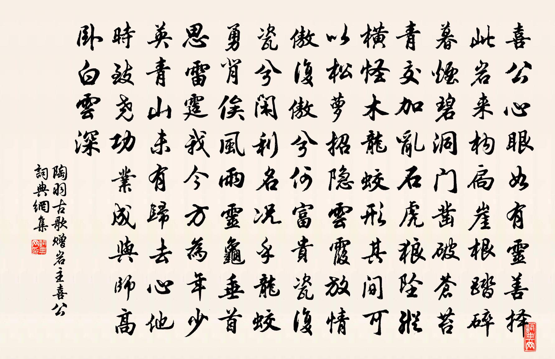 詩詞名句歷史字典書法欣賞書法字典國語詞典說文解字康熙字典古漢語字典標 題 作 者 詩 句 古歌贈岩主喜公作者:陶羽 朝代:宋代古歌贈岩主喜公原文喜公心眼如有靈,善擇此岩來構扃。崖根踏碎暮煙碧,洞門鑿破蒼苔青。交加亂石虎狼墜,縱橫怪木龍蛟形。其間可以松蘿招隱,雲霞放情。傲復傲兮何富貴,瓷復瓷兮閒利名。況乎龍蛟勇背俟風雨,靈龜垂首思雷霆。我今方為年少英,青山未有歸去心。他時致堯功業成,與師高臥白雲深。詩詞問答問:古歌贈岩主喜公的作者是誰?答:陶羽問:古歌贈岩主喜公寫於哪個朝代?答:宋代陶羽古歌贈岩主喜公書法欣賞古歌贈岩主喜公書法作品詩詞推薦句胡寅〔宋代〕更煩橫鐵笛,吹與眾山聽。贈李磐庵文授釋寶曇〔宋代〕莫年東觀有全書,天畀斯文合定居。鏡里一莖無白髮,門前十里有黃淤。文章入手無餘蘊,人物於今固自如。安得鷓鴣天(峽石前用韻答吳子似)辛棄疾〔宋代〕嘆息頻年廩未高。新詞空賀此丘遭。遙知醉帽時時落,見說吟鞭步步搖。乾玉唾,禿錐毛。只今明月費招邀。最憐感興五首於石〔宋代〕吳起為魯將,殺妻殊不仁。樂羊伐中山,食子太無情。功名苟為重,骨肉無乃輕。以此謀富貴,何如甘賤貧。沛豐複次煙字韻後黃大臨庭堅見寄二首蘇轍〔宋代〕水竹遮藏自一川,日高茅屋始炊煙。犬牙舂米新秋後,麥粒烝茶欲社天。冠蓋只今成棄物,杉松他日記栽年。定應句釋曉瑩〔宋代〕何妨語夜闌。秋堂弟自贛歸建安作別何文季〔宋代〕同飲西江甫兩春,匆匆馬首又東馳。歸與華閣春風裡,憶我鈴齋夜雨時。好把汗青傳久遠,莫將朱紫裹愚痴。閩中滿庭芳(八月十六日醴陵作)袁去華〔宋代〕雨送涼來,風將雲去,晚天千頃玻璃。嬋娟依舊,出海較些遲。玉兔秋毫可數,疏星外、烏鵲南飛。今何夕,空浮送上官侍御錢起〔唐代〕執簡朝方下,乘軺去不賒。感恩輕遠道,入幕比還家。碣石春雲色,邯鄲古樹花。飛書報明主,烽火靜天涯。春晚陸游〔宋代〕新綠成陰小雨時,幅巾蕭散與閒宜。燕歸赴訴經年別,鶯晚分疏出谷遲。曉枕呼兒投宿酒,暮窗留客算殘棋。翛然新雁過妝樓吳文英〔宋代〕夢醒芙蓉。風檐近、揮疑佩玉丁東。翠微流水,都是惜別行蹤。宋玉秋花相比瘦,賦情更苦似秋濃。小黃昏,紺雲偈頌一百零二首釋慧遠〔宋代〕一塵入正受,諸塵三昧起。諸塵入正受,一塵三昧起。三昧與正受,門{左木右戶下加上四下衣}作碓觜。起滅無滿庭芳(十月念六日大雪,作此呈社人·冬景)趙長卿〔宋代〕晚色沈沈,雨聲寂寞,夜寒初凍雲頭。曉來階砌,一捻冷光浮。目斷江天靄靄,低迷映、綠竹修修。多才客,高吟登鳳凰台楊萬里〔宋代〕千年百尺鳳凰台,送盡潮回鳳不回。白鷺北頭江草合,烏衣西面杏花開。龍蟠虎踞山川在,古往今來鼓角哀。只有一落索晁端禮〔宋代〕正向溪堂歡笑。忽驚傳新詔。馬啼準擬樂郊行,又卻近、長安道。鸛鵲樓邊初到。未花殘鶯老。崔徽歌舞有餘風,一古一律賀懶翁宏仲七十陳藻〔宋代〕當年嗽臥丈人家,鼓笛村村改歲華。選肉必多儲胃腎,忌鮮緣不啗魚蝦。閨房德義談雖切,事業身窮報自賒。肺疾滿庭芳姜特立〔宋代〕丹染酒吳楓,青酒環越岫,酒鏡天霽色酒凝鮮。華堂珊珮,非務擁神仙。天遣澄清海岳,親曾授黃石奇編。興王略霜天曉角(梅)王澡〔宋代〕疏明瘦直。不受東皇識。留與伴春終肯,千紅底、怎著得。夜色。何處笛。曉寒無奈力。若在壽陽宮院,一點點、訴衷情(旅愁)唐庚〔宋代〕平生不會斂眉頭。諸事等閒休。元來卻到愁處,須著與他愁。殘照外,大江流。去悠悠。風悲蘭杜,煙淡滄浪,何壓沙觀梨晁補之〔宋代〕鄴城旁缺通清溝,城南之水城中流。白沙漲陸最宜果,萬梨壓樹當高秋。去年花開往獨晚,不見瓊苞腸欲斷。隆冬名句推薦過雨西風,數葉井梧愁舞。吳文英《荔枝香近·七夕》 人生有酒須當醉,一滴何曾到九泉。高翥《清明日對酒》 颯颯西風滿院栽,蕊寒香冷蝶難來。黃巢《題菊花》 田家占氣候,共說此年豐。孟浩然《田家元日》 別後不知君遠近。觸目淒涼多少悶。歐陽修《玉樓春·別後不知君遠近》 秀色掩今古,荷花羞玉顏。李白《西施 / 詠薴蘿山》 獨自淒涼還自遣,自製離愁。龔自珍《浪淘沙·寫夢》 木落山空天遠大,送飛鴻、北去傷懷久。戴復古《賀新郎·寄豐真州》 流水孤村,荒城古道。陳霆《踏莎行·晚景》 莫道桑榆晚,為霞尚滿天。劉禹錫《酬樂天詠老見示》