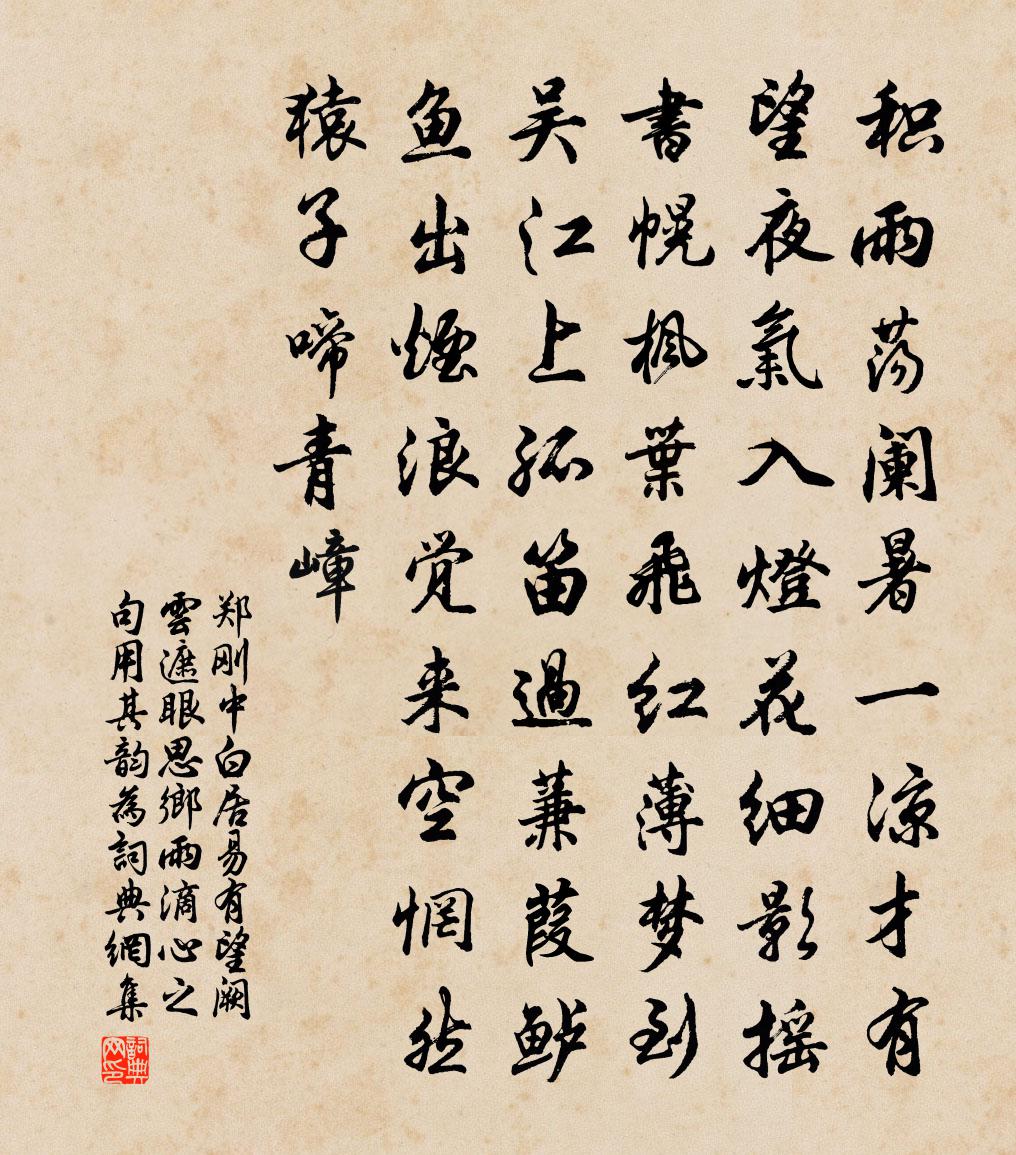 詩詞名句歷史字典書法欣賞書法字典國語詞典說文解字康熙字典古漢語字典標 題 作 者 詩 句 白居易有望闕雲遮眼思鄉雨滴心之句用其韻為作者:鄭剛中 朝代:宋代原文積雨盪闌暑,一涼才有望。夜氣入燈花,細影搖書幌。楓葉飛紅薄,夢到吳江上。孤笛過蒹葭,鱸魚出煙浪。覺來空惘然,猿子啼青嶂。詩詞問答問:《白居易有望闕雲遮眼思鄉雨滴心之句用其韻為》的作者是誰?答:鄭剛中問:該詩寫於哪個朝代?答:宋代書法欣賞白居易有望闕雲遮眼思鄉雨滴心之句用其韻為書法作品詩文賞析【原題】:白居易有望闕雲遮眼思鄉雨滴心之句用其韻為秋思十首詩詞推薦敬和九鎖步虛詞龍吟鎖趙汝湜〔宋代〕矯首東方宮,變化何由尋。神用妙難擬,飈電赫森森。雨施不為功,雲從本無心。人間謾懷想,戛缽希雷吟。蚤晴發廣安軍,晚宿萍池村莊范成大〔宋代〕夜雨洗煩蒸,曉風薦清穆。雲頭聵鐵山,日腳迸金瀑。暑塗一日涼,遠客萬事足。羈人正奔波,觀者何陸續。翠蓋趙有翼招同社同游次韻曾協〔宋代〕總道無情卻有情,撩人幽事不勝清。擬同搔僕從長吉,不遣橘奴覓李衡。四山濃淡要題品,百卉後先宜按行。登覽挽李自玉趙必象〔宋代〕安樂窩中寄幅巾,床頭易註墨猶新。蓋棺只著深衣去,疑是堯夫輩行人。木蓮樹生巴峽山谷間巴民亦呼為黃心樹白居易〔唐代〕大者高五丈涉冬不凋身如青楊有白文葉如桂厚大無脊花如蓮香色艷膩皆同獨房蕊有異四月初始開自開迨謝僅二十日示周道士白玉蟾〔宋代〕前山隱隱起雷聲,細雨絲絲濯旱氛。何處飛來松上鶴,晚風唳斷九天雲。次韻光化宋唐年主簿見寄二首陳與義〔宋代〕茂林當日映群賢,也喚畸人到席間。棄我便驚車轍遠,懷君端合鬢毛班。夢中猶得攀珠樹,別後能忘倒玉山。遙想聞新池擬就僧僦地未遂陳宓〔宋代〕一盆堪作沼,尋丈詎非塘。底用荷花盛,方能心境涼。忍將禾黍地,鑿出水雲鄉。極目平疇闊,時看白鷺翔。為建昌南城包顯道題光風齋月之閣項安世〔宋代〕扁以槐堂之鉅筆,銘以雲谷之高辭。鎮以平園之簽帙,照以太極肝脾。千岩萬壑轉芳氣,青天碧海流清規。春晨畫題小蒜嶺王奕〔宋代〕西風策策麥花涼,重把新詩自品量。禽不為人音自好,路因無驛里偏長。百年白髮空前輩,兩載黃花笑異鄉。歸去觀錫宴章碣〔唐代〕傾朝朱紫正駢闐,紅杏青莎映廣筵。不道樓台無錦繡,只愁塵土撲神仙。魚銜嫩草浮池面,蝶趁飛花到酒邊。日暮哭柴郎中李中〔唐代〕昔歲遭逢在海城,曾容孤跡奉雙旌。酒邊不厭笙歌盛,花下只愁風雨生。棋接山亭松影晚,吟陪月檻露華清。音塵昭君怨張元乾〔宋代〕春院深深鶯語。花怨一簾煙雨。禁火已銷魂。更黃昏。衾暖麝燈落灺。雨過重門深夜。枕上百般猜。未歸來。約同僚游佳陰馮伯規〔宋代〕□□時山漏夕陽,下山草木響□□。□來望到山盡處,一片明冰□□光。遇薛明府謁聰上人 [一作孟浩然詩。]王昌齡〔唐代〕欣逢柏梁故,共謁聰公禪。石室無人到,繩床見虎眠。陰崖常抱雪,枯澗為生泉。出處雖雲異,同歡在法筵。簡月闍黎李洪〔宋代〕吏隱他年並海漘,倦遊悔現宰官身。誰知西子湖邊寺,重見東林社裡人。堆案楞伽三昧勝,談經優缽一花新。老來詠史下北地王諶陳普〔宋代〕何物譙周口似簧,幾年漢帝手牽羊。紛紛蜀土祠諸葛,香火曾分北地王。留別楊慈湖之鵝湖沈煥〔宋代〕任地從天景孰真,何須向北定三辰。天涯未遇蜃樓市,仙嶠偏多採藥人。分手傳資每歧路,知心講道更情親。離亭水窠贈王元聘姜特立〔宋代〕對此一拳石,便有滄洲趣。可笑祖龍痴,轍環山海路。贏得鮑魚腥,屬車無覓處。何如蓬蓽人,低頭檐下住。寄秋懷趙蕃〔宋代〕兩載沅湘役,雖勞何所為。蝦行仍蛭渡,猶豫復狐疑。孰念鋤犁把,殊勝手板持。山南與山北,舒了更從誰。名句推薦多私者不義,揚言者寡信。戴聖《大戴禮記·文王官人第七十二》 落日照大旗,馬鳴風蕭蕭。杜甫《後出塞五首》 綠波春浪滿前陂,極目連雲稏肥。韋莊《稻田》 錦瑟無端五十弦,一弦一柱思華年。李商隱《錦瑟》 為有犧牲多壯志,敢叫日月換新天。 * 《七律·到韶山》 浮雲柳絮無根蒂,天地闊遠隨飛揚。韓愈《聽穎師彈琴》 送君九月交河北,雪裡題詩淚滿衣。岑參《送崔子還京》 覆巢之下,復有完卵劉義慶《世說新語·言語》 文章憎命達,魑魅喜人過。杜甫《天末懷李白》 爾來從軍天漢濱,南山曉雪玉嶙峋。陸游《金錯刀行》