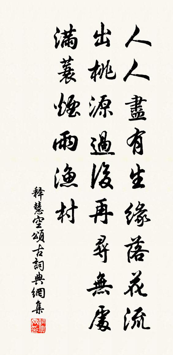 詩詞名句歷史字典書法欣賞書法字典國語詞典說文解字康熙字典古漢語字典標 題 作 者 詩 句 頌古作者:釋慧空 朝代:宋代頌古原文人人盡有生緣,落花流出桃源。過後再尋無處,滿蓑煙雨漁村。詩詞問答問:頌古的作者是誰?答:釋慧空問:頌古寫於哪個朝代?答:宋代釋慧空頌古書法欣賞頌古書法作品詩詞推薦正月二十日,從吳天石處讀緯雲弟京邸春詞,陳維崧〔清代〕何人又唱安公子,漢苑煙濃。魏寢霜封,[犬旁+氣]嶺蠻鄉一萬重。雪消巴蜀添春水,誰駕艨艟。陡起魚龍,此普庵歌釋印肅〔宋代〕祝個普庵純寶貝,妙慧莊嚴真暢快。無門為戶到人稀,萬里神光圓頂蓋。非相身,無不在,體露堂堂聲色外。世間五更出舍郎王哲〔元代〕反會做他出舍郎。便風狂。成功行,到蓬莊。奉報那人如惺悟,好商量。五更里,細消評。蟬許渾〔唐代〕噪柳鳴槐晚未休,不知何事愛悲秋。朱門大有長吟處,剛傍愁人又送愁。思越州山水寄朱慶餘章孝標〔唐代〕窗戶潮頭雪,雲霞鏡里天。島桐秋送雨,江艇暮搖煙。藕折蓮芽脆,茶挑茗眼鮮。還將歐冶劍,更淬若耶泉。天目道中吳龍翰〔宋代〕天目峰前小駐驂,長松笑道碧{上髟下監}鬖。客懷寂寞秋般淡,醉態朦朧午正酣。山色儼如嚴父面,鳥聲還勝俗次韻送張山人歸彭城蘇軾〔宋代〕羨君飄蕩一虛舟,來作錢塘十日游。水洗禪心都眼淨,山供詩筆總眉愁。雪中乘興真聊爾,春盡思歸卻罷休。何日從鄭少嘉求貢綱余茶張栻〔宋代〕茗事蕭疎五嶺中,修仁但可愈頭風。春前龍焙令人憶,知與故人風味同。送李委章項安世〔宋代〕聖靈昔回眷,沾沐仰清徵。十載朝雲陛,賞心惟良知。索居易永久,衰疾忽在斯。常恐鷹隼擊,微命察如絲。末塗送韓湘赴江西從事姚合〔唐代〕年少登科客,從軍詔命新。行裝有兵器,祖席盡詩人。細雨湘城暮,微風楚水春。潯陽應足雁,夢澤豈無塵。猿叫皇后閣端午帖子許應龍〔宋代〕重午宮衣賜百工,香羅疊雪葛含風。誰知此日榮恩被,端自稱絲效繭功。點絳唇蔡伸〔宋代〕解紱朝天,滿城桃李繁陰市。彩舟難駐。忍聽驪歌舉。協贊中興,聖意方傾注。從今去。五雲深處。穩步沙堤路。新灘阻風蘇軾〔宋代〕北風吹寒江,來自兩山口。初聞似搖扇,漸覺平沙走。飛雲滿岩谷,舞雪穿窗牖。灘下三日留,識盡灘前叟。孤舟水鄉酌別但能之主管,能之將過石康范成大〔宋代〕南郭河橋市井喧,綠荷香處有江天。一簾梅雨爐煙外,三疊陽關燭淚前。馬耳西風君並海,船頭北渚我歸田。後期送將官梁左藏赴莫州蘇軾〔宋代〕燕南垂,趙北際,其間不合大如礪。至今父老哀公孫,烝土為城鐵作門。城中積穀三百萬,猛士如雲驕不戰。一朝登垂虹亭二首張元乾〔宋代〕熠熠流螢火,垂垂倒飲虹。行雲吞皎月,飛電掃長空。壯觀江邊雨,醒人水上風。須臾風雨過,萬事笑談中。早秋雨後晚望齊己〔唐代〕暑氣時將薄,蟲聲夜轉稠。江湖經一雨,日月換新秋。有景堪援筆,何人未上樓。欲承涼冷興,西向碧嵩游。答書宋祁〔宋代〕經{左木右適}摧無幾,書刀削未休。胡能反招隱,更欲傍牢愁。澌硯寒餘滴,窗燈明映篝。子威銷骨盡,何相得宣公泉歌葛紹體〔宋代〕幾年廢井城東衙,甃石缺裂洿淖多,奈此宣公初鑿何。宣公浩氣輩孟軻,論諫仁義永不磨,炳炳丹衷史所夸。當時聽蟬鳴應詔詩沈約〔南北朝〕輕生宅園籞。復得棲嘉樹。豈敢擅洪枝。輕條遭所遇。葉密形易揚。風迴響難住。名句推薦火樹銀花合,星橋鐵鎖開。蘇味道《正月十五夜》 善將者,其剛不可折,其柔不可卷,故以弱制強,以柔制剛。諸葛亮《將苑·卷一·將剛》 儻寄相思字,愁人定解顏。錢起《送夏侯審校書東歸》 取次花叢懶回顧,半緣修道半緣君。元稹《離思五首·其四》 舉賢任能,不時日而事利。尉繚《尉繚子·戰威》 素富貴,行乎富貴;素貧賤,行乎貧賤;素夷狄,行乎夷狄;素患難,行乎患難。君子無入而不自得焉。子思《中庸·第十四章》 日射紗窗風撼扉,香羅拭手春事違。李商隱《日射》 泠泠七弦上,靜聽松風寒。劉長卿《聽彈琴》 玉碗冰寒滴露華,粉融香雪透輕紗。晏殊《浣溪沙·玉碗冰寒滴露華》 郵亭無人處,聽檐聲不斷,困眠初熟。周邦彥《大酺·越調春雨》
