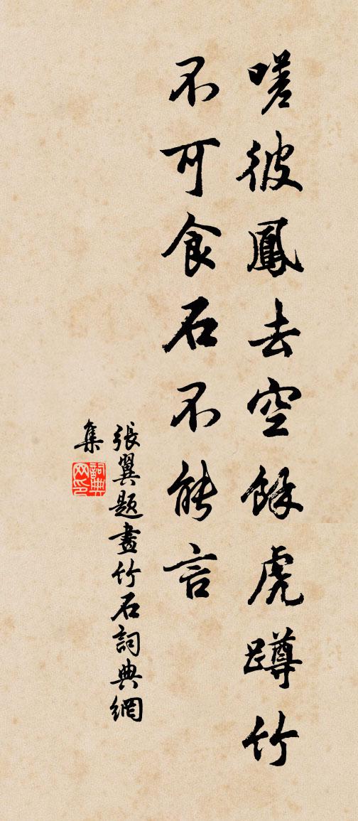 詩詞名句歷史字典書法欣賞書法字典國語詞典說文解字康熙字典古漢語字典標 題 作 者 詩 句 題畫竹石作者:張翼 朝代:宋代題畫竹石原文嗟彼鳳去,空餘虎蹲。竹不可食,石不能言。詩詞問答問:題畫竹石的作者是誰?答:張翼問:題畫竹石寫於哪個朝代?答:宋代張翼題畫竹石書法欣賞題畫竹石書法作品詩詞推薦定風波 永寧范使君園亭,會汝南周車器,汾元好問〔金代〕離合悲歡酒一壺。白頭紅頰醉相扶。見說德星今又聚。何處。范家亭上會周吳。造物有情留此老。人道。洛西清燕安樂吟邵雍〔宋代〕安樂先生,不顯姓氏。垂三十年,居洛之涘。風月情懷,江湖性氣。色斯其舉,翔而後至。無賤無貧,無富無貴。江城子·乙卯正月二十日夜記夢蘇軾〔宋代〕十年生死兩茫茫,不思量,自難忘。千里孤墳,無處話淒涼。縱使相逢應不識,塵滿面,鬢如霜。夜來幽夢忽還鄉和因上人四首王之道〔宋代〕水雲深處見人煙,桑柘鳴鳩似可憐。卻怪銀泥環四壁,由來春雨上蝸涎。謝劉潛夫寄示詩卷趙立夫〔宋代〕坑灰冷秦久,刀筆起漢舊。典謨慨已遠,賦頌紛相授。調律起建安,沿流及元佑。上下二千載,統脈如線溜。渡江鳳簫吟/芳草曹勛〔宋代〕列旗常。中宵天淨,郊丘展采圓蒼。肇禋三歲禮,聖天子為民,致福穰穰。凝旒親奠玉,粲珠聯、星斗垂芒。漸月開元觀遇張侍御錢起〔唐代〕碧落忘歸處,佳期不厭逢。晚涼生玉井,新暑避煙松。欲醉流霞酌,還醒度竹鍾。更憐琪樹下,歷歷見遙峰。四聖觀納涼趙汝迕〔宋代〕林宮暑處薄,短簟逸人眠。樹擊來時馬,風稱聽處蟬。藥童清入畫,道士默如禪。忽憶山中雪,瘦梅逋老阡。郊廟歌辭。享太廟樂章。寧和佚名〔唐代〕炎馭失天綱,土德承天命。英猷被寰宇,懿躅隆邦政。七德已綏邊,九夷鹹底定。景化覃遐邇,深仁洽翔泳。秋夕樓居吳融〔唐代〕月里青山淡如畫,露中黃葉颯然秋。危欄倚遍都無寐,只恐星河墮入樓。秘閣伴直鄭谷〔唐代〕秘閣鎖書深,牆南列晚岑。吏人同野鹿,庭木似山林。淺井寒蕪入,迴廊疊蘚侵。閒看薛稷鶴,共起五湖心。晚步陸游〔宋代〕院荒有古意,僧少無人聲。徘徊楠陰下,賞此落日明。著書亦何急,寂寞身後名。今年復止酒,歌舞陳空觥。不如觀洛神圖慨然有作三首張嵲〔宋代〕天邊崧少遠微茫,猶想霓旌駐水旁。逸態瑰姿何處在,尚應遺恨寄君王。齊天樂·碧雲闕處無多雨高觀國〔宋代〕碧雲闕處無多雨,愁與去帆俱遠。倒葦沙閒,枯蘭漵冷,寥落寒江秋晚。樓陰縱覽。正魂怯清吟,病多依黯。怕挹題楊解元壽萱堂二首王炎〔宋代〕冬夏勤溫情,晨昏潔膳羞。堂中人不老,庭下草忘憂。漫塘口占劉宰〔宋代〕醉著船頭背月眠,醒來紅日浴晴川。等閒活計無人共,獨占江湖萬里天。西齋秋感二十首方回〔宋代〕寒士足奇士,貴人多俗人。俗人尚自可,盜賊乘風塵。子美客長安,悲歌驚鬼神。柄國者誰子,曲江近前嗔。逆臣陌上花三首蘇軾〔宋代〕生前富貴草頭露,身後風流陌上花。已作遲遲君去魯,猶教緩緩妾還家。南溪會集二首傅察〔宋代〕淡盪春溪帶晚城,勝游此地繼半亭。風搖波面琉璃簟,雨洗山光翡翠屏。舉酒莫辭歸酩酊,垂綸聊復向清泠。會須送左元規三詣太常楊萬里〔宋代〕晉侯三駕楚莫爭,薛侯三箭天山平。江西今代再丘明,親到杏壇授麟經。筆陣獨掃萬人軍,兩魁槐花再薦名。來年名句推薦稻根科斗行如塊,田水今年一尺寬。范成大《夏日田園雜興》 飢則附人, 飽便高颺房玄齡《晉書·載記·第二十三章》 西登香爐峰,南見瀑布水。李白《望廬山瀑布水二首》 美成在久,惡成不及改莊子《莊子·內篇·人間世》 士無事而食,不可也。孟子《孟子·滕文公章句下·第四節》 常恐秋節至,焜黃華葉衰。佚名《長歌行》 富貴不離其身,然後能保其社稷,而和其民人。孔子及其弟子《孝經·諸侯》 梧桐雨細。漸滴作秋聲,被風驚碎。張輯《疏簾淡月·寓桂枝香秋思》 狎興生疏,酒徒蕭索,不似少年時。柳永《少年游·長安古道馬遲遲》 千里黃雲白日曛,北風吹雁雪紛紛。高適《別董大二首》