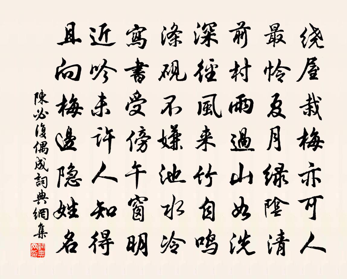 詩詞名句歷史字典書法欣賞書法字典國語詞典說文解字康熙字典古漢語字典標 題 作 者 詩 句 偶成作者:陳必復 朝代:宋代偶成原文繞屋栽梅亦可人,最憐夏月綠陰清。前村雨過山如洗,深徑風來竹自鳴。滌硯不嫌池水冷,寫書受傍午窗明。近吟未許人知得,且向梅邊隱姓名。詩詞問答問:偶成的作者是誰?答:陳必復問:偶成寫於哪個朝代?答:宋代陳必復偶成書法欣賞偶成書法作品詩詞推薦用前韻答黃一翁五首王炎〔宋代〕楚客抱玉虹,刖足只自悲。有寶不韞櫝,此計亦未疏。子虛一賦成,日邊問相如。老眼閱人多。君豈一布衣。篋中贈尤丞季端劉宰〔宋代〕冠制殊常袖更寬,風流王謝出長乾。笑端雲錦呈天巧,胸次冰壺挹露寒。未許歸期占信宿,相應喜色動門闌。賢昆徐天錫歸自玉山昌甫以三詩送之後二篇有及予陳文蔚〔宋代〕曾共傅岩孫,同坐傅岩石。紀游未抄寄,雙梅解相憶。天涯思美人,折花陡岑寂。所幸柱上題,如新未陳跡。頌古四十四首釋法泰〔宋代〕格外談,驚人句,懵懂禪和徒指注。灼然好個佛無光,言下迷宗空自忙。賴有知音招慶在,譊訛一夏為雌黃。雌黃次韻酬昌秋俠見貺之句孔武仲〔宋代〕讀君詩句骨毛寒,直恐吟來得意難。劃若震雷驚蟄戶,爛如奎宿照雲端。鋒芒剸截崑山玉,意氣騰凌大海瀾。欲識頌古八首釋元聰〔宋代〕因我得禮你,莫放屁撒屎。帶累天下人,錯認自家底。風雲晝晦夜遂大雪陸游〔宋代〕大風從北來,洶洶十萬軍。草木盡偃仆,道路瞑不分。山澤氣上騰,天受之為雲。山雲如馬牛,水雲如魚龜。朝闇絕句·人生無百歲劉基〔明代〕人生無百歲,百歲復如何?古來英雄士,各已歸山河。憶夢得(夢得能唱竹枝,聽者愁絕)白居易〔唐代〕齒髮各蹉跎,疏慵與病和。愛花心在否,見酒興如何。年長風情少,官高俗慮多。幾時紅燭下,聞唱竹枝歌。水龍吟(為建康史帥志道壽)丘崈〔宋代〕蕊珠仙籍標名,絳紗覆玉雲霞里。鑾坡鳳掖,絲絇鳴佩,甘泉近侍。濯柳臨春,飣梨照座,絕塵風味。記青蒲、夜偈頌十八首釋道璨〔宋代〕符不書,藥不採。起死禁不祥,幸有這個{按,指拄杖}在。滿院薰風夏日長,人在藕花香世界。和木犀虞儔〔宋代〕岩桂無人也自芳,月宮仙子道家妝。露溥仙掌三秋色,風動枝頭十里香。先世栽培雖地僻,近年卜築發天藏。後堂踏莎行李淛〔宋代〕紅藥香殘,綠筠粉嫩。春歸何處尋春信。繡鞍初上馬啼輕,舉頭便覺長安近。別酒無情,啼妝有恨。山城向晚斜陽愁宋伯仁〔宋代〕愁懷難畫亦難詩,惟有流鶯暗得知。我亦無言鶯不語,柳邊相看立多時。贈別上元主簿張著韓翃〔唐代〕上書一見平津侯,劍笏斜齊秣陵尉。朝垂綬帶迎遠客,暮鎖印囊飛上吏。長樂花深萬井時,同官無事有歸期。回船扇子詩李石〔宋代〕釧動香飄麝,簪低鬢拂鴉。休遮笑里用,用此庭前花。答忠禪者釋重顯〔宋代〕一字七字三五字,萬象窮來不為據。夜深月白下滄溟,搜得驪珠有多許。李粹伯對月見懷次韻曾協〔宋代〕初收雨腳萬絲懸,妙手誰人補漏天。佳月素華迷夜旦,好詩餘味滿中邊。裴徊無奈謝希逸,齁齁總輸邊孝先。見說南池秦觀〔宋代〕泛泛池中鳧,上下與水俱。不與水爭力,所以全其軀,遇物貴含垢,修身戒明污。胡能若雲月,浪自驚群愚。夜坐有感年四十陳文蔚〔宋代〕仲尼切戒取人惡,隈子真能不動心。嗟我痴頑何所得,但能於此惜分陰。名句推薦赤闌橋盡香街直,籠街細柳嬌無力。陳克《菩薩蠻·赤闌橋盡香街直》 行雲歸楚峽,飛夢到揚州。晁補之《臨江仙·綠暗汀洲三月暮》 牧人驅犢返,獵馬帶禽歸。王績《野望》 種竹淇園遠致君,生平孤節負辛勤。王汝舟《詠歸堂隱鱗洞》 行行無別語,只道早還鄉。袁凱《京師得家書》 滿則慮嗛,平則慮險,安則慮危荀子《荀子·仲尼》 樂易者常壽長,憂險者常夭折。荀子《荀子·榮辱》 孔子亦矙其亡也,而往拜之。孟子《孟子·滕文公章句下·第七節》 明朝掛帆席,楓葉落紛紛。李白《夜泊牛渚懷古》 夜來小雨新霽,雙燕舞風斜。万俟詠《訴衷情·送春》