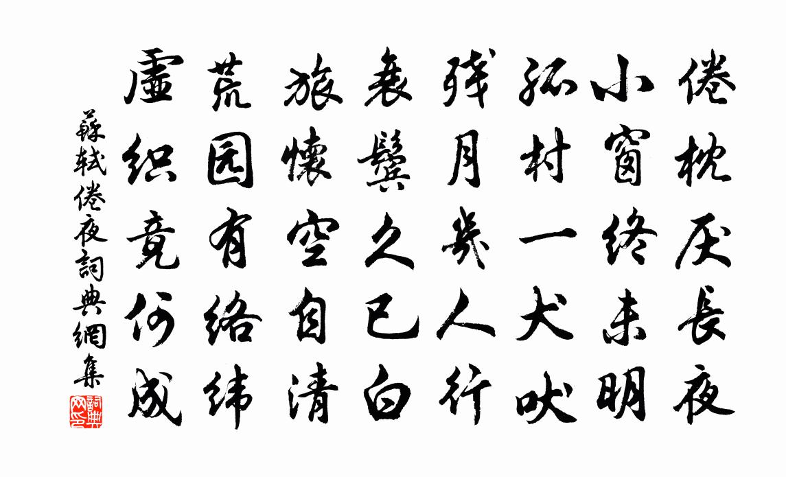 這首詩看上去極有柳宗元詩歌的味道,如“厭長夜”、“小窗”、“孤村”、“殘月”、“衰鬢”、“荒園”、“旅懷”再加上靜夜犬吠的聲音效果,陰陰冷冷、孤獨悽苦。柳詩《中夜起望西園值月上》便有此感,《郊居歲暮》亦有同趣“屏居負山郭,歲暮驚離索。野迥樵唱來,庭空燒盡落。”可見,蘇軾是愛用柳詩的這些意象來表達自己的。但又像前面所說的一樣。蘇軾不是在堆砌柳宗元的淒冷意象,而是將其轉為己用,就如《倦夜》這首詩,如若粗心讀之,或會以為是柳詩,但稍加用心則會發現,這樣的詩,只有宋人,只有蘇軾才能寫出。在柳宗元的詩中這些意象是並列關係,是對仗關係,“······迴風一蕭瑟,林影久參差。······羈禽響幽谷,寒藻舞淪漪。”(柳宗元《南澗中題》)“愁深楚猿夜,夢斷越雞晨。”(柳宗元《梅雨》)如是也。而《倦夜》則實不然,它不是一句一景式的,而是一句緊接一句,類似於敘事詩的,之間也有著因果關係。聞得“孤村一犬吠”,才會有“殘月”下是否有人行的猜想,從而構想這位行者若不是隻身一人,則是很好了。從行者又聯想到自己一輩子孤身之旅,感慨萬千了。