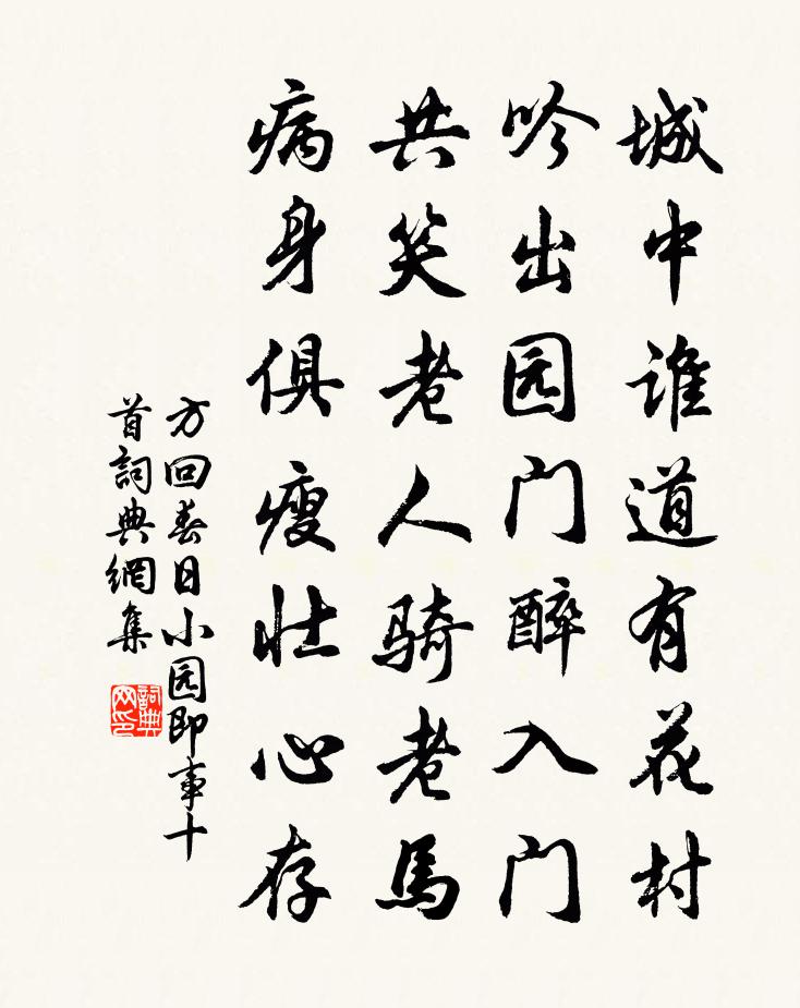 詩詞名句歷史字典書法欣賞書法字典國語詞典說文解字康熙字典古漢語字典標 題 作 者 詩 句 春日小園即事十首作者:方回 朝代:宋代春日小園即事十首原文城中誰道有花村,吟出園門醉入門。共笑老人騎老馬,病身俱瘦壯心存。詩詞問答問:春日小園即事十首的作者是誰?答:方回問:春日小園即事十首寫於哪個朝代?答:宋代方回春日小園即事十首書法欣賞春日小園即事十首書法作品詩詞推薦江漲徐寶之〔宋代〕萬里吳江湘浦圖,一春摹在小村隅。南山欲霽北山雨,昨日平濤今日湖。荻岸出時知水減,桐花過後有寒無。老漁頌古一○一首釋子淳〔宋代〕海底龍吟雲雨潤,林中虎嘯谷風清。莫言滿路生荊棘,況是家貧少送迎。我所思寄黃吉甫王安石〔宋代〕我所思兮在彭蠡,一奩寒晶徑千里。天低紺滑風靜止,月澹星渟尤可喜。亦復可憐波浪起,琉璃崩嵌涌顛絫。萬斛宮詞宋白〔宋代〕裡頭宮女淺妝梳,選入昭陽奉玉輿。一曲新聲春稱旨,賜緋教賜小金魚。雜詠一百首華佗劉克莊〔宋代〕古來神異少,天下妄庸多。文帝能全意,曹瞞竟殺佗。代董華卿以葺廬無力告於親舊間二首曾豐〔宋代〕敗屋猶余茅不多,其如凌雨震風何。破誰一部慳貪相,還我數間安樂窩。送游考功將漕夔門七絕洪咨夔〔宋代〕四肢誰謂可無骨,五肚自信難留寒。跂予望不之不得語,但願萬里書平安。治園二首胡寅〔宋代〕涉圃親鋤草,分畦剩種蔬。潤通鄰沼近,色映野雲虛。瘴重難求藥,心閒易看書。但令羹有梜,那嘆食無魚。丁亥冬大雪十數作鄧清曠以苦寒吟見寄艾性夫〔宋代〕十雪勢未已,一科天積陰。背風留更久,入夜落偏深。禾稼連冰柱,天花幻玉林。遙憐五峰老,尚寄苦寒吟。復雨方回〔宋代〕鬱蒸終不解,白晝忽昏迷。樹暗全如暮,禽驚誤欲棲。銀絲斜翠壁,雪練墮青梯。壯觀何須數,茫茫后土泥。送普岩維那釋崇岳〔宋代〕冶父門庭索索,東湖風波甚惡。知心能有幾人,萬里秋天一鶚。聞吉老縣丞按田在萬安山中黃庭堅〔宋代〕苦雨初聞喚婦鳩,紅妝滿院木蕖秋。樽前不記崔思立,應在諸山最上頭。紅窗迥王哲〔元代〕七十三,三十七。恁時節思量,王吉王吉。崖畔險也兀底,卻堤防腳失。奉勸回頭休要執。戴包巾、只在來年元日山居詩釋延壽〔宋代〕進退應須與智論,浮萍自在為無根。掃門何太拋途轍,解佩猶能棄渥恩。草徑旋封迷舊跡,苔階亂織露新痕。不唯次姜君玉韻且駕北固新居劉宰〔宋代〕門外青山跨伏龍,山頭未曉日生東。竹林已喜王戎近,蓮社還堪惠遠同。盛事正應符地勝,清才豈必坐詩窮。欲成初到忠州贈李六(一作李大夫)白居易〔唐代〕好在天涯李使君,江頭相見日黃昏。吏人生梗都如鹿,市井疏蕪只抵村。一隻蘭船當驛路,百層石磴上州門。更無送張無夢歸天台山王欽若〔宋代〕天台瓊台標奇狀,赤城瀑布懸千丈。中有高人混姓名,不向迷途隨得喪。閒尋棋侶過清溪,靜撥雲根種紫芝。八卦品令辛棄疾〔宋代〕迢迢征路。又小舸、金陵去。西風黃葉,淡煙衰草,平沙將暮。回首高城,一步遠如一步。江邊朱戶。忍追憶、分和王內史從駕狩詩庾信〔南北朝〕冬狩出離宮。還過獵武功。澗橫偏礙馬。山虛絕響弓。更嬴承落鴈。韓盧鬬蟄熊。猶開三面網。誰肯一山重。折楊柳五首曹勛〔宋代〕折楊柳,上隋堤,攀條同憶送君時。君王近發關中卒,更戍歸來尚未遲。名句推薦碧水丹山映杖藜,夕陽猶在小橋西。沈周《題畫》 蘭溪三日桃花雨,半夜鯉魚來上灘。戴叔倫《蘭溪棹歌》 人有所好,以好誘之無不取,人有所懼,以懼迫之無不納。來俊臣《羅織經·治下卷第三》 楓林凋翠,寒雁聲悲。趙長卿《柳梢青·過何郎石見早梅》 貨無大小,缺者便貴。馮夢龍《醒世恆言·卷三十五》 光陰可惜,譬諸逝水。顏之推《顏氏家訓·勉學篇》 青綾被,莫憶金閨故步晁補之《摸魚兒·東皋寓居》 多謝月相憐,今宵不忍圓。朱淑真《菩薩蠻·山亭水榭秋方半》 坐愁群芳歇,白露凋華滋。李白《秋思》 塞北梅花羌笛吹,淮南桂樹小山詞。劉禹錫《楊柳枝詞九首·其一》