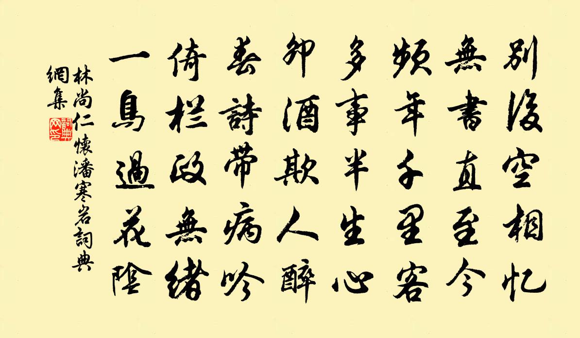 詩詞名句歷史字典書法欣賞書法字典國語詞典說文解字康熙字典古漢語字典標 題 作 者 詩 句 懷潘寒岩作者:林尚仁 朝代:宋代懷潘寒岩原文別後空相憶,無書直至今。頻年千里客,多事半生心。卯酒欺人醉,春詩帶病吟。倚欄政無緒,一鳥過花陰。詩詞問答問:懷潘寒岩的作者是誰?答:林尚仁問:懷潘寒岩寫於哪個朝代?答:宋代林尚仁懷潘寒岩書法欣賞懷潘寒岩書法作品詩詞推薦挽鄧南山趙必象〔宋代〕老子平生不好諛,莫教猿鶴費分疏。只消題作南山墓,種竹一庭梅百株。踏莎行 雪中看梅花王旭〔元代〕兩種風流,一家製作。雪花全似梅花萼。細看不是雪無香,天風吹得香零落。雖是一般,惟高一著。雪花不似梅花秋社日崇讓園宴得新字蘇頲〔唐代〕鳴爵三農稔,句龍百代神。運昌叨輔弼,時泰喜黎民。樹缺池光近,雲開日影新。生全應有地,長願樂交親。白鶴館夜坐陸游〔宋代〕竹聲風雨交,松聲波濤翻。我坐白鶴館,燈青無晤言。廓然心境寂,一洗吏卒喧。袖手喔新詩,清寒媿雄渾。屈宋句黃徹〔宋代〕但遣一枝居巧婦,不殊大廈賀嘉賓。白云然師王安石〔宋代〕白首一山中,形骸槁木同。苔爭庵徑路,雲補衲穿空。塵土隨車轍,波濤信柂工。昏昏老南北,應謝此高風。六月甲申雨後涼氣如秋舒岳祥〔宋代〕蘋花訊息入疏欞,六月何曾有此清。晚飯出門新雨過,深衣臨水早蟬鳴。月西人影如鴻影,風裡松聲帶鶴聲。此意秋意呈鄰幾吳充司馬光〔宋代〕新涼入閭巷,舊暑何人掃。筠籠賣紅蓮,莎階墜丹棗。蕉衫日以疏,紈扇安能好。蟬悲西風樹,燕亂斜陽草。此意寄涇北都運待制施正臣宋祁〔宋代〕我作東南守,君為河朔行。旌旂向江步,笳鼓入邊聲。共結光華遇,難禁離索情。惟應指羊酪,未肯下蒪羹。山下泉李端〔唐代〕碧水映丹霞,濺濺度淺沙。暗通山下草,流出洞中花。淨色和雲落,喧聲繞石斜。明朝更尋去,應到阮郎家。揚州成元章居竹軒王冕〔元代〕老夫住近山陰曲,萬竹中間一草堂。開徑不曾防俗客,讀書恰是得清涼。好風時時動環佩,明月翩翩來鳳凰。正與十一月九日新灘李□示余開禧三年四月九日所魏了翁〔宋代〕憶從筮仕歲涒灘,三十餘年閱暑寒。撫事無成人潦倒,懷人有夢涕汍瀾。家山擾擾膠膠里,廟社禧禧出出間。欲上平步樓陳藻〔宋代〕主翁面貌不堪夸,卻是書中意味華。因地成樓平似陟,開林見樹直仍斜。竟日清幽來佛寺,有時問答覺人家。厭隨將離宣城寄吳正仲梅堯臣〔宋代〕吳均花詩語多奇花揭,苦倩花鴛鴦謝明花月。昭亭川上此禽閒,為寄吳郎我西發。西歸千里浮輕舟,夜觀蟾光逆水禽獸昆蟲之孝十首鶴林同〔宋代〕好是鶴鳴陰,居然子和聲。休雲氣所感,自是物之情。得舍弟行可鹽官病後書林亦之〔宋代〕荷花開盡蓼花紅,遊子今年秋又窮。千里病眠鴻雁影,一書愁殺月魚翁。天寒好處予煨芋,日落何山汝轉蓬。名利初除尚書郎,脫刺史緋白居易〔唐代〕親賓相賀問何如,服色恩光盡反初。頭白喜拋黃草峽,眼明驚拆紫泥書。便留朱紱還鈴閣,卻著青袍侍玉除。無奈點絳唇石孝友〔宋代〕日薄風遲,柳眠無力花枝妥。燕樓空鎖。好夢誰驚破。寒食清明,又等閒都過。愁無那。淚珠頻墮。灑盡相思顆。故原有戰卒死而復甦來說當時事梅堯臣〔宋代〕縱橫屍暴積,萬殞少全生。飲雨活胡地,脫身歸漢城。野貛穿廢灶,妖鵬嘯空營。侵骨劍瘡在,無人為不驚。次韻董聲可重五陳著〔宋代〕人事俄隨世事殊,尚存榴艾伴嘻吁。懷沙到處哀新鬼,瑞市何時見醉夫。榮賜休思當暑葛,早衰空感望秋蒲。辟兵名句推薦家童掃蘿徑,昨與故人期。錢起《谷口書齋寄楊補闕》 江山如此多嬌,引無數英雄競折腰 * 《沁園春·雪》 秋聲萬戶竹,寒色五陵松。李頎《望秦川》 金谷園中柳,春來似舞腰。李益《上洛橋》 春草細還生,春雛養漸成。揭傒斯《畫鴨》 等閒老去年華促。只有江梅伴幽獨。孫道絢《滴滴金·梅》 其出不出,間不容髮。班固《漢書·傳·賈鄒枚路傳》 來時父母知隔生,重著衣裳如送死。王建《渡遼水》 渡頭餘落日,墟里上孤煙。王維《輞川閒居贈裴秀才迪》 跬步不休,跛鱉千里;累積不輟,可成丘阜。劉安及其門客《淮南子·說林訓》
