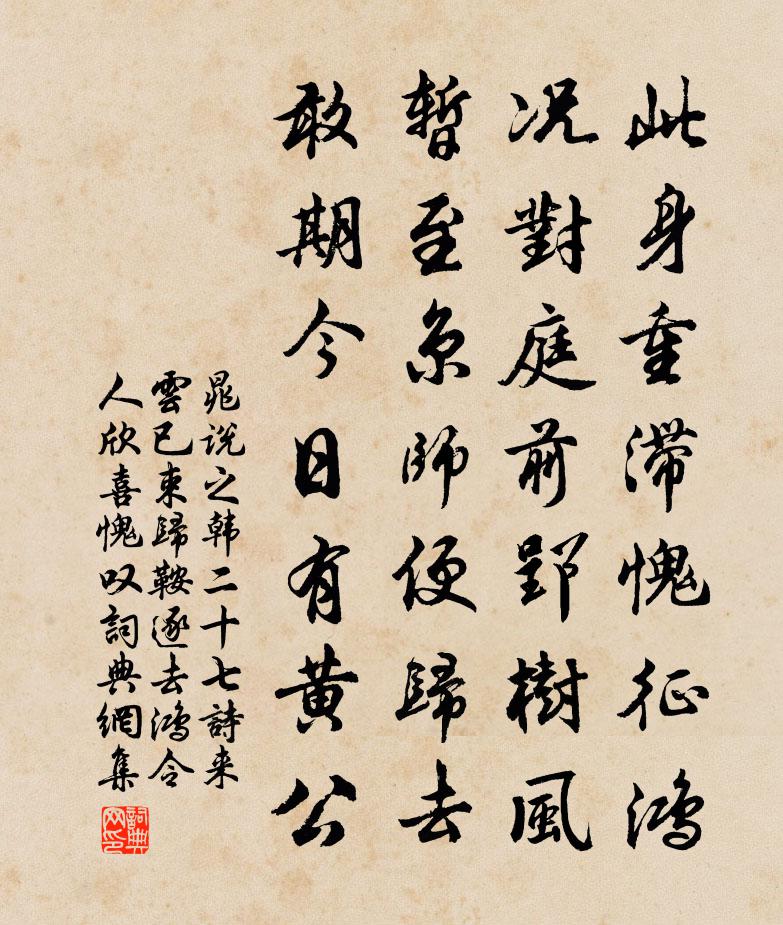 詩詞名句歷史字典書法欣賞書法字典國語詞典說文解字康熙字典古漢語字典標 題 作 者 詩 句 韓二十七詩來雲已束歸鞍逐去鴻令人欣喜愧嘆作者:晁說之 朝代:宋代原文此身重滯愧征鴻,況對庭前郢樹風。暫至京師便歸去,敢期今日有黃公。詩詞問答問:《韓二十七詩來雲已束歸鞍逐去鴻令人欣喜愧嘆》的作者是誰?答:晁說之問:該詩寫於哪個朝代?答:宋代書法欣賞韓二十七詩來雲已束歸鞍逐去鴻令人欣喜愧嘆書法作品詩文賞析【原題】:韓二十七詩來雲已束歸鞍逐去鴻令人欣喜愧嘆輒次韻和詩詞推薦贈致仕沈彬郎中李中〔唐代〕自言婚嫁畢,塵事不關心。老去詩魔在,春來酒病深。山翁期採藥,海月伴鳴琴。多謝維舟處,相留接靜吟。踏莎行張掄〔宋代〕一道飛泉,來從何許。空山積翠無人處。潺湲時和七弦琴,溟濛忽散千岩雨。不問春秋,何拘今古。清音一聽忘千秋堂夕元稹〔唐代〕炎涼正回互,金火郁相乘。雲雷時交構,川澤方蒸騰。清風一朝勝,白露忽已凝。草木凡氣盡,始見天地澄。況此被旨許浦蒐兵道中凍合舍舟行陸二首袁說友〔宋代〕已辦輕舟著腳登,笑渠河伯故陰凝。徵車政欲周阡陌,贏得天教一夜冰。月中行/月宮春周邦彥〔宋代〕蜀絲趁日染乾紅。微暖面脂融。博山細篆靄房櫳。靜看打窗蟲。愁多膽怯疑虛幕,聲不斷、暮景疏鍾。團團四壁小浣溪沙周密〔宋代〕不下竹簾怕燕瞋。旋移芳檻引流鶯。春光卻早又中分。杏火無煙然綠暗,梨雲如雪冷清明。冶遊天氣冶遊心。月夜懷子肅昆仲趙蕃〔宋代〕眼邊風月佳如此,把卷題詩卻未工。剩喜俗塵如世隔,更憐清趣與誰同。荷侵水檻公懷我,檜合茅檐我念公。想與與周長官、李秀才游徑山,二君先以詩見寄,蘇軾〔宋代〕龍亦戀故居,百年尚來去。至今雨雹夜,殿闇風纏霧。而我棄鄉國,大江忘北渡。便欲此山前,築室安遲暮。又恐滿庭芳黃公度〔宋代〕一徑叉分,三亭鼎峙,小園別是清幽。曲闌低檻,春色四時留。怪石參差臥虎,長松偃蹇拿虬。攜筇晚,風來萬里大雪用前韻五首裘萬頃〔宋代〕伊人元不墮危機,踏凍沖寒正自奇。只怪飛花無處避,都忘炊玉有時飢。月明剡水回舟夜,歲暮梁園作賦時。一段寄適安胡仲弓〔宋代〕別來不作故人收,堪笑痴翁懶有餘。世路每於平處險,交情多是密中疎。梅花至老香猶在,竹節雖高心本虛。門對戊申年七夕五絕劉筠〔宋代〕琥車芝駕儼清秋,微雨侵宵助涕流。人世莫嗟離恨苦,卻應天上更悠悠。金盞倒垂蓮(牡丹)曹勛〔宋代〕穀雨初晴,對曉霞乍斂,暖風凝露。翠雲低映,捧花王留住。滿闌嫩紅貴紫,道盡得、韶光分付。禁篽浩蕩,天香李貳車約飲東湖程公許〔宋代〕西湖繞遍又東湖,永夜論文酒淺{奭斗}。最愛霜林梅蘸水,擬撐小艇訪林逋。陶兀居士贊黃庭堅〔宋代〕兀兀陶陶,借書借不得。陶陶兀兀,問字問不得。是醒是醉,佛也會不得布衣簪紱,有人扶便得。句張淏〔宋代〕今朝執手難言處,此去傾懷更有誰。游酆都觀二首郭印〔宋代〕仙籍平都化,今晨喜一過。彩雲空洞穴,古木上藤蘿。龍勢山盤轉,禽聲日詠歌。我來思際遇,亭下久婆娑。菊梅交承楊公遠〔宋代〕寒花璨璨繞東籬,露洗霜欺未肯萎。褪卻清香誰領略,北風吹上小梅枝。次韻程機宜感懷曹勛〔宋代〕浩蕩氣明絜,慷慨念廢興。何能一念息,空令眾愁增。蝴蝶飛(一作蝴蝶舞)李賀〔唐代〕楊花撲帳春雲熱,龜甲屏風醉眼纈。東家蝴蝶西家飛,白騎少年今日歸。名句推薦怒髮衝冠,憑欄處、瀟瀟雨歇。岳飛《滿江紅·寫懷》 何日請纓提銳旅,一鞭直渡清河洛。岳飛《滿江紅·登黃鶴樓有感》 盡無言、閒品秦箏,淚滿參差雁呂渭老《薄倖·青樓春晚》 除害在於敢斷;得眾在於下人。尉繚《尉繚子·十二陵》 不知天上宮闕,今夕是何年。蘇軾《水調歌頭·丙辰中秋》 兩岸月橋花半吐。紅透肌香,暗把遊人誤。真德秀《蝶戀花·兩岸月橋花半吐》 國無九年之蓄曰不足,無六年之蓄曰急,無三年之蓄曰國非其國也。戴聖《禮記·王制》 末路驚風雨,窮邊飽雪霜文天祥《除夜》 大仇必去,小人勿輕,禍不可伏。來俊臣《羅織經·固榮卷第六》 不辭山路遠,踏雪也相過。張九齡《答陸澧》
