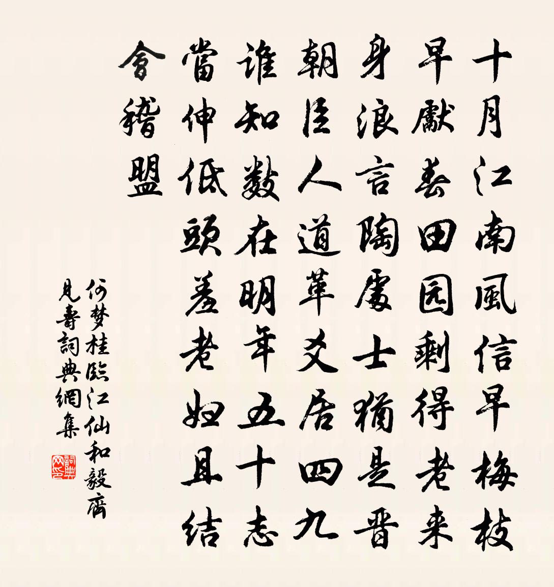 詩詞名句歷史字典書法欣賞書法字典國語詞典說文解字康熙字典古漢語字典標 題 作 者 詩 句 臨江仙(和毅齊見壽)作者:何夢桂 朝代:宋代臨江仙(和毅齊見壽)原文十月江南風信早,梅枝早D335先春。田園剩得老來身。浪言陶處士,猶是晉朝臣。人道革爻居四九,誰知數在E578B97E。明年五十志當伸。低頭羞老婦,且結會稽盟。詩詞問答問:臨江仙(和毅齊見壽)的作者是誰?答:何夢桂問:臨江仙(和毅齊見壽)寫於哪個朝代?答:宋代何夢桂臨江仙(和毅齊見壽)書法欣賞臨江仙(和毅齊見壽)書法作品詩詞推薦觀燈市井之利得雨農田所急而二者不可以並時韓維〔宋代〕風回協氣通青律,月破游氛上碧天。萬盞華燈輝永夜,一犁甘雨報豐年。梅含宿潤粧先試,荑新桑手不拳。雲勢崇太常引·建康中秋夜為呂叔潛賦辛棄疾〔宋代〕一輪秋影轉金波。飛鏡又重磨。把酒問姮娥。被白髮、欺人奈何。乘風好去,長空萬里,直下看山河。斫去桂婆娑聞鄰舟琵琶朱翌〔宋代〕檣烏逐風不停飛,尾燕掠水東復西。蠻弦金撥竅私語,行富轉頭聲更悲。擾擾雲吹寶鬟綠,新妝半隱朱簾曲。無限水龍吟·落花飛絮茫文廷式〔清代〕落花飛絮茫茫,古來多少愁人意。遊絲窗隙,驚飆樹底,暗移人世。一夢醒來,起看明鏡,二毛生矣。有葡萄美酒偶作二首白居易〔唐代〕戰馬春放歸,農牛冬歇息。何獨徇名人,終身役心力?來者殊未已,去者不知還。我今悟已晚,六十方退閒。猶勝諸子將築室以畫圖相示三首蘇轍〔宋代〕還家卜築初無地,隨分經營似有時。多斫修篁終未忍,略存古柏更無疑。畫圖且作百間計,入室猶應三歲期。得到貧女張碧〔唐代〕豈是昧容華,豈不知機織。自是生寒門,良媒不相識。送僧歸護國寺馮元〔宋代〕南宗開士共推賢,語默忘機合自然。上國經游雲出岫,故山歸去鶴沖天。艤舟卻指靈溪岸,烹茗還資瀑布泉。宴坐過龍灣五王閣訪友人不遇戴叔倫〔唐代〕野橋秋水落,江閣暝煙微。白日又欲午,高人猶未歸。青林依古塔,虛館靜柴扉。坐久思題字,翻憐柿葉稀。光孝病中聞予與在天封亦冒雪見過曹勛〔宋代〕老病維摩方丈開,天風破冷舞瓊瑰。滿山皓色作和氣,知是道人沖雪來。春余遣興元稹〔唐代〕春去日漸遲,庭空草偏長。餘英間初實,雪絮縈蛛網。好鳥多息陰,新篁已成響。簾開斜照入,樹褭遊絲上。絕跡席君從於洛城種金橘今秋始結六實以其四獻開司馬光〔宋代〕物不須多且賞奇,禦寒想見結庵時。江南江北徒虛語,盡信前書是不宜。雪後復雨過西湖釋紹嵩〔宋代〕觸目成幽興,詩今十數篇。風傾竹上雪,鳥度水中天。急雨涔涔日,迎人小小船。更逢清管發,聲到客愁邊。聖泉寺松徑蔡襄〔宋代〕青松苒苒門前道,根氐堅牢顏色好。鳴籟蕭森風雨生,紫鱗開動龍蛇老。天若有意別留種,百年其下無纖草。雷霆歸來 其二王冕〔元代〕某水某丘在,杖藜隨處行。窮幽那適興,豈是未忘情?契彼漁樵樂,於吾勢利輕。雲根老梅樹,花發最分明。菊花十二首史鑄〔宋代〕無艷無妖別有香,知心誰解賞孤芳。淵明酩酊知何處,安得斯人共一觴。謝微之見過王安石〔宋代〕此身已是一枯株,所記交朋 * 無。唯有微之來訪舊,天寒幾夕擁山爐。景祐常祀二首仁宗〔宋代〕翕受駿命,震疊群方。侑祀上帝,德厚流光。竹丁謂〔宋代〕自保猗猗綠,誰憐冉冉根。紫花含鳳實,繡籜抱龍孫。掃月仙壇靜,搖風雪霧昏。彤竿思化杖,紺棄想開樽。秋蕊香(用清真韻)王從叔〔宋代〕薄薄羅衣乍暖,紅入酒痕潮面。絮花舞倦帶嬌眼。昨夜平堤水淺。故人信斷風箏線。誤歸燕。夢魂不怕山路遠。無名句推薦狗吠深巷中,雞鳴桑樹顛。陶淵明《歸園田居·其一》 牧人驅犢返,獵馬帶禽歸。王績《野望》 不近人情,舉世皆畏途;不察物情,一生俱夢境。陳繼儒《小窗幽記·集醒篇》 算遺蹤、猶有枕囊留,相思物。吳文英《滿江紅·劉朔齋賦菊和韻》 二月巴陵日日風,春寒未了怯園公。陳與義《春寒》 修己而不責人,則免於難。左丘明《左傳·閔公·閔公二年》 詩酒趁年華。蘇軾《望江南·超然台作》 千古風流八詠樓,江山留與後人愁。李清照《題八詠樓》 治民無常,唯治為法。韓非及後人《韓非子·心度》 梨花最晚又凋零,何事歸期無定準。歐陽修《玉樓春·去時梅萼初凝粉》