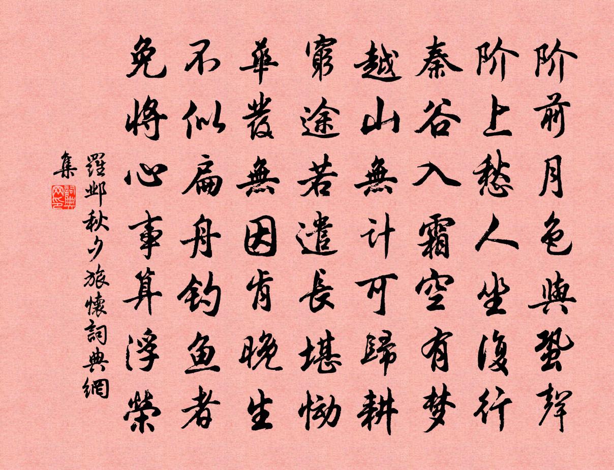 詩詞名句歷史字典書法欣賞書法字典國語詞典說文解字康熙字典古漢語字典標 題 作 者 詩 句 秋夕旅懷作者:羅鄴 朝代:唐代秋夕旅懷原文階前月色與蛩聲,階上愁人坐復行。秦谷入霜空有夢,越山無計可歸耕。窮途若遣長堪慟,華發無因肯晚生。不似扁舟釣魚者,免將心事算浮榮。詩詞問答問:秋夕旅懷的作者是誰?答:羅鄴問:秋夕旅懷寫於哪個朝代?答:唐代問:秋夕旅懷是什麼體裁?答:七律羅鄴秋夕旅懷書法欣賞秋夕旅懷書法作品注釋全唐詩:卷654-57詩詞推薦句戴表元〔宋代〕更有鄰牆全處士,醉吟能泛百杯寬。挽王侍郎二首杜范〔宋代〕地靈鍾國秀,臚唱壓時名。虎觀堅廉節,螭坳振直聲。志隨時暫郁,身與道俱榮。人羨腰金日,於公孰重輕。鷓鴣天(祝良顯家牡丹一本百朵)辛棄疾〔宋代〕占斷雕欄只一株。春風費盡幾工夫。天香夜染衣猶濕,國色朝酣酒未蘇。嬌欲語,巧相扶。不妨老乾自扶疏。恰如見還樓次敏齋陳先生韻楊公遠〔宋代〕目欲窮千里,樓頭著意看。雲橫知岫遠,野迥覺天寬。對景詩懷壯,乘風衣袂寒。主人還解事,容我恣憑蘭。絕句楊冠卿〔宋代〕忽憶前時小院歸,杏花牆角兩三枝。夜香燒斷黃昏月,縹緲鄰家玉笛吹。卜運算元(二月二十六日夜大雷雨,枕上作)郭應祥〔宋代〕午夜一聲雷,急雨如飛雹。枝上殘紅半點無,密葉都成幄。苦恨薄書塵,剛把閒身縛。卻意湄湘春暮時,處處堪行新作春野亭蔡襄〔宋代〕太守職民治,詔書劭吾農。載酒事緬邈,作室當廨中。況憑軒牖高,中視田野功。澹沲沐新澤,依微生柔風。江潮小孤山傅文翁〔宋代〕灩澦拓瞿塘,二孤障瀾蠡。大哉神禹功,天地相終始。行路難·縛虎手賀鑄〔宋代〕縛虎手。懸河口。車如雞棲馬如狗。白綸巾。撲黃塵。不知我輩,可是蓬蒿人。衰蘭送客鹹陽道。天若有情天亦老七十翁五言十首方回〔宋代〕愁與憂全異,歡于樂尚遙。百年元易度,一日卻難消。玉叵圭中必,桐猶爨下焦。襟懷殊鬱郁,縱目卻飄飄。贈崇壽寺僧善修周必大〔宋代〕老僧九十視眈眈,二十年來不下山。我得九華充法供,亦能禁足老山間。金山寓居釋尚能〔宋代〕風霜千里未歸身,古蹟遲留外俗群。月到天心當剎見,濤分山脊在樓聞。倚吟老樹棲沙鳥,寄臣虛岩貯海雲。唯恐憶江上吳處士賈島〔唐代〕閩國揚帆去,蟾蜍虧復團。秋風生渭水,落葉滿長安。此地聚會夕,當時雷雨寒。蘭橈殊未返,訊息海雲端。羅浮寄公儲子洪二兄四首劉克莊〔宋代〕片帆約我上羅浮,已戒籃輿與共游。到得羅浮君不見,後期又是八千秋。城中冠蓋匆匆散,老子空攜影逐身。追路寄趙庶明推官石介〔宋代〕四十年來贊太平,君王耳畔管簫聲。定襄地域俄連震,萊牧男兒忽議兵。明日邊烽高百尺,同時御府出三旌。將軍岷山萬松圖張元乾〔宋代〕疊嶂連娟入翠微,喬松蔽日有孫枝。江流不盡松聲遠,雪棧行人力困時。眼兒媚仇遠〔宋代〕苔箋醉草調清平。鴉墨濕浮雲。霓裳步冷,瓊簫聲斷,舊夢關心。小喬不戀周郎老,翠被折秋痕。那堪門外,黃花有所思陳允平〔宋代〕憶昔美人初別時,長亭兩岸柳依依。今日美人天之涯,美人美人胡不歸。憶昔君別妾,分破青鸞鏡,破鏡如破心。減字木蘭花徐鹿卿〔宋代〕狂吟江浦。不食人間煙火語。韋曲名家。也試河陽一縣花。群仙推去。暫寄嶺梅清絕處。笑俯清溪。只有清風明月東坡引(癸巳豫章)趙師俠〔宋代〕飛花紅不聚。都因夜來雨。枝頭冷落情如許。東風誰是主。看看滿地,堆卻香絮。但目斷、章台路。殘英剩蕊留春名句推薦錢塘江上潮信來,今日方知我是我。施耐庵《水滸傳·第一百一十九回》 別浦今朝暗,羅帷午夜愁李賀《七夕》 故人入我夢,明我長相憶。杜甫《夢李白二首·其一》 絲槐煙柳長亭路,恨取次、分離去。惠洪《青玉案·絲槐煙柳長亭路》 千淘萬漉雖辛苦,吹盡狂沙始到金。劉禹錫《浪淘沙九首》 過能改,歸於無。倘掩飾,增一辜。李毓秀《弟子規·信》 漸近燕山。回首鄉關歸路難。蔣氏女《減字木蘭花·題雄州驛》 見說馬家滴粉好,試燈風裡賣元宵。符曾《上元竹枝詞》 抽刀斷水水更流,舉杯消愁愁更愁。李白《宣州謝朓樓餞別校書叔雲》 易漲易退山溪水,易反易覆小人心。佚名《增廣賢文·上集》