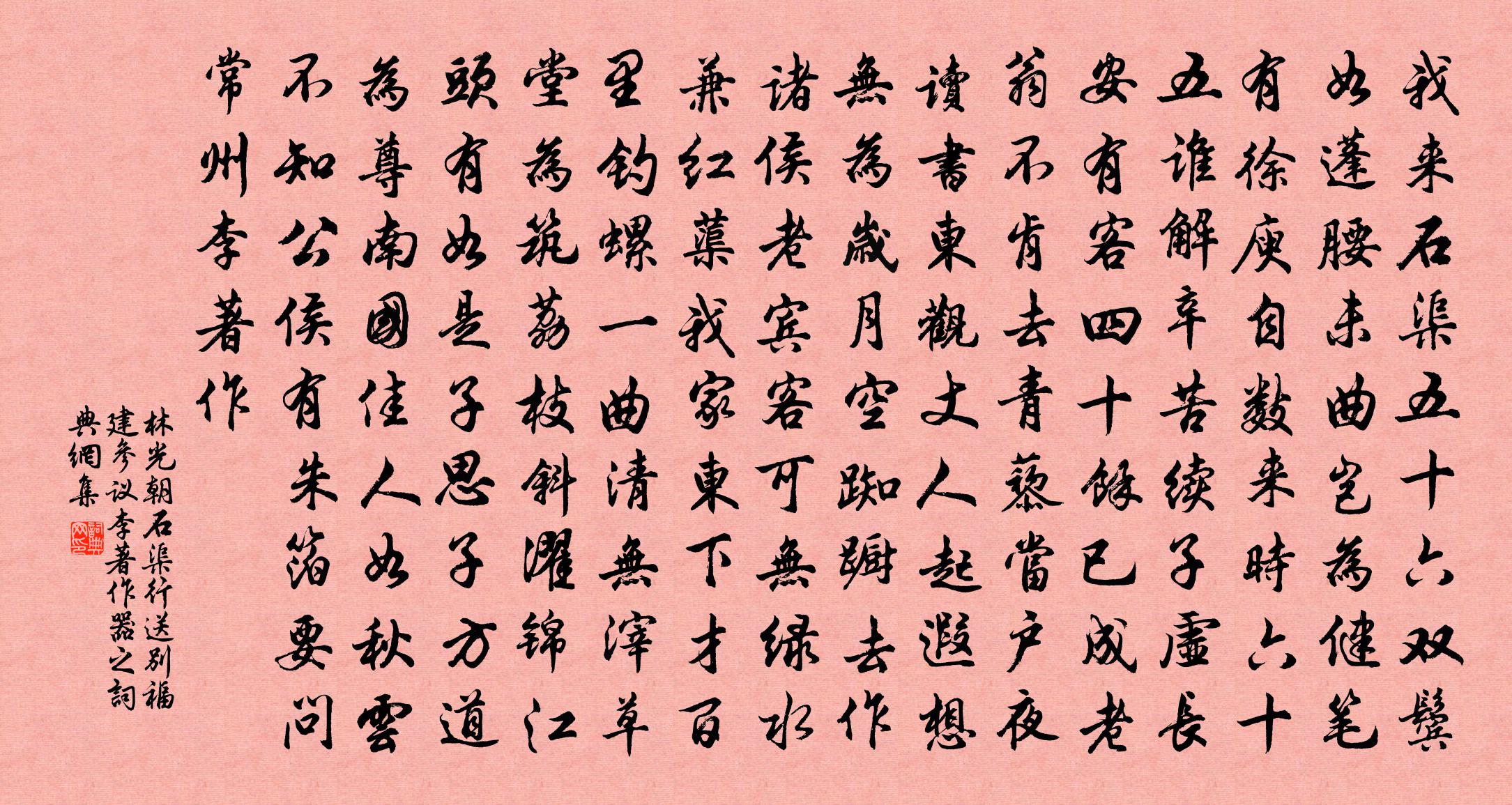 詩詞名句歷史字典書法欣賞書法字典國語詞典說文解字康熙字典古漢語字典標 題 作 者 詩 句 石渠行送別福建參議李著作器之作者:林光朝 朝代:宋代原文我來石渠五十六,雙鬢如蓬腰未曲。豈為健筆有徐庾,自數來時六十五。誰解辛苦續子虛,長安有客四十餘。已成老翁不肯去,青藜當戶夜讀書。東觀丈人起遐想,無為歲月空踟躕。去作諸侯老賓客,可無綠水兼紅蕖。我家東下才百里,釣螺一曲清無滓。草堂為築荔枝斜,濯錦江頭有如是。子思子方道為尊,南國佳人如秋雲。不知公侯有朱箔,要問常州李著作。詩詞問答問:《石渠行送別福建參議李著作器之》的作者是誰?答:林光朝問:該詩寫於哪個朝代?答:宋代書法欣賞石渠行送別福建參議李著作器之書法作品詩詞推薦句王悅〔宋代〕雞犬數聲雲一雹,春陽桃李渺成蹊。鷓鴣天程珌〔宋代〕飲罷天廚碧玉觴。仙韶九奏少停章。何人採得扶桑椹,搗就藍橋碧紺霜。凡骨變,驟清涼。何須仙露與瓊漿。君恩白馬井許康民〔宋代〕矍鑠平生善用兵,論他薏苡得貪名。不因渴驥遺蹤在,誰識將軍到底清。天寒留滯山中即事衛宗武〔宋代〕逾月留窮源,不覺歲雲暮。緒景寢淒涼,生陰方固沍。芳叢菊殫殘,丹楓葉飛舞。蒙茸豐草萎,剝落喬木古。茲來呈毛伯明李叔器趙蕃〔宋代〕陰雨春三月,倦遊天一隅。故難同類我,還復嘆猶吾。不惑防終蔽,無聞恐遂愚。猶欣得師友,可以慰羈孤。送友人歸越連文鳳〔宋代〕吳越青山猶好在,古今明月不長圓。可堪老大重離別,一片愁心落照邊。烏衣巷朱存〔唐代〕閥閱淪亡梐(木互)移,年年舊燕亦雙歸。茅檐葦箔無冠蓋,不見烏衣見白衣。荔枝香近·送人游南徐吳文英〔宋代〕錦帶吳鉤,征思橫雁水。夜吟敲落霜紅,船傍楓橋系。相思不管年華,喚酒吳娃市。因話、駐馬新堤步秋綺。 淮絕句朱淑真〔宋代〕乳燕調雛出畫檐,游蜂喧翅入珠簾。日長無事人慵困,金鴨香銷懶更添。春雲李中〔唐代〕陰去為膏澤,晴來媚曉空。無心亦無滯,舒捲在東風。送人之湘陰謁知己林昉〔宋代〕一聲歌未斷,江動欲潮生。是月寒露下,故人湘水行。沙雲晴見雁,船火夜聞箏。謝令應相喜,先期發吏迎。和景彝對花王珪〔唐代〕林梢拂曉禽初哢,門外經春柳自搖。可嘆流年催白髮,便將幽意屬芳條。玉杯放酒成蕭索,錦帳留燈照寂寥。任是孝宗皇帝輓詞五首陳傅良〔宋代〕藝祖開皇極,何心畀後昆。天將翊堯運,世復見湯孫。武接規模在,仁追典則存。煌煌宋宗社,永永配乾坤。哭嚴僕射歸櫬杜甫〔唐代〕素幔隨流水,歸舟返舊京。老親如宿昔,部曲異平生。風送蛟龍雨,天長驃騎營。一哀三峽暮,遺後見君情。和宏父新秋詩張耒〔宋代〕年年庭下梧桐葉,長為騷人先報秋。已驚歲月悲霜鬢,更望山川歌四愁。浮生百感漫自苦,一醉萬慮同時休。瀛洲題靈岩寺趙善悉〔宋代〕江南多名山,雁盪最崒嵂。山中多古寺,靈岩渺無匹。天柱高摩雲,展旗巧障日。風榻臥石屏,霧窗涵卓筆。上有壽徐尉趙福元〔宋代〕幔亭駕斗浮丹巘,扁題密鏤黃金篆。淋漓羽蓋森鸞旂,仙凡不隔蟠桃宴。紅雲垂地醉壺天,真珠為漿玉為饌。中有海棠陳與義〔宋代〕春雨夜有聲,連林杏花落。海棠已復動,寒食豈寂寞。人間有此麗,赴我隔年約。花葉兩分明,春陰耿簾幙。東風和韓履善韻袁甫〔宋代〕雨雪霏霏,青山華巔。能令山老,曷不老泉。雪高高山,雪深深淵。山自寂寂,泉自涓涓。我愛嶙峋,亦愛漪漣。早下蓬嶺陳藻〔宋代〕煙雲深里日攀躋,嶺上宵眠雨電低。清曉攜筇遵下路,高峰對面與胸齊。名句推薦採蓮南塘秋,蓮花過人頭。佚名《西洲曲》 東君也不愛惜,雪壓霜欺。晁沖之《漢宮春·梅》 畫船撐入花深處,香泛金卮。歐陽修《採桑子·荷花開後西湖好》 不管三七二十一馮夢龍《醒世恆言·卷一》 鼎湖流水清且閒,軒轅去時有弓劍,古人傳道留其間李白《飛龍引二首·其二》 青青一樹傷心色,曾入幾人離恨中。白居易《青門柳》 握手一長嘆,淚為生別滋蘇武《留別妻》 自聞穎師彈,起坐在一旁。韓愈《聽穎師彈琴》 桃未芳菲杏未紅,沖寒先已笑東風。曹雪芹《紅樓夢·第五十回》 丈夫志,當景盛,恥疏閒。蘇舜欽《水調歌頭·滄浪亭》