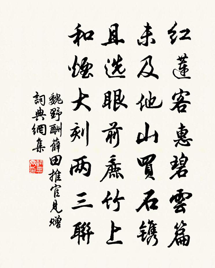 詩詞名句歷史字典書法欣賞書法字典國語詞典說文解字康熙字典古漢語字典標 題 作 者 詩 句 酬薛田推官見贈作者:魏野 朝代:宋代酬薛田推官見贈原文紅蓮客惠碧雲篇,未及他山買石鐫。且選眼前麄竹上,和煙大刻兩三聯。詩詞問答問:酬薛田推官見贈的作者是誰?答:魏野問:酬薛田推官見贈寫於哪個朝代?答:宋代魏野酬薛田推官見贈書法欣賞酬薛田推官見贈書法作品詩詞推薦舟行入剡崔顥〔唐代〕鳴棹下東陽,回舟入剡鄉。青山行不盡,綠水去何長。地氣秋仍濕,江風晚漸涼。山梅猶作雨,溪橘未知霜。謝客送陸渾主簿趙宗儒之任姚系〔唐代〕山中眇然意,此意乃平生。常日望鳴皋,遙對洛陽城。故人吏為隱,懷此若蓬瀛。夕氣冒岩上,晨流瀉岸明。存亡次韻何子聞安靜觀李流謙〔宋代〕日壓茅檐醉擁蓑,靜聽寒溜奏雲和。深藏本自身全路,瞪眎元知語不多。紫府地嚴須一到,蒼崖文古要重磨。新宮絕句五首劉子翬〔宋代〕喜聞歸騎已揚鑣,載酒相迎不憚遙。我是武夷東道主,便同蠟屐上焦嶢。殊聖寺和孟我幕韻吳詠〔宋代〕院靜僧疑少,門幽客自稀。山寒雲近屋,徑狹石侵衣,松鬣蒼髯古,姜芽紫筍肥。騷人詩戰罷,踏月夜深歸。次韻罷相游故園宋祁〔宋代〕戟棨嚴門第,鐶金倦帶圍。如公三事老,從古幾人歸。喜方溪復歸白雲釋行海〔宋代〕十載青燈自苦辛,懶將白眼顧浮塵。鳳聲偏近瑤台月,草色難連玉樹春。雲有去來非本意,世無榮辱是何人。幾番刮釜周南〔宋代〕刮釜嗟鄰母,經旬值濕薪。煎磨知物性,豐大轉民貧。康食心知愧,哀囂聽頗親。稻花傷晝雨,愁殺看書人。頌證道歌證道歌釋印肅〔宋代〕舍妄心,取真理,猛火聚中求冷水。勝勢婆羅請上山,須臾便入三摩底。秀州相士歌楊維楨〔元代〕秀州相士薛見心,重湖風雨來相見。手把茅山道人詩,亦有胡僧寫束絹。自雲膝不拜公卿,海內名人初入卷。縹綾題居延古城贈喬十二知之陳子昂〔唐代〕聞君東山意,宿昔紫芝榮。滄洲今何在,華發旅邊城。還漢功既薄,逐胡策未行。徒嗟白日暮,坐對黃雲生。桂枝次韻知常德袁尊固監丞送別四詩魏了翁〔宋代〕試把行藏為子評,只知盡分敢徼名。出如有益殷三聘,用不能行魯兩生。此道古人如飲食,後來灶婢或猜驚。子云歲莫二首蘇轍〔宋代〕嶺南萬里歸來客,潁上六年多病身。未死誰言猶有命,長閒豈復更尤人。眼看世事知難了,手注遺編近一新。點檢句陳輔〔宋代〕含識應為獅子去,卻來重載法王身。布袋贊釋了惠〔宋代〕烏藤橫占閻浮界,鼻孔直撐兜率天。剛道化身千百億,一身猶自不完全。次韻子夷兄弟十首張耒〔宋代〕文園得武皇,引疾常避事。佳哉意殊深。遺蹟邈不嗣。揚公漫投閣,不禁問奇字。致身毀譽外,乃得免疑似。三用韻奉酬楊公遠〔宋代〕乍雨微寒養麥天,村村斜日起炊煙。老夫但愧瓶無酒,芳草如茵好醉眠。將卜山居寄懷王銍〔宋代〕山居香火伴殘經,幽絕全家在畫屏。黃葉村藏一溪碧,白雲堆擁萬峰青。安知遇酒分賢聖,但可與人同醉醒。萬事和王夷仲韻吳芾〔宋代〕灑落胸襟有古風,日臨清泚面巃嵷。不堪世路千重險,直與溪流萬折東。刮眼相看言有味,傾懷一笑興無窮。何時月夜懷故人寇準〔宋代〕清夜月初滿,蘚庭吟更幽。梧桐疏影老,蟋蟀亂聲秋。舊國情何極,空江思欲流。故人今底處,危坐獨凝愁。名句推薦日永如年愁難度,高城回首,暮雲遮盡,目斷人何處惠洪《青玉案·絲槐煙柳長亭路》 長堤春水綠悠悠,畎入漳河一道流。王之渙《宴詞》 美女渭橋東,春還事蠶作。李白《陌上桑》 國大而政小者,國從其政;國小而政大者,國益大。管仲《管子·霸言》 欲潔何曾潔,雲空未必空。可憐金玉質,終陷淖泥中。曹雪芹《紅樓夢·第五回》 登鸞車,侍軒轅,遨遊青天中,其樂不可言。李白《飛龍引二首·其一》 東武望餘杭,雲海天涯兩渺茫。蘇軾《南鄉子·和楊元素時移守密州》 白頭太守真愚甚,滿插茱萸望辟邪。宋祁《九日置酒》 見善,修然必以自存也;見不善,愀然必以自省也。善在身,介然必以自好也;不善在身,菑然必以自惡也。荀子《荀子·修身》 不因俊俏難為友,正為風流始讀書。曹雪芹《紅樓夢·第七回》