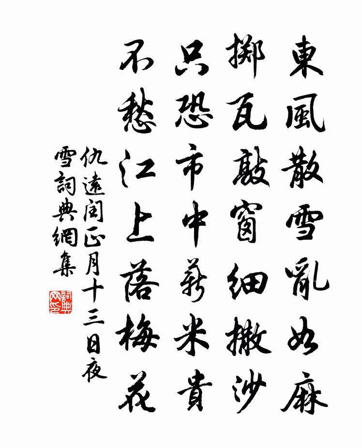 詩詞名句歷史字典書法欣賞書法字典國語詞典說文解字康熙字典古漢語字典標 題 作 者 詩 句 閏正月十三日夜雪作者:仇遠 朝代:宋代閏正月十三日夜雪原文東風散雪亂如麻,擲瓦敲窗細撒沙。只恐市中薪米貴,不愁江上落梅花。詩詞問答問:閏正月十三日夜雪的作者是誰?答:仇遠問:閏正月十三日夜雪寫於哪個朝代?答:宋代仇遠閏正月十三日夜雪書法欣賞閏正月十三日夜雪書法作品詩詞推薦學錄李詩翁以詩訪予於乳溪之上且求縣學積俸虞儔〔宋代〕二月江南花氣昏,錦囊詩話喜重溫。百篇換去東湖骨,一醉招來北海魂。投老黃塵真左計,半生青眼向誰論。學宮陪戴祖禹泛湖分韻得天字仇遠〔宋代〕冉冉夕陽紅隔雨,悠悠野水碧連天。山分秋色歸紅葉,風約苹香入釣船。鐘鼓園林已如此,衣冠文物故依然。當歌姜池源廟二首鄧肅〔宋代〕樽酒源頭一拜神,麕羊瓮繭便青春。當年旱魃矜余虐,禱去陽侯失舊津。訴衷情(三月八日仲存席上見吳家歌舞)毛滂〔宋代〕花陰柳影映簾櫳。羅幕繡重重。行雲自隨語燕,回雪趁驚鴻。銀字歇,玉杯空。蕙煙中。桃花髻暖,杏葉眉彎,一永遇樂佚名〔宋代〕孤衾不暖,靜聞銀漏,敧枕難穩。細想多情,多才多貌,總是多愁本。而今幽會難成,佳期頓阻,只恁縈方寸。知賀新郎(和劉潛夫韻)陳以莊〔宋代〕曉夢鶯呼起。便安排、詩家廚傳,酒家行李。點檢花邊新雨露,春在萬家生齒。道官似、錦溪清駛。但便有人耕綠偈頌九十三首釋梵琮〔宋代〕月不過五,今日親到。知時識節,隨宜愛道。不說向上宗乘,不拋東山暗號。露柱與燈籠,撞著呵呵笑,韓信放鐵送李校書赴吉期賈島〔唐代〕筮算重重吉,良期詎可遷。不同牛女夜,是配鳳凰年。佩玉春風裡,題章蠟燭前。詩書與箴訓,夫哲又妻賢。封泰山樂章。舒和佚名〔唐代〕六鍾翕協六變成,八佾倘佯八風生。樂九韶兮人神感,美七德兮天地清。溪庵放言十首劉克莊〔宋代〕客子相過有攜,先生爛醉如泥。暮年尚可三爵,他日不煩只雞。上忠齋丞相柴望〔宋代〕九陌紅塵撲帽紗,囊書幾度進官家。近來不甚知時事,只是栽桑不種花。賀宋嗣宗除岳陽守五絕史堯弼〔宋代〕不樂還思上岳陽,江湖回首路茫茫。欲生兩翮從公去,濯足波濤望八荒。十七夜玩月李洪〔宋代〕宿昔妖蟆磔,仍圓顧兔靈。桂華滋白露,輪玉碾青冥。倦翼翻烏鵲,愁腸念鶺鴒。獨謠成短韻,酸楚不堪聽。出城王安石〔宋代〕慣作野人多野興,欲為時用少時材。出城偶與沙塵背,轉覺溪山入眼來。周祀五帝歌 皇夏庾信〔南北朝〕惟令之月。惟嘉之辰。司壇宿設。常史誠陳。敢用明禮。言功上神。鉤陳旦辟。閶闔朝分。旒垂象冕。樂奏山雲。古遊俠呈軍中諸將(一作遊俠篇)崔顥〔唐代〕少年負膽氣,好勇復知機。仗劍出門去,孤城逢合圍。 * 遼水上,走馬漁陽歸。錯落金鎖甲,蒙茸貂鼠衣。還家祭見首座釋善珍〔宋代〕佛法下衰,眾魔崢嶸。如虎而祴,白晝市行。晚交得君,如黃河清。君與予談,洞見底里。予建一事,君曰可紀。早朝孫銳〔宋代〕燭光劍佩擁千官,載月臨軒拜紫鑾。仙掌禁寒承露穩,天顏霽曉傍雲看。朝陽鳴鳳諧宮律,滄海□鰲獻羽翰。咫尺次韻觀弟避難陳著〔宋代〕北風行黑殺,東南天柱折。忠臣鋸解頭,文士刀抉舌。我亦走危途,腥埃蒙面鐵。攀緣極稜層,雙跟迸皴血。山人上巳游顯親寺題其壁方岳〔宋代〕松房小小雨留客,竹逕深深鳥喚人。燦醉不知三月暮,等閒又是一年春。名句推薦獨自淒涼還自遣,自製離愁。龔自珍《浪淘沙·寫夢》 白雲映水搖空城,白露垂珠滴秋月。李白《金陵城西樓月下吟》 勝概日相與,思君心鬱陶。岑參《鞏北秋興寄崔明允》 竹外一枝斜,想佳人,天寒日暮。曹組《驀山溪·梅》 假金方用真金鍍,若是真金不鍍金。李紳《答章孝標》 野幕敞瓊筵,羌戎賀勞旋。盧綸《和張僕射塞下曲·其四》 筆落驚風雨,詩成泣鬼神杜甫《寄李十二白二十韻》 山泉散漫繞階流,萬樹桃花映小樓。元稹《離思五首》 夫禮之初,始諸飲食戴聖《禮記·禮運》 夜覺曉非,今悔昨失顏之推《顏氏家訓·序致篇》