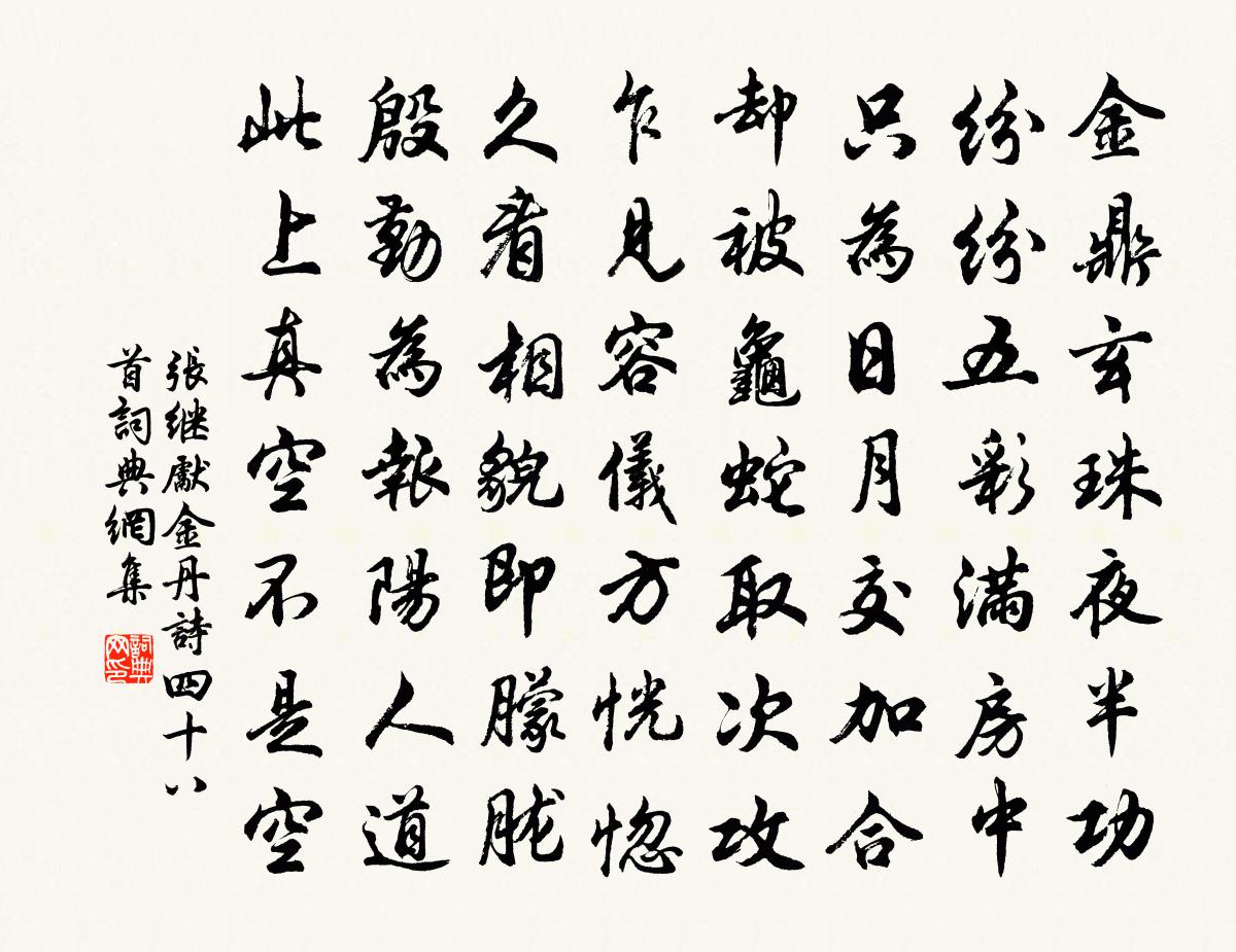 詩詞名句歷史字典書法欣賞書法字典國語詞典說文解字康熙字典古漢語字典標 題 作 者 詩 句 金丹詩四十八首作者:張繼先 朝代:宋代金丹詩四十八首原文金鼎玄珠夜半功,紛紛五彩滿房中。只為日月交加合,卻被龜蛇取次攻。乍見容儀方恍惚,久看相貌即朦朧。殷勤為報陽人道,此上真空不是空。詩詞問答問:金丹詩四十八首的作者是誰?答:張繼先問:金丹詩四十八首寫於哪個朝代?答:宋代張繼先金丹詩四十八首書法欣賞金丹詩四十八首書法作品詩詞推薦水調歌頭 同諸公飲王丈利夫飲山亭,索賦長劉因〔元代〕一諾與金重,一笑對河清。風花不遇真賞,終古未全平。前日青春歸去,今日尊前笑語,春意滿西城。花鳥喜相對送錢文季國博赴召曹彥約〔宋代〕沖暑相迎慰寂寥,忍寒為別助蕭條。笑談但喜頻揮麈,夢想何嘗到續貂,已辨犁鋤供老圃,尚乘軺傳吒公朝。班聯得江西報六言十首劉克莊〔宋代〕師整亦勁敵也,將能彼有人焉。國老可當十萬,兒輩止消八千。詠濯纓亭程珦〔宋代〕西園勝跡名天下,唐相經營用意工。島嶼迴環壓湖面,樓台重複倚雲空。濯纓泉潔存遺蹟。促軫亭空想舊風。公暇秋懷十首趙蕃〔宋代〕我生不敏姿,求友富三益。向來或晨昏,今乃限南北。悠悠江山念,耿耿風雨夕。以我思渠心,渠能不余憶。歸雁亭白玉蟾〔宋代〕嗟予尚未發星星,今日杯茶歸雁亭。幾見霜翎巢白草,數行雲足篆青冥。方將寄字來苕霅,莫便翻身過洞庭。握手寄周計院林景熙〔宋代〕海桑變紛紛,秀色見孤嶼。山林華發尊,黨遂深衣古。獨余鈞天夢,翛然在岩戶。翳翳桂魄秋,沈沈槐夢雨。江濤寒夜吟成彥雄〔唐代〕洞房脈脈寒宵永,燭影香消金鳳冷。猧兒睡魘喚不醒,滿窗撲落銀蟾影。摸魚兒(和韻)劉辰翁〔宋代〕道醉鄉、無邊無岸,一尊到彼殊徑。是間轉海人知處,尺地不教渠剩。尊亦癭。問一斗消酲,一石猶難信。臨風小雪劉克莊〔宋代〕衰桐無葉報蕭颼,臥聽窗聲作許愁。檠暗冷光侵硯幾,瓦疏飛片落香篝。病思結客游梁苑,狂愛提軍人蔡州。也欲送鄞宰王殿丞梅堯臣〔宋代〕君行問埼鮚,殊物可講解。一寸明月腹,中有小碧蟹。生意各臑臑,黔角容夬夬。願言寬賦刑,越俗久疲憊。凌霄花為復上人作趙汝回〔宋代〕裊裊枯藤淡絳葩,夤緣直上照殘霞。老僧不作依棲想,將謂青松自有花。官況祖無擇〔宋代〕物態無端固盡諳,自為俗吏欠清談。豈憂官況全蕭索,祗畏人言足二三。玉勒已辜尋曉陌,錦鱗猶憶釣秋潭。公餘轎中假寐李曾伯〔宋代〕孤枕欠曉夢,短輿償午眠。籃搖小兒臥,龕定老僧禪。少瞑溪山眼,良勞僕從肩。醒來斜日暮,亟喚玉驄鞭。漫興 十四王冕〔元代〕深秋天氣好,且喜病魔消。對客論三史,令人愧六朝。山河空板蕩,民物競蕭條。白首思無策,甘心學野樵。二郎神(次方時父送春)趙以夫〔宋代〕一江淥淨,算閱盡、燕鴻來去。便系日繩長,修蟾斧妙,教駐韶華未許。白白紅紅多多態,問底事、東皇無語。但寄題夏椿年賞桂樓曾豐〔宋代〕廣寒韻度中央質,故侍仙娥新見黜。高天委氣得金行,平地披身成玉立。月下風前為誰香,諸郎一詠翁一觴。功成伏讀時中胡公暮志輒用澹庵省齋銘詩之韻從仲趙蕃〔宋代〕千年廉藺凜猶寒,豈似乞人夸豆簞。經病漢儒顓學癖,義求秦火未燒殘。名章可愧功言立,門名在君兄弟難。至寶念奴嬌(和臞山用槐城韻見壽)劉辰翁〔宋代〕滄洲一葉,待借君、回我爐亭春意。突兀靈光無立壁,八面江風寒齒。鄉屐廊深,籠門檻赤,數月才幾。千年未論過賈浪仙崔秀才故祠李新〔宋代〕倦飛好鳥下荒陂,不見騎驢主簿歸。林杳笛寒聲愈細,為尋牛背一簑衣。名句推薦才過斜陽,又是黃昏雨。晏幾道《蝶戀花·笑艷秋蓮生綠浦》 教人怎不傷情。覺幾度、魂飛夢驚。劉過《柳梢青·送盧梅坡》 遠看山有色,近聽水無聲王維《畫》 仁則榮,不仁則辱。今惡辱而居不仁,是猶惡濕而居下也。孟子《孟子·公孫丑章句上·第四節》 靡靡秋已夕,淒淒風露交。陶淵明《己酉歲九月九日》 樹挪死,人挪活。佚名《增廣賢文·下集》 青山隱隱水迢迢,秋盡江南草未凋。杜牧《寄揚州韓綽判官》 今夫飛蓬遇飄風而行千里,乘風之勢也。商鞅《商君書·禁使》 林鶯啼到無聲處,青草池塘獨聽蛙。曹豳《春暮·門外無人問落花》 夢裡相思,故國王孫路。陳子龍《點絳唇·春日風雨有感》