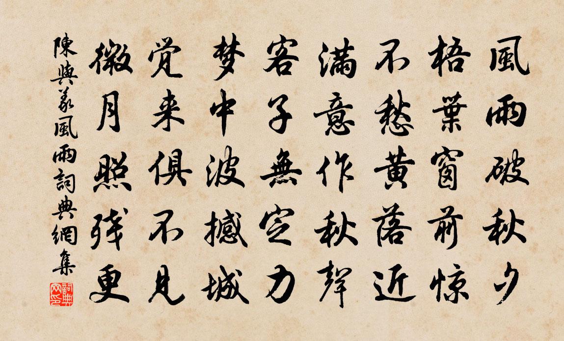 詩詞名句歷史字典書法欣賞書法字典國語詞典說文解字康熙字典古漢語字典標 題 作 者 詩 句 風雨作者:陳與義 朝代:宋代風雨原文風雨破秋夕,梧葉窗前驚。不愁黃落近,滿意作秋聲。客子無定力,夢中波撼城。覺來俱不見,微月照殘更。詩詞問答問:風雨的作者是誰?答:陳與義問:風雨寫於哪個朝代?答:宋代問:陳與義的名句有哪些?答:陳與義名句大全陳與義風雨書法欣賞風雨書法作品詩詞推薦和顏長官百詠朱門朱繼芳〔宋代〕晉代豪華不數家,萬錢下箸未為奢。客來只是家常飯,豆粥萍虀費咄嗟。奉和詠舞詩徐陵〔南北朝〕十五屬平陽。因來入建章。主家能教舞。城中巧畫妝。低鬟向綺席。舉袖拂花黃。燭送空回影。衫傳篋里香。當由髮長平張耒〔宋代〕歸牛川上渡,去翼望中迷。野水侵官道,春蕪沒斷堤。川平雙槳上,天闊一帆西。無酒消羇恨,詩成獨自題。和吳秀才二絕王炎〔宋代〕句法洪徐可逼真,摩挲老眼見斯人。憐渠袖有釣鰲手,要試虹竿欠李紳。追和隱淵明詠貧士趙處澹〔宋代〕嗟予薄羅衲,孑孑將疇依。晨炊井已凍,夜鑿鄰無輝。蒼苔鳥跡絕,臥看孤雲飛。老力出市米,溪寒莫忘歸。纖纖別慧山書堂佚名〔唐代〕捲簾曉望雲平檻,下榻宵吟月半窗。病守未能依結社,更施何術去為邦。八哀詩贈太子太師汝陽郡王璡杜甫〔唐代〕汝陽讓帝子,眉宇真天人。虬須似太宗,色映塞外春。往者開元中,主恩視遇頻。出入獨非時,禮異見群臣。愛其夢尋梅方岳〔宋代〕野徑深藏隱者家,岸沙分路帶溪斜。馬蹄殘雪六千里,山嘴有梅三四花。黃葉擁籬埋藥草,青燈煨芋話桑麻。一生宮祠滿秩曾幾〔宋代〕雲水天台郡,祠庭我所監。幾年真傲吏,今日是前銜。祿米誰周急,園蔬不療饞。上書端未免,定不達空函。宮詞楊皇后〔宋代〕迎春燕子尾纖纖,拂柳穿花掠翠簾。開道蕊官三十六,美人爭為卷珠簾。謝趙宰拜襄敏墓並留題二首王阮〔宋代〕河湟人去鎖春蕪,三步遙勤一束芻。盛事發揮千古烈,英詞噓動百年枯。故家零落今朝遇,此段孤高近世無。地下過嵩陰隱者李頻〔唐代〕當門看少室,倚杖復披衣。每日醒還醉,無人是與非。架書抽讀亂,庭果摘嘗稀。獨有江南客,思家未得歸。失調名吳德遠〔宋代〕過平康巷陌綺羅叢。贏得佳人,妙舞艷歌,爭勸金鍾。偈頌一百三十六首釋惟一〔宋代〕偏中正,正中偏。正偏不及處,別是一壺天。水澄澄,風細細,雲澹澹,月娟娟。金針兮纖纖,玉線兮綿綿。以此寄中遠越州旅舍兼簡宋倅晁說之〔宋代〕自言無悶於茲久,何事今朝嘆息頻。同病願逢閒話客,異鄉難得借書人。獨尋剡縣溪山去,厭見揚州花木新。茶寄禪人並化主寫真求贊釋正覺〔宋代〕雲水之身,叢林之人。眉毛長蓋眼,鼻孔直欺唇。等閒西院兩聲錯,急快雲門一路親。不肯割城還奪璧,相如肝膽次史髯韻二首陳造〔宋代〕已誤西湖鷗鷺約,客舟西上更徘徊。故人益嘆天涯遠,懷抱何從得好開。病中聞伯量相訪寄之二首裘萬頃〔宋代〕高人在城郭,應酬頗紛如。憶我煙霞枉,遺我一紙書。雨余窗戶涼,蛩聲滿階除。相過有成言,何時命巾車。雨中過幽居寺李洪〔宋代〕柳眼青蔥桃萼紅,東皇試手放春功。峰巒矗矗孤雲聳,潤壑涓涓細水通。出谷抗塵身已去,登高能賦思無窮。驅車初入峽有感白居易〔唐代〕上有萬仞山,下有千丈水。蒼蒼兩崖間,闊狹容一葦。瞿唐呀直瀉,灩澦屹中峙。未夜黑岩昏,無風白浪起。大石名句推薦九月寒砧催木葉,十年征戍憶遼陽。沈佺期《古意呈補闕喬知之 / 古意 / 獨不見》 兼聽則明,偏信則暗。司馬光《資治通鑑·唐紀八》 白頭太守真愚甚,滿插茱萸望辟邪。宋祁《九日置酒》 留連戲蝶時時舞,自在嬌鶯恰恰啼。杜甫《江畔獨步尋花·其六》 莫等閒,白了少年頭,空悲切!岳飛《滿江紅·寫懷》 何處營巢夏將半,茅檐煙里語雙雙。杜牧《村舍燕》 想文君望久,倚竹愁生步羅襪。姜夔《八歸·湘中送胡德華》 好夢欲成還又覺,綠窗但覺鶯啼曉。施耐庵《蝶戀花·一別家山音信杳》 華燈縱博,雕鞍馳射,誰記當年豪舉。陸游《鵲橋仙·華燈縱博》 白雁亂飛秋似雪,清露生涼夜。吳西逸《清江引·秋居》